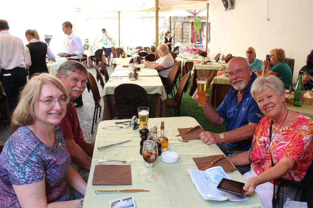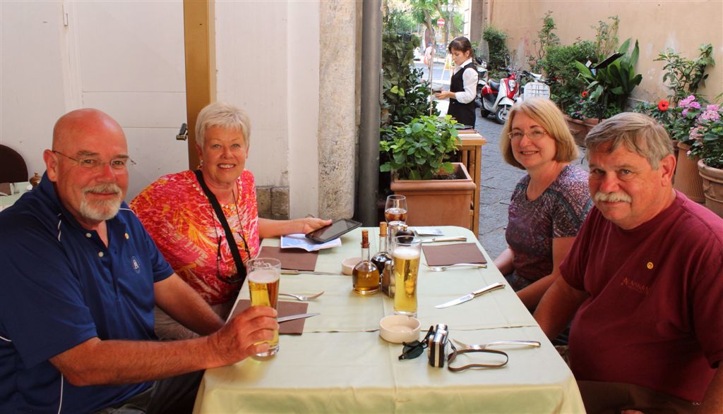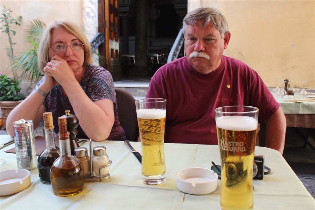 [Thirsty, and excited (?) for lunch, we found a little restaurant down an alley just off the square. 😉 ]