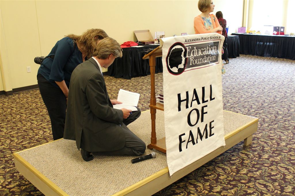 [Jill Johnson, the school’s communications director, and Chad Larson, program emcee, plot strategies.]