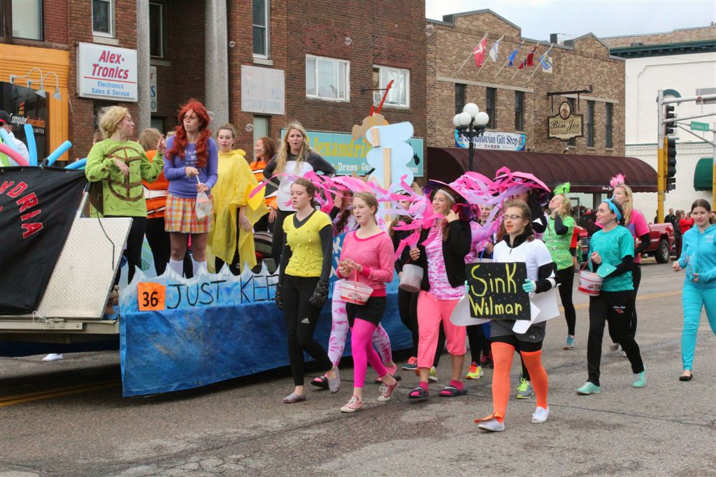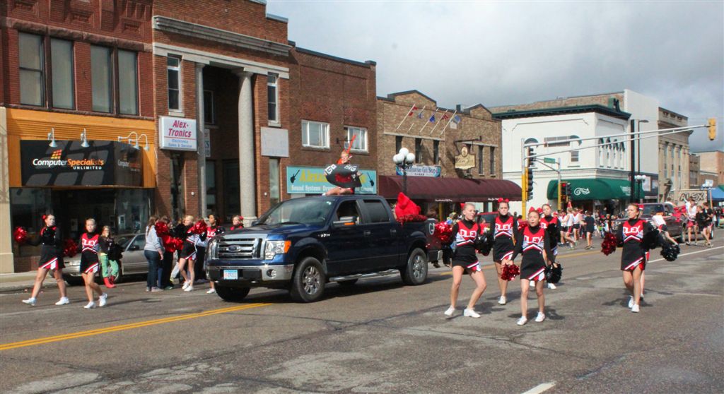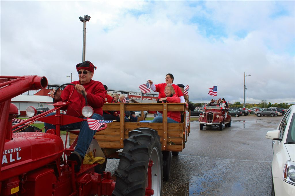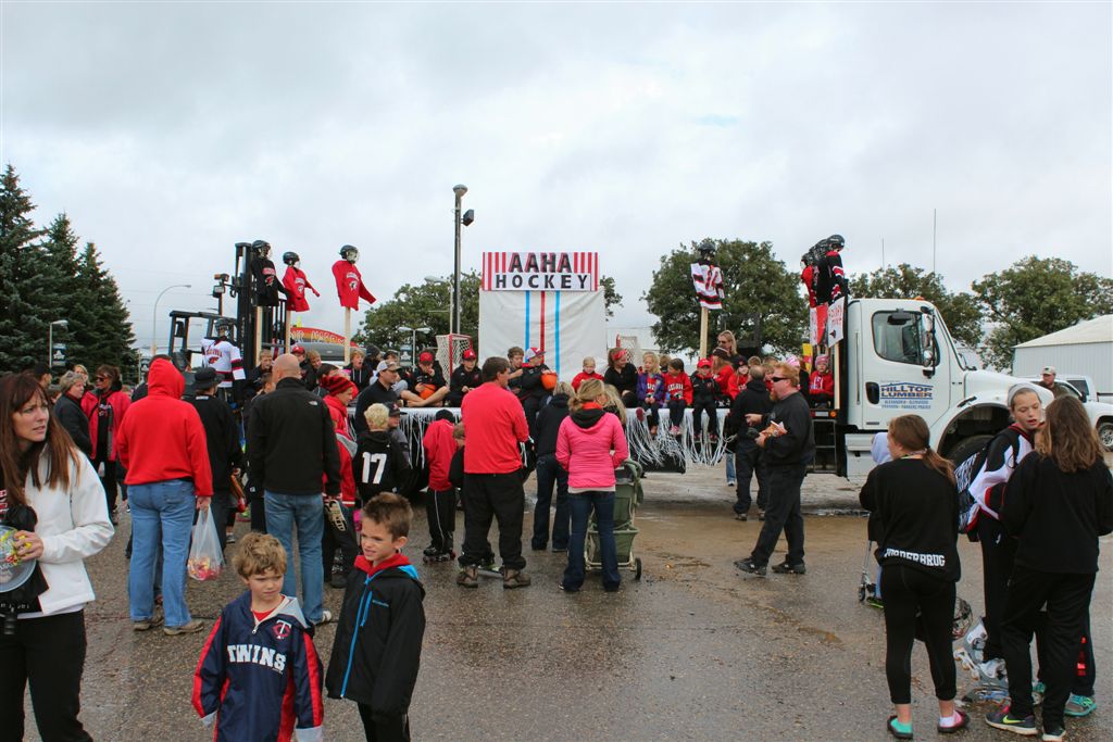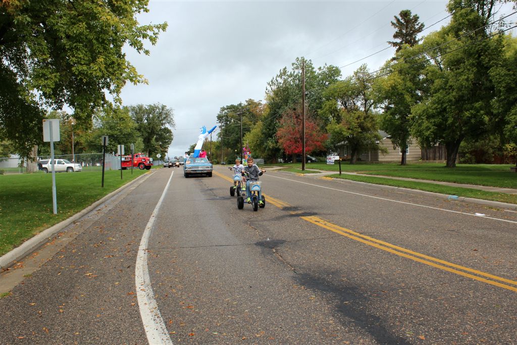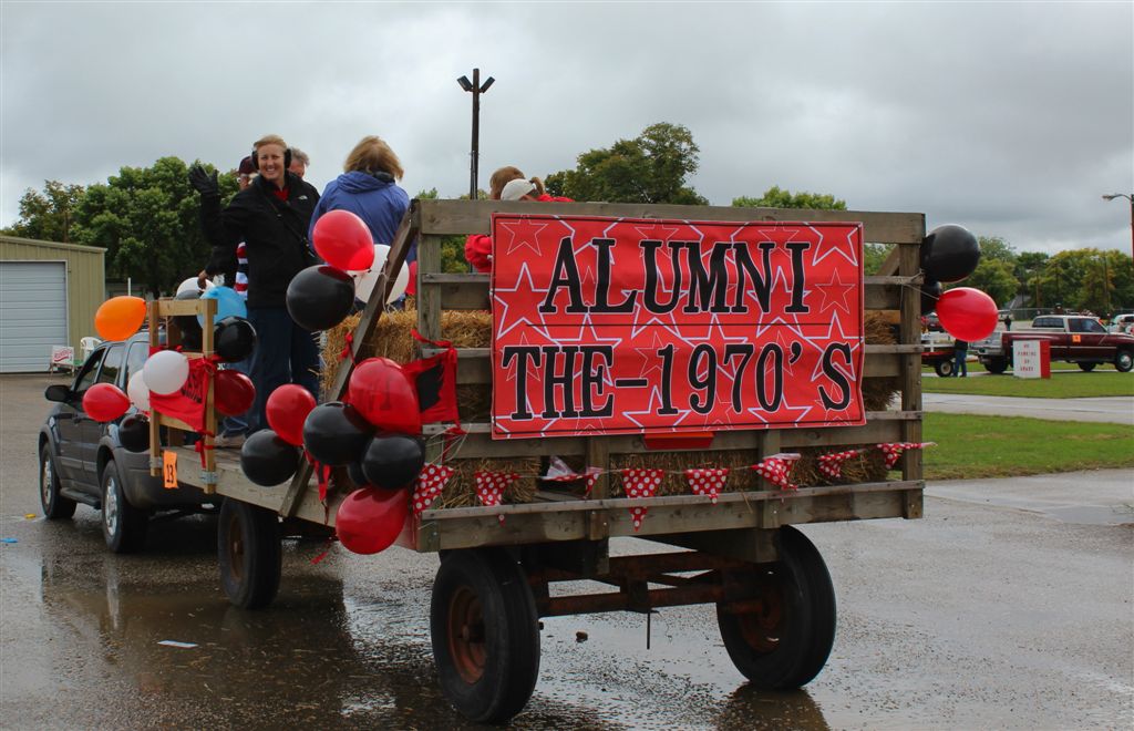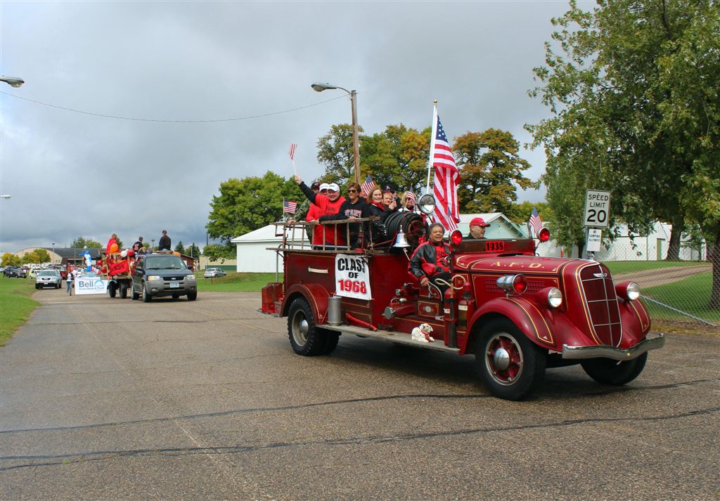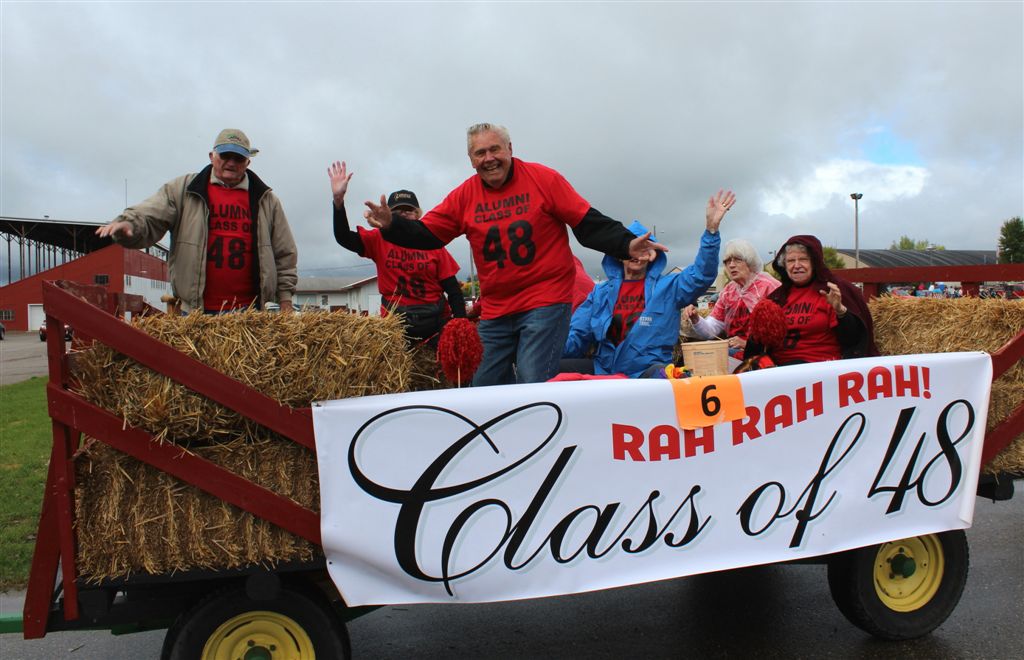 [The weather on Friday had been icky. It rained overnight and well into the morning on Saturday as I contemplated attempts to participate in the homecoming parade at noon. The rain let up about 11:30, the supervisor hied me to the fairgrounds, and I began snapping photos of the assembled mass – once again (as far as I could tell) absent any other members of the class of ’65. These guys graduated the year after I was born and always get a good turnout! 🙂 ]