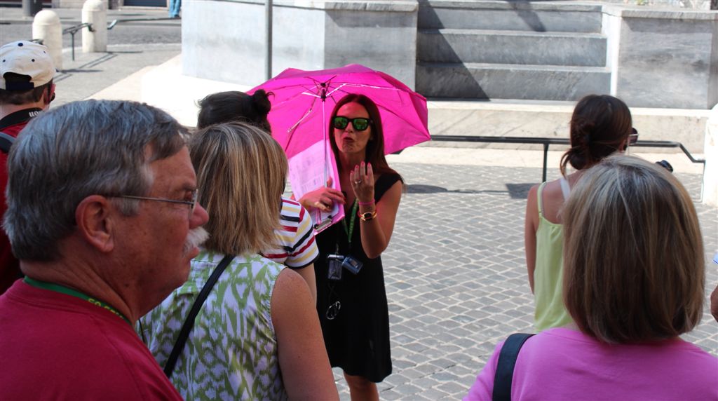 [Sara addresses the troops re the wonders of Spanish Square.]