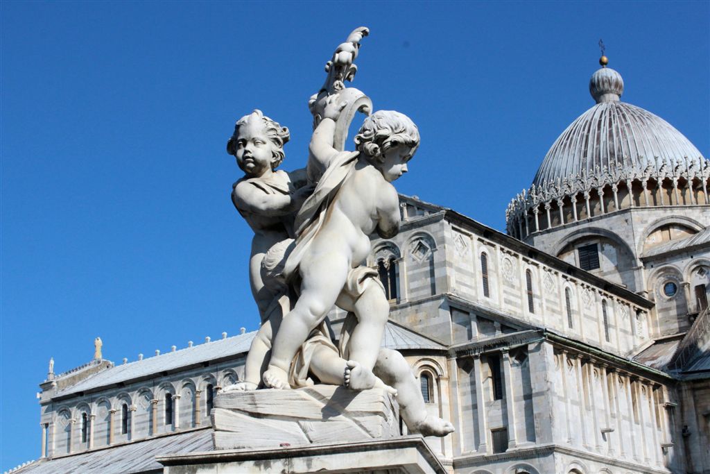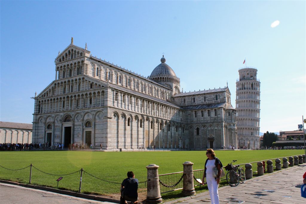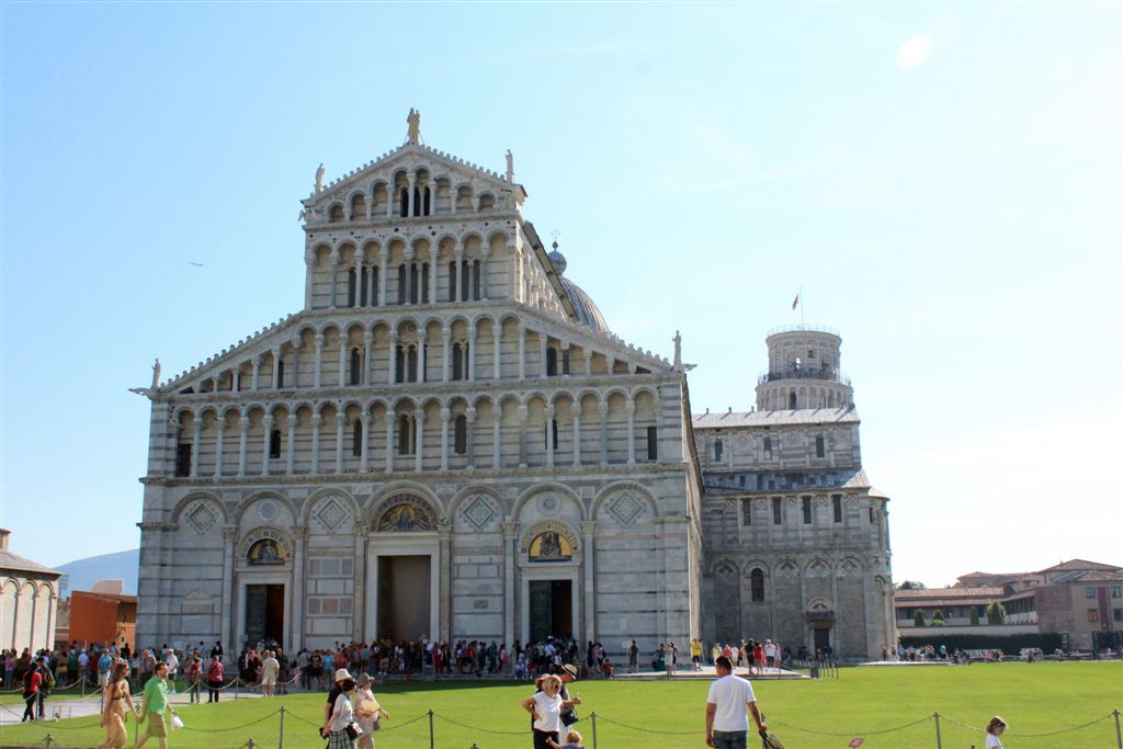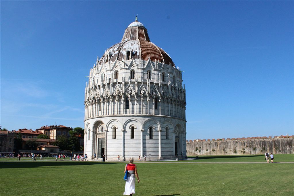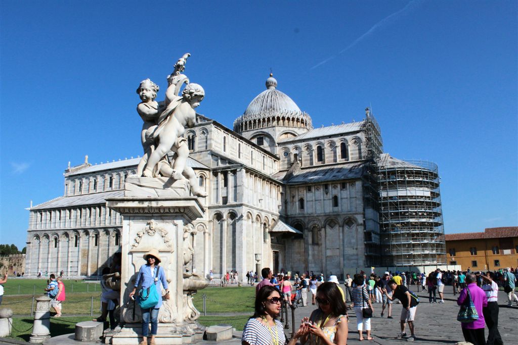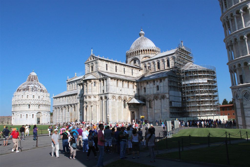 [In Pisa’s Cathedral Square, the first building is the Baptistery, the second is the Duomo (Cathedral), and the third is the Tower (a bell tower). They were constructed mainly over a 100 year period beginning in 11th century.]
