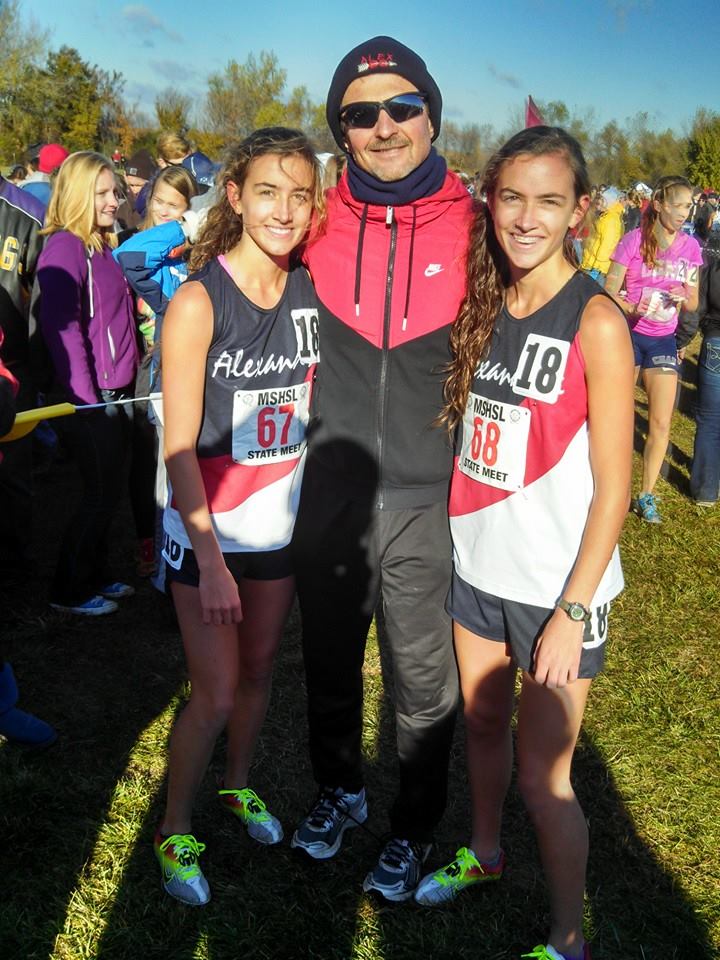 [Attribution: This photo is on loan from Bob Cunniff’s Facebook page. The photo was taken by Doug Hasz. The subjects are Doug’s daughters, Megan (67) and Bethany (68) (and I hope I got that right), and their cross country coach, Mark Nelsen. Bethany had just won the state cross country meet, with Megan finishing second. Certainly the highlight of a terrific fall sports season for Cardinal girls.]