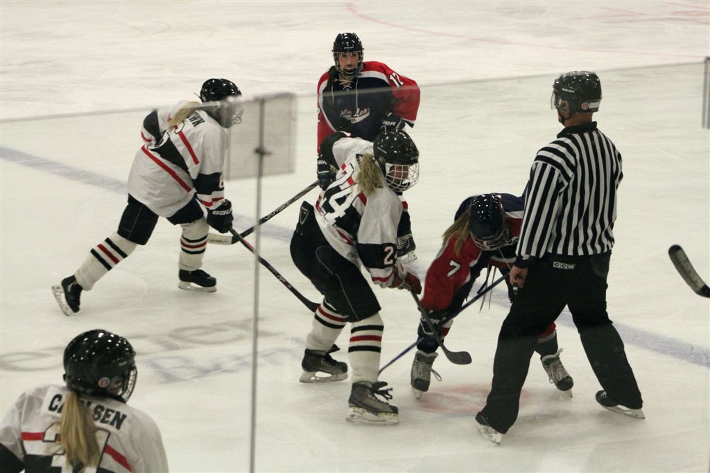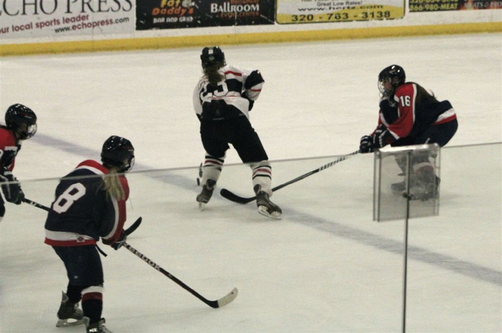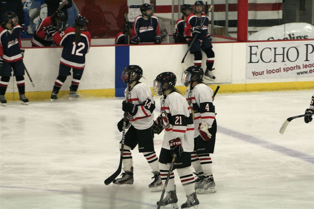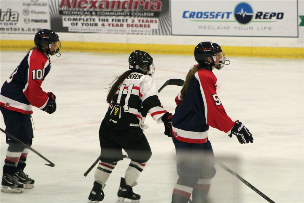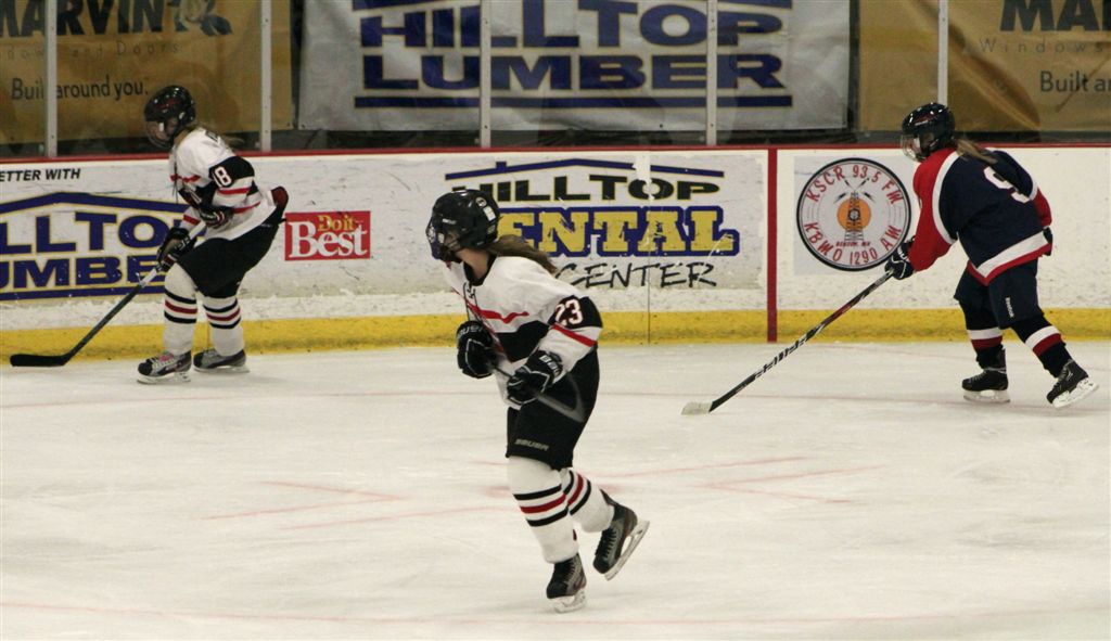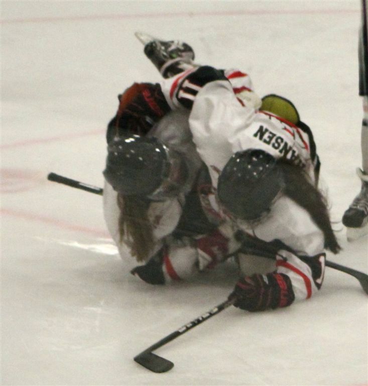 [Senior co-captains Melissa Drown (6) and Taylor Ellingson (24) with sophomore defenseman Karina Carlsen (31). I’m assuming Karina is the younger sister of last year’s senior, Anna, who also wore 31. 🙂 On a team whose strength appears to be on defense (Coach Hovel wants these defensemen to be aggressive offensively), we note that both Melissa and Taylor began their varsity careers on defense and are now expected to be leading scorers as forwards. I recall my youthful brain used to remember who scored every goal, and in what period. Now I can’t. I know in this game Melissa had 3 assists and was named player-of-the-game. I’ll report back later as to who scored all the goals when I get the official game report.]