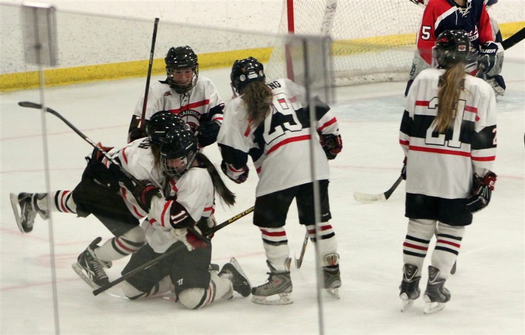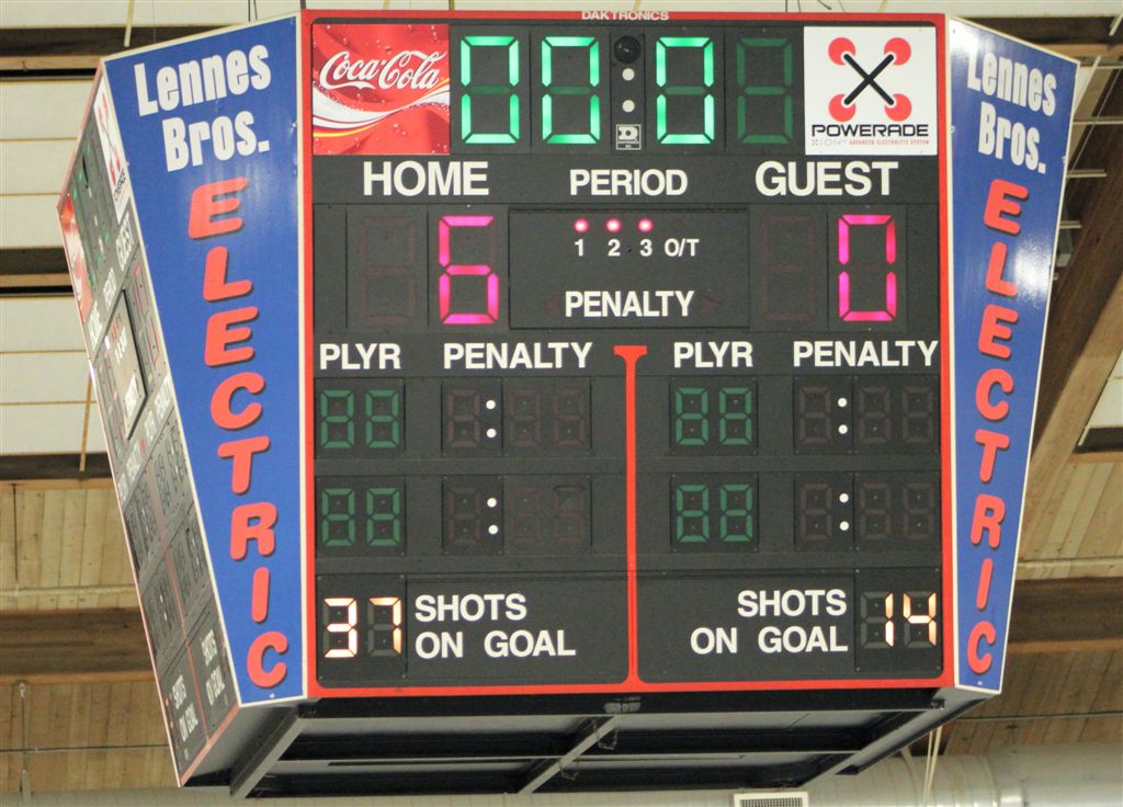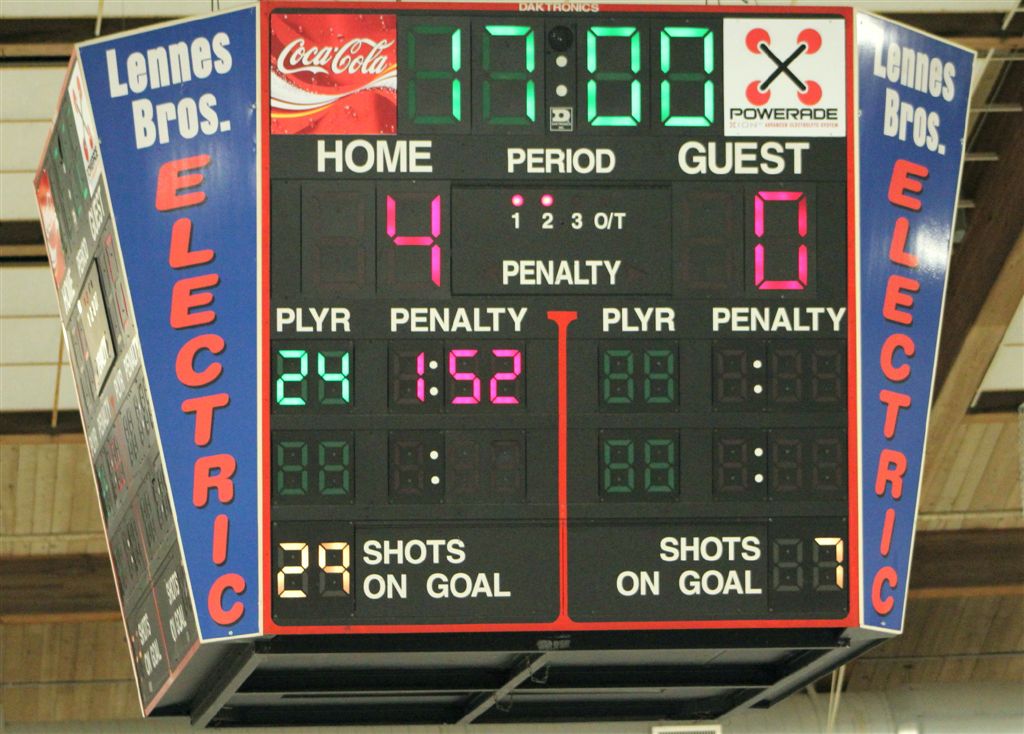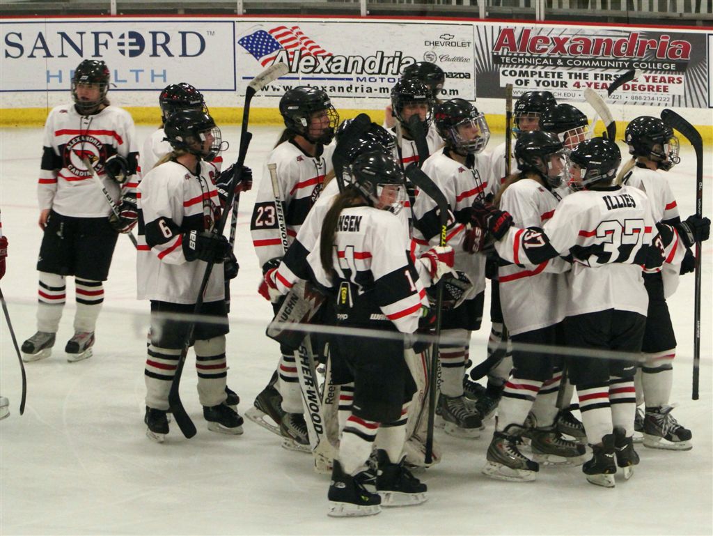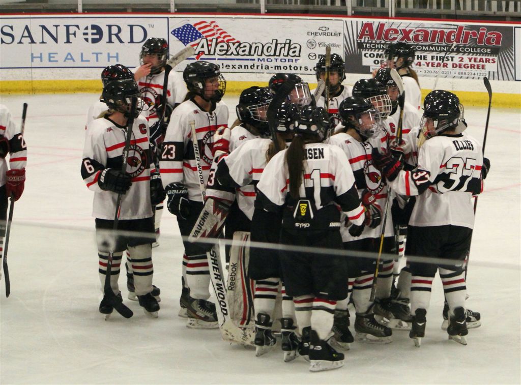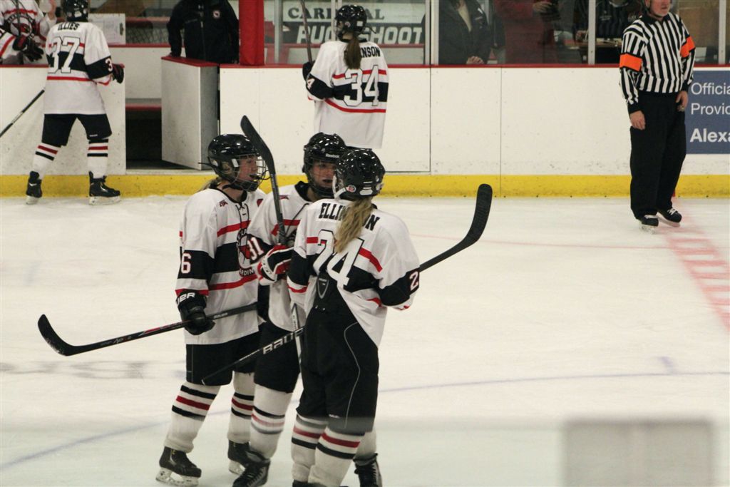 [Senior co-captains Melissa Drown (6) and Taylor Ellingson (24) with sophomore defenseman Karina Carlsen (31). I’m assuming Karina is the younger sister of last year’s senior, Anna, who also wore 31. 🙂 On a team whose strength appears to be on defense (Coach Hovel wants these defensemen to be aggressive offensively), we note that both Melissa and Taylor began their varsity careers on defense and are now expected to be leading scorers as forwards. I recall my youthful brain used to remember who scored every goal, and in what period. Now I can’t. I know in this game Melissa had 3 assists and was named player-of-the-game. I’ll report back later as to who scored all the goals when I get the official game report.]