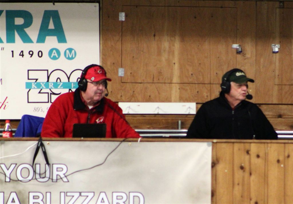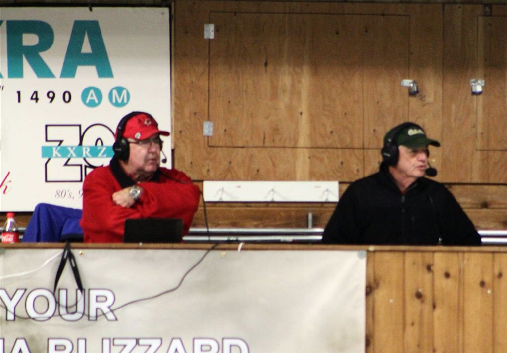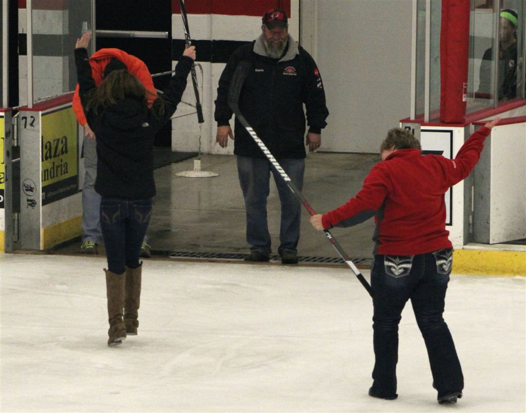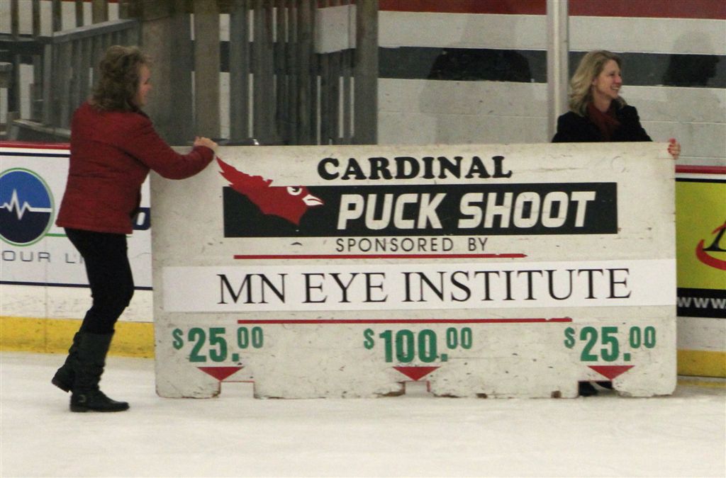 [The puck shoot takes place between periods. After a hockey mom (I believe?) drilled one through a $25.00 hole, Cardinal alum and past goalie, Stephanie Drown (yup, Mel’s older sister) put one cleanly through the $100.00 hole!]