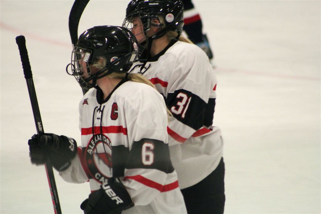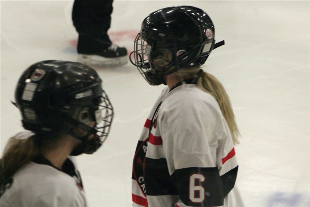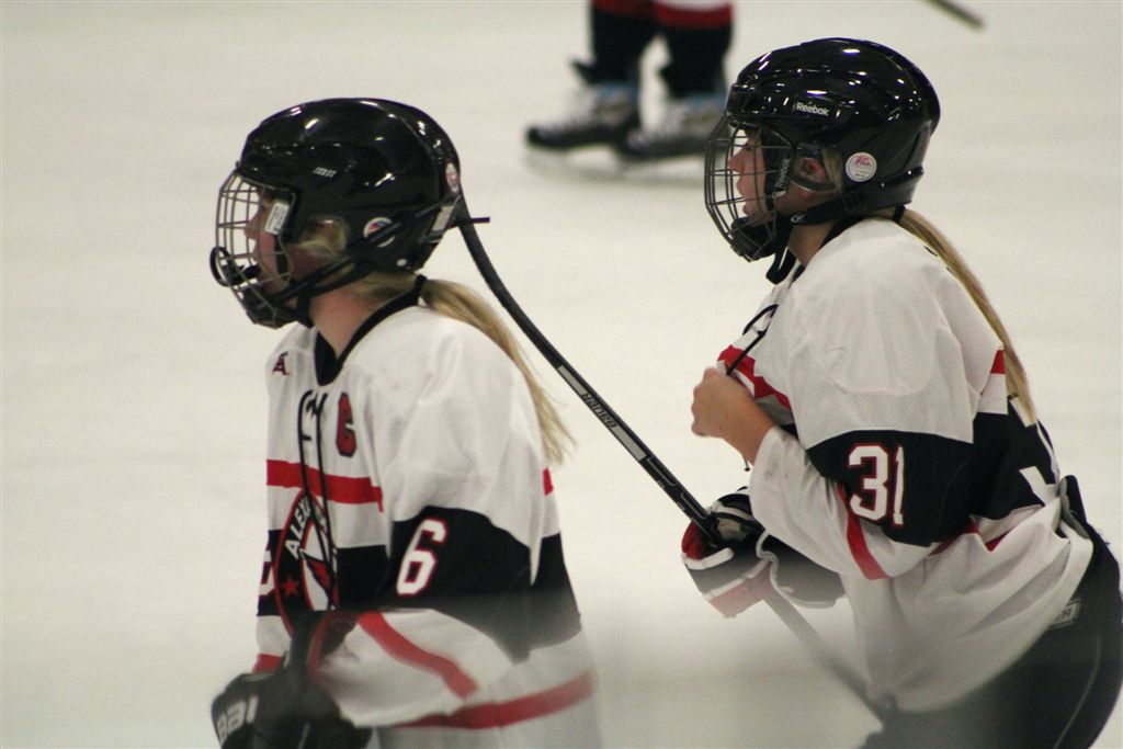 [Nicole and sophomore defenseman Lauren Niska (21).]
