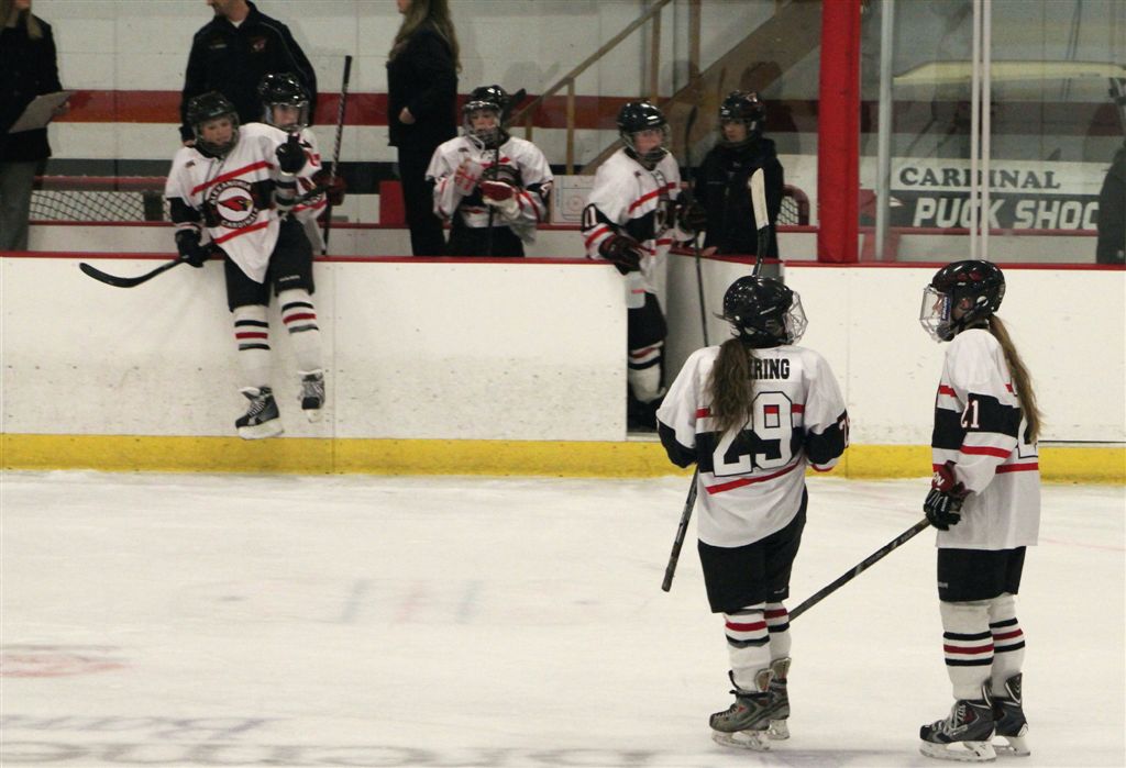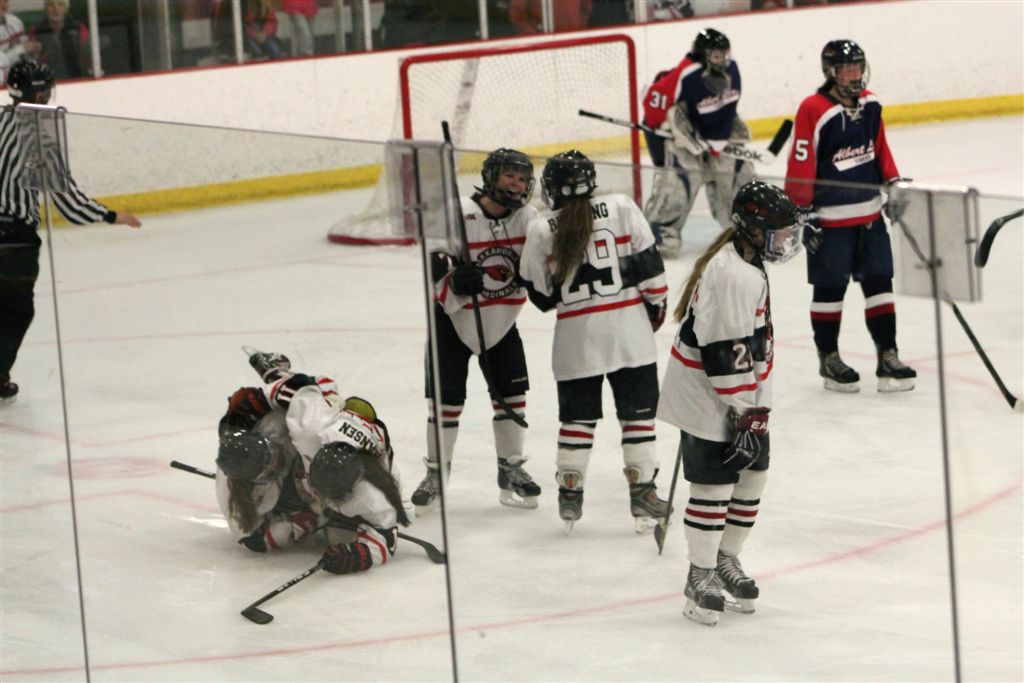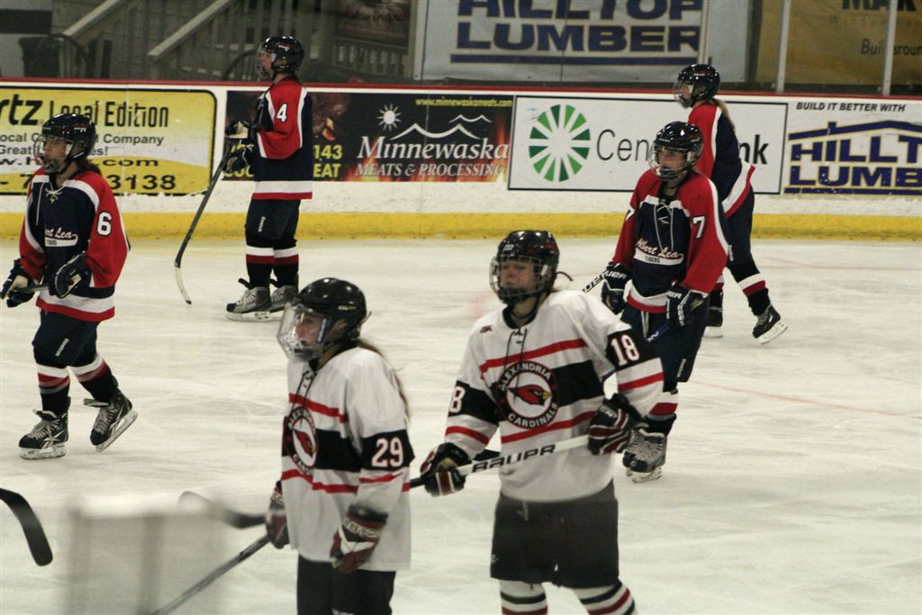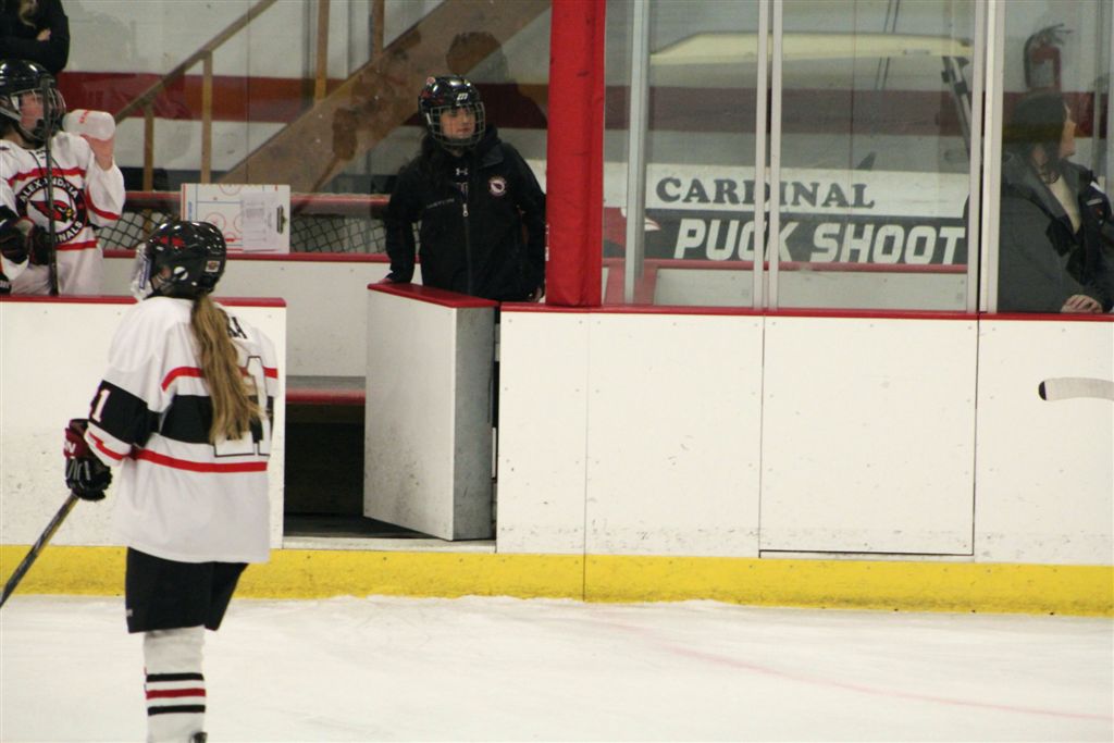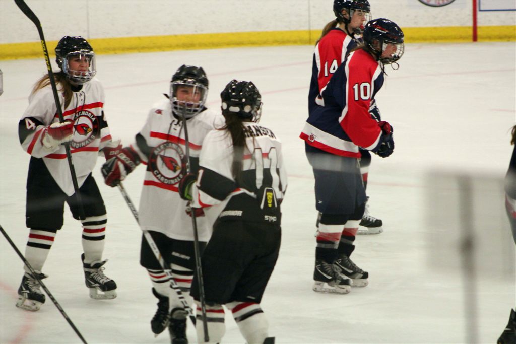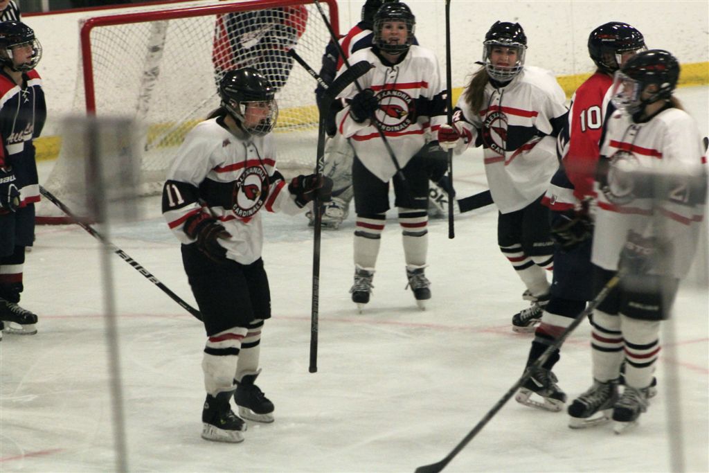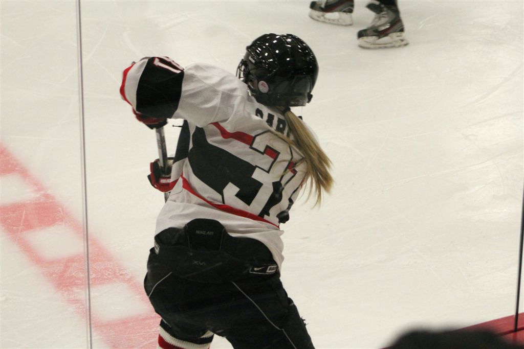 So, now you know. 🙂 Friday was the season opener for the Cardinal girls’ hockey team. We lost six key seniors off last year’s team – and our participation numbers are down. Yet, we enter the new season with optimism about another state tournament run. We had a turnover in the coaching staff. Blair Hovel, who was the assistant coach when we won the state championship in ’08, is back as the head coach. Ashley Secord-Holmes, who was an all-state defenseman on the ’08 team and has graduated from North Dakota where she played D-1 hockey for four years, is now an assistant coach. And when we look back, we started following girls’ hockey in ’03, when Ashley’s class were 8th-graders, and are now beginning our 11th year as Super Fans! And our Fans-ness hasn’t waned.