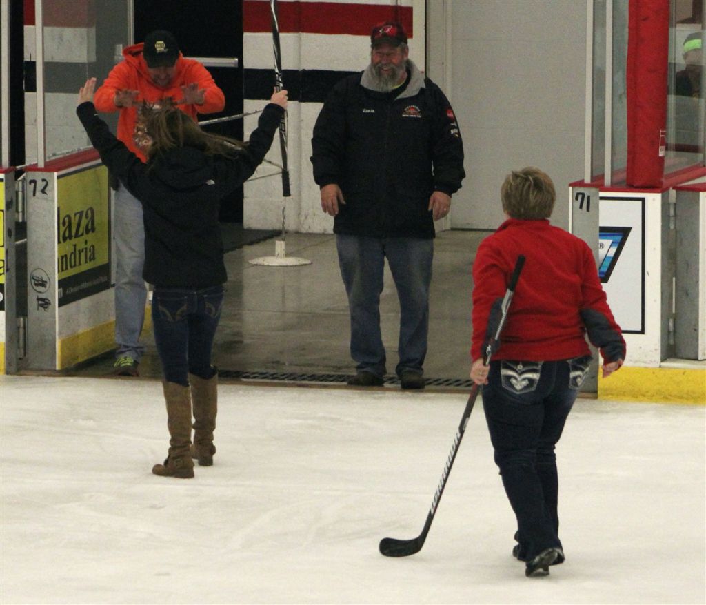 [Maybe she should have been a forward? Rink manager Vinnie (in black) greets her with a smile.]