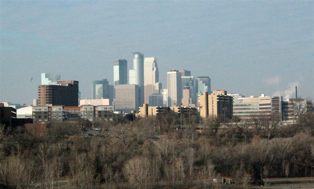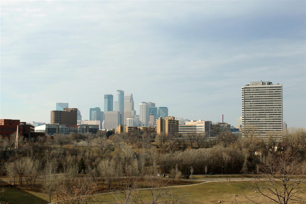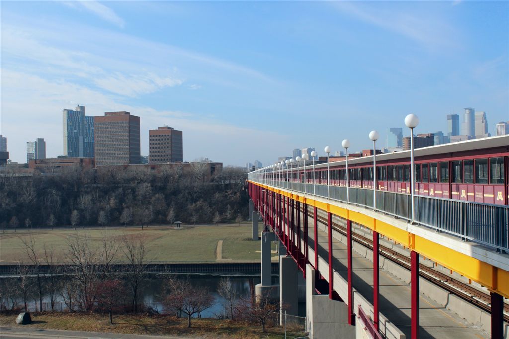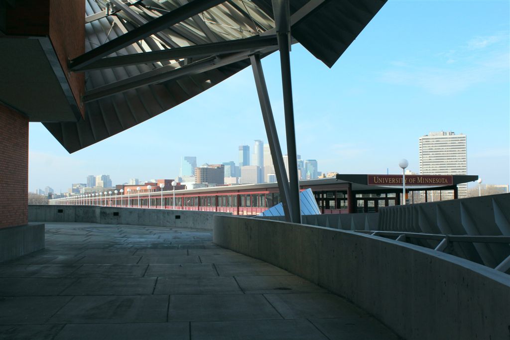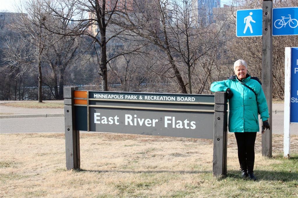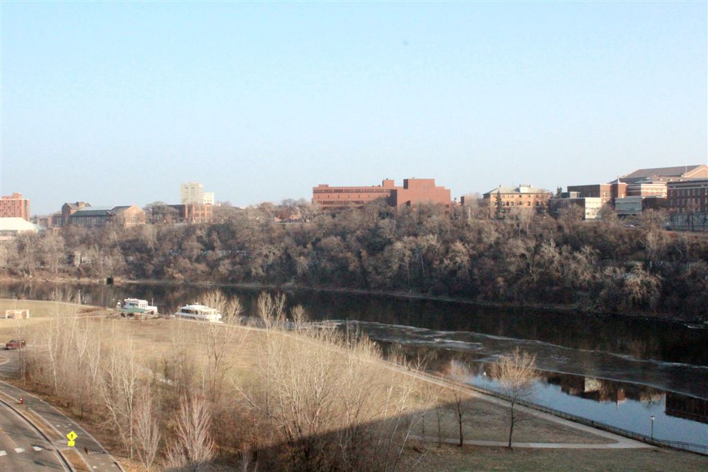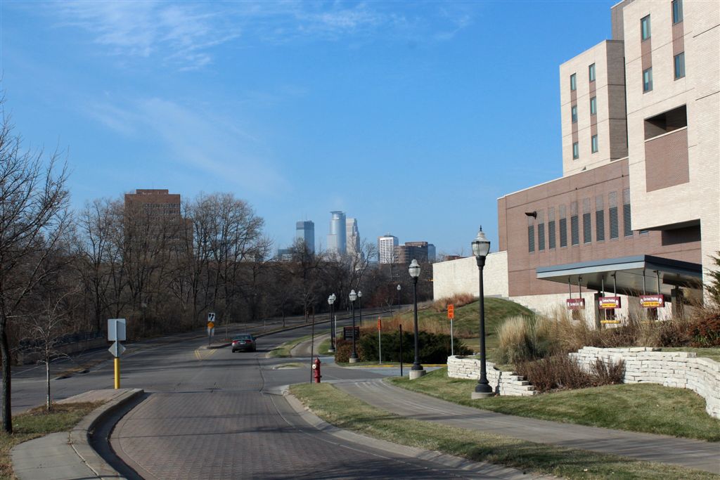 [East River Road . . . we’ll walk up and around to the Weisman Art Museum.]