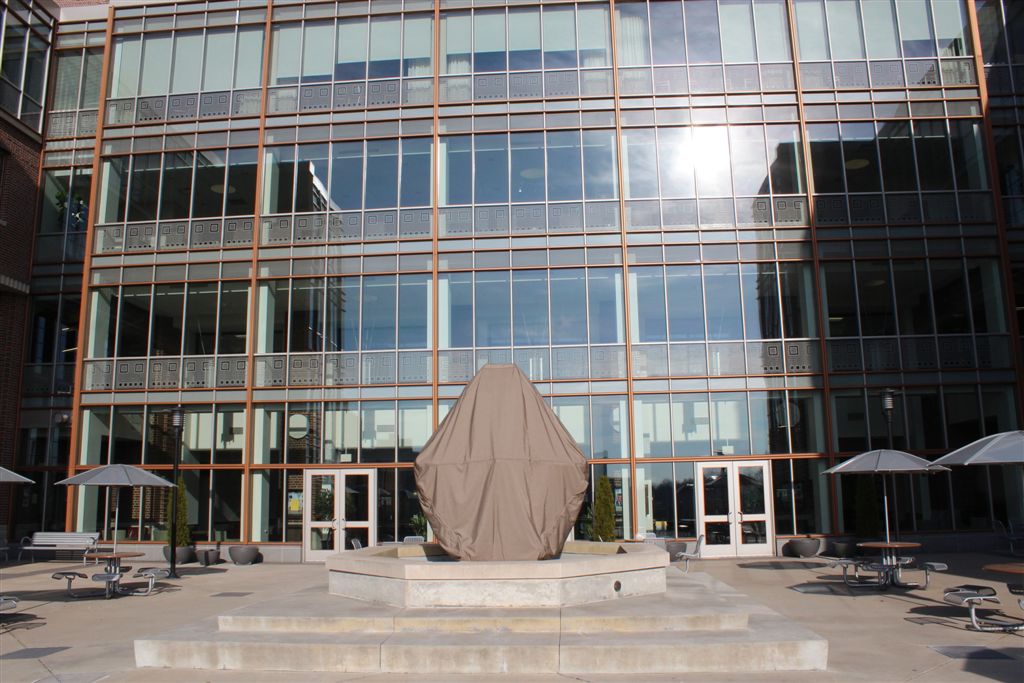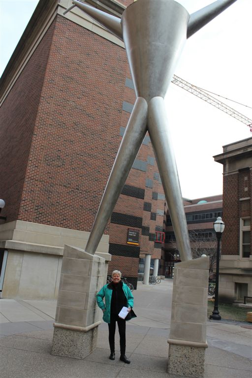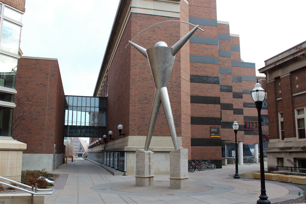 [Platonic Figure by Andrew Leicester amidst the science and engineering buildings.]