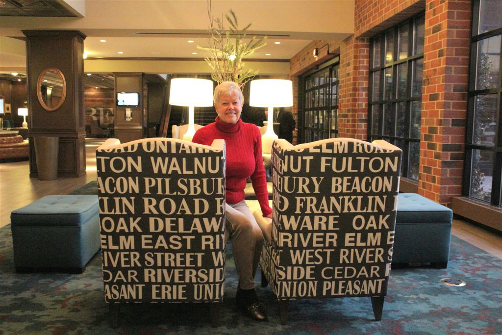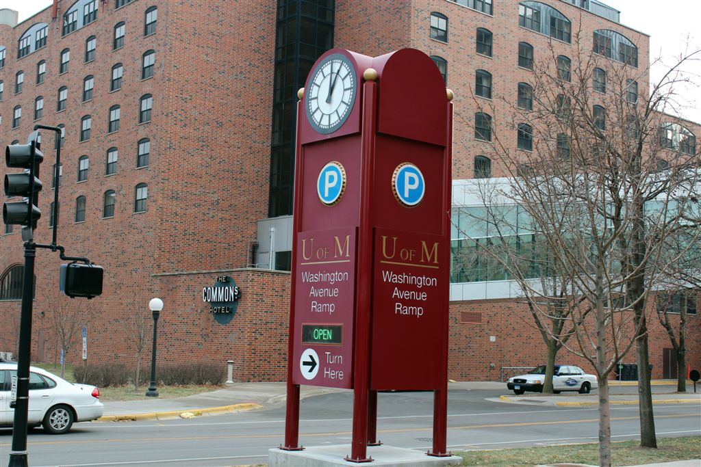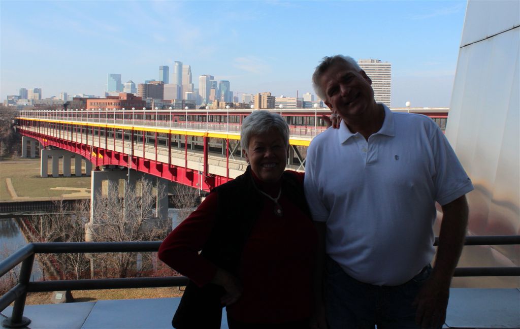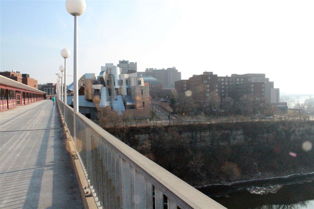 [Sunday morning we noticed (finally?) that the lobby chairs contained the names of the neighboring area streets. 🙂 Then, after breakfast, we decided to take another walk, recalling for some reason we didn’t trundle out on the Washington Avenue bridge for the classic photos of the Weisman? . . .]