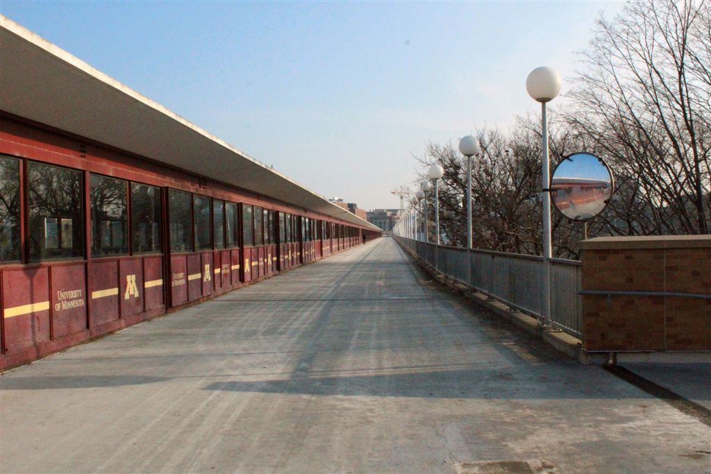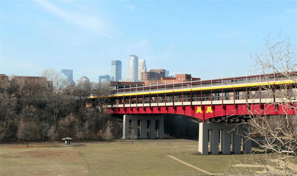 [For students, the famous (or infamous) Washington Avenue bridge, across which we used our university stride to reach classes on the West Bank.]