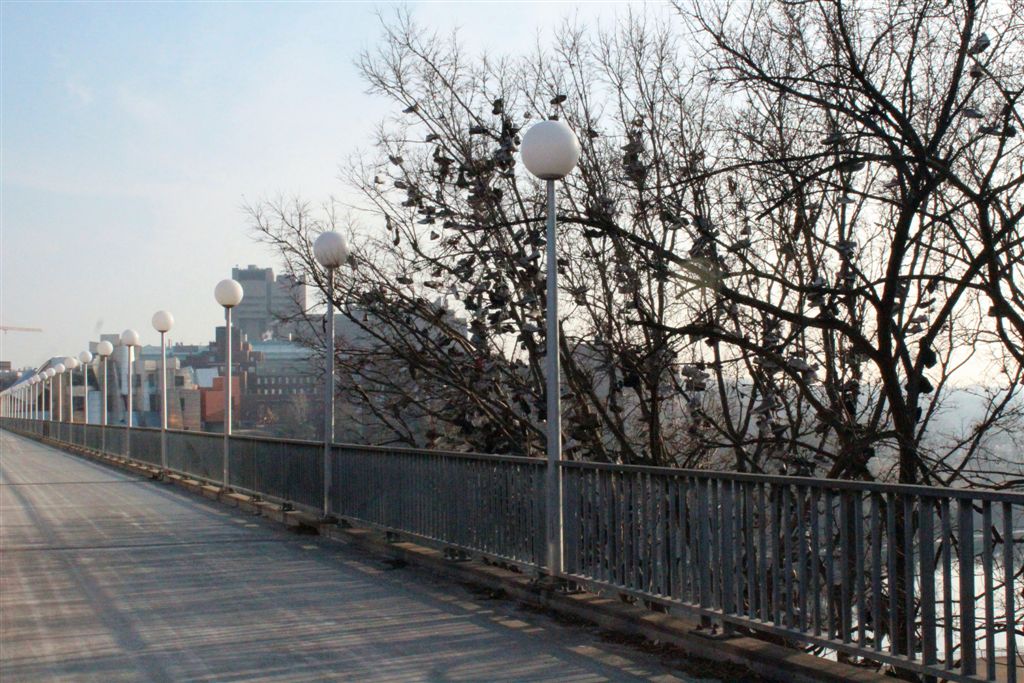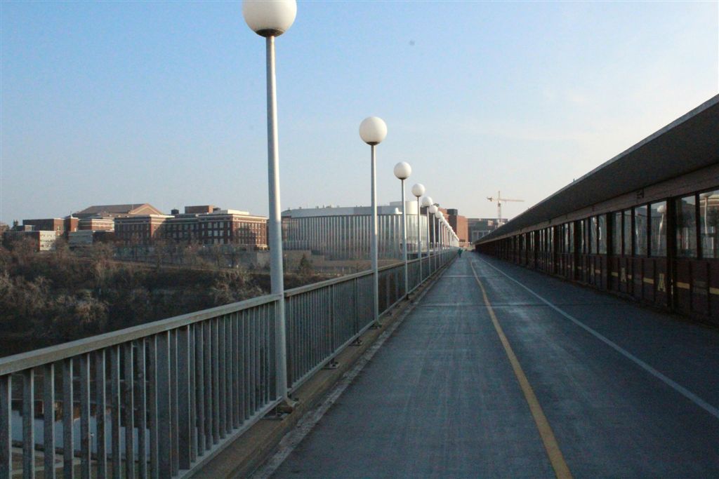 [Initially, there was no covered walkway over the top of the bridge. Uffda, was that cold in the winter!]