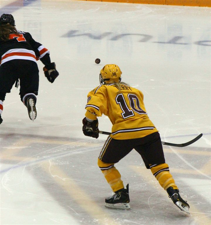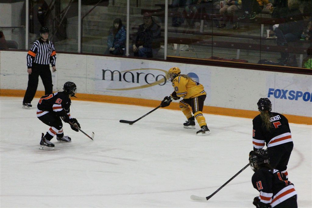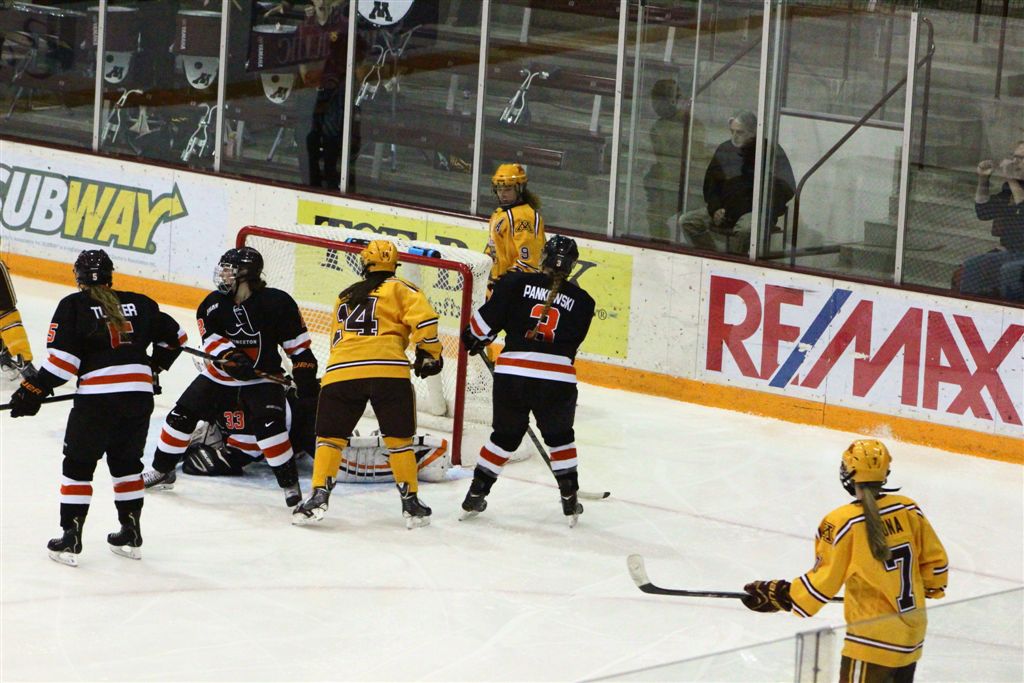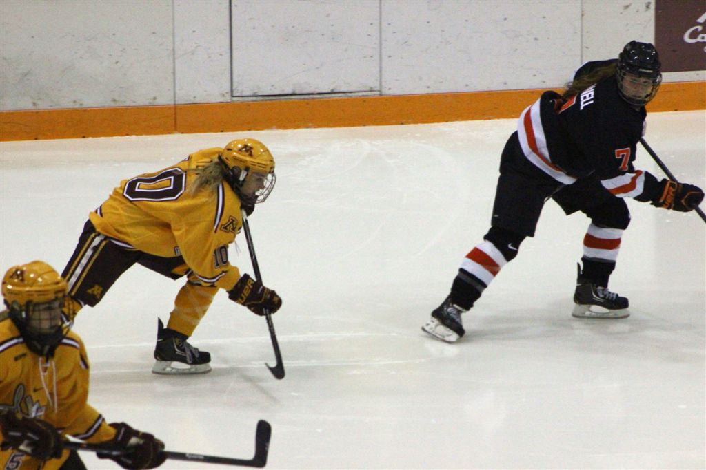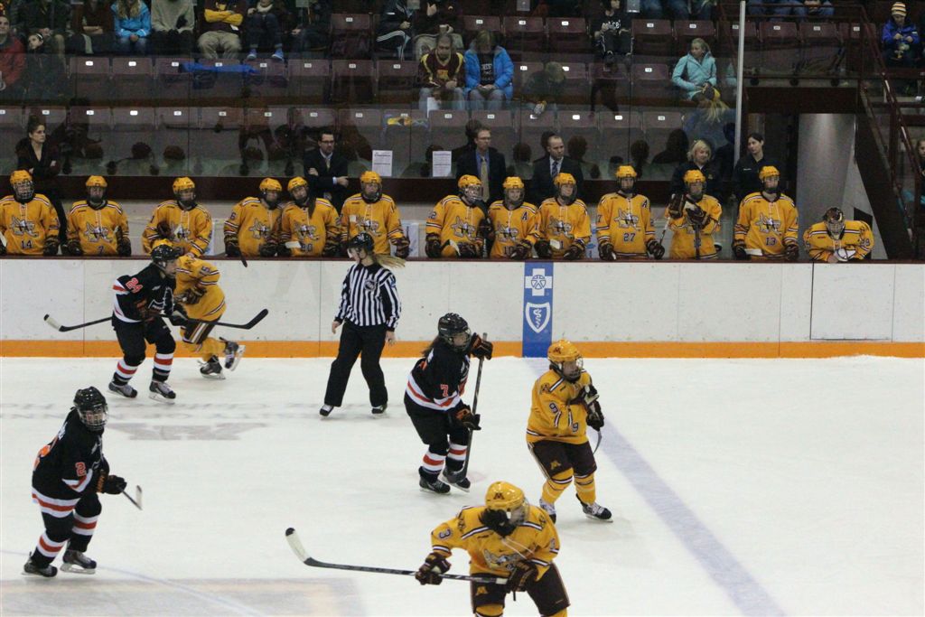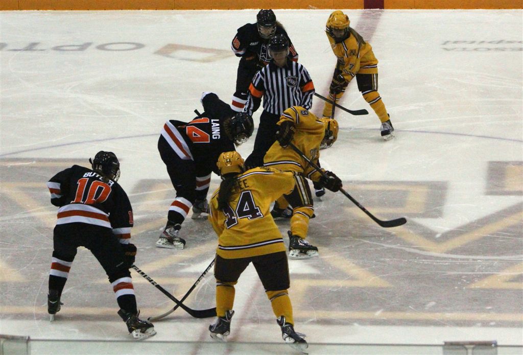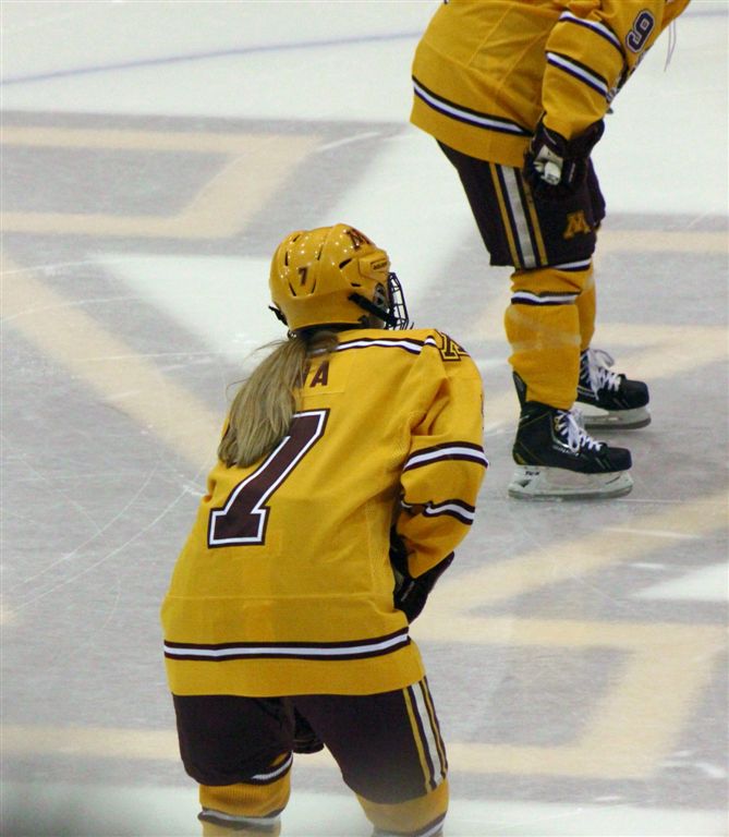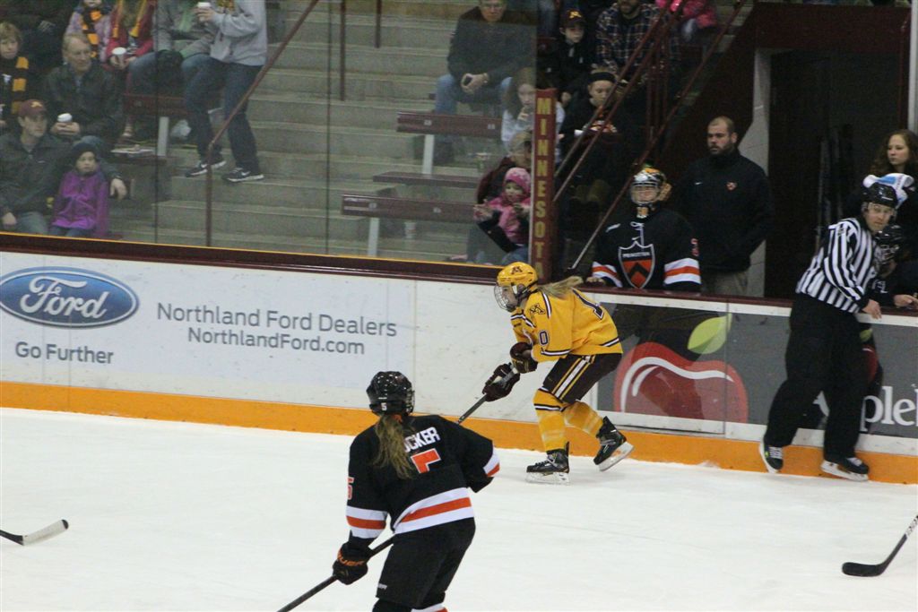 [The end result was a goal by Hannah Brandt (22) about 13 minutes into the period. 10 seconds later, Milica McMillen (13) scored the 4th goal of the period. She received the face-off draw after the Brandt goal at her own blue line, casually skated to the Tigers’ blue line, and then, I think just to get the puck in deep, fired a bullet slapshot from the blue line that whistled over the goalie’s left shoulder and into the net. Then she skated casually back to the bench for a shift change. In the 1st period, the Gophers had an 18 – 1 shots-on-goal advantage. The game was much more evenly played from then on.]