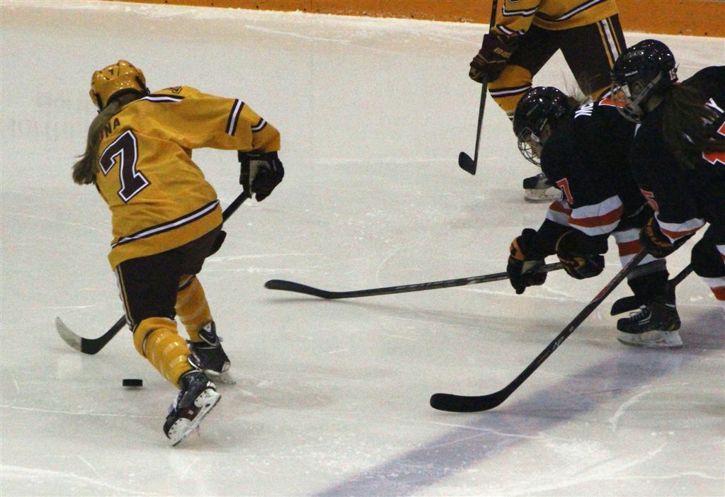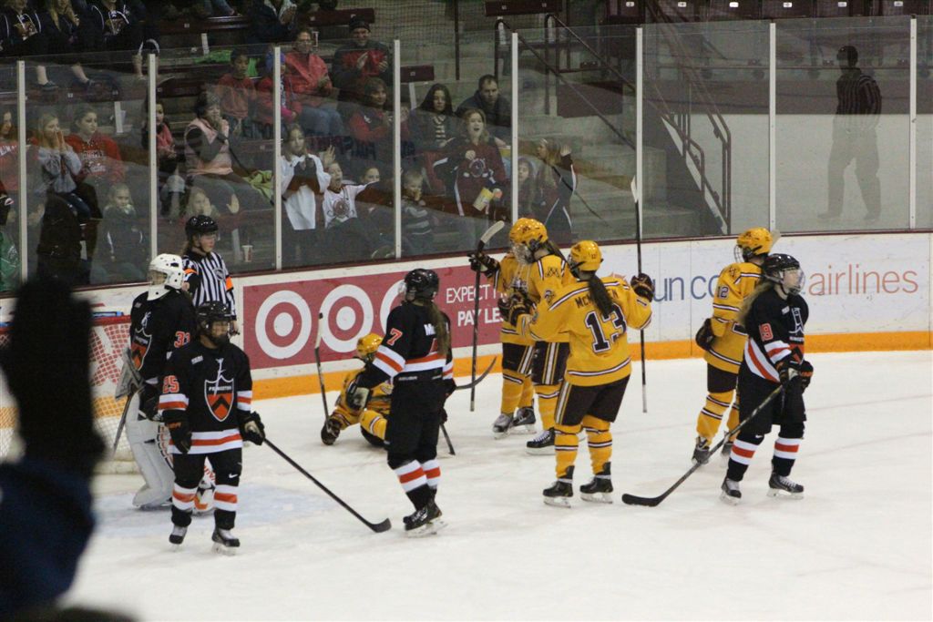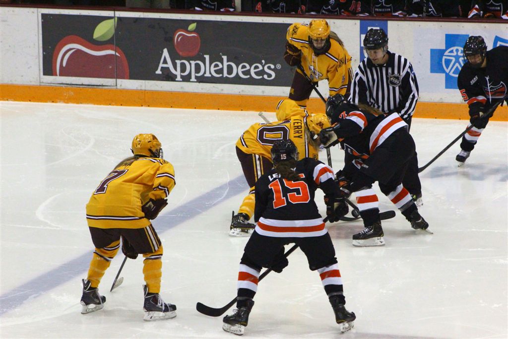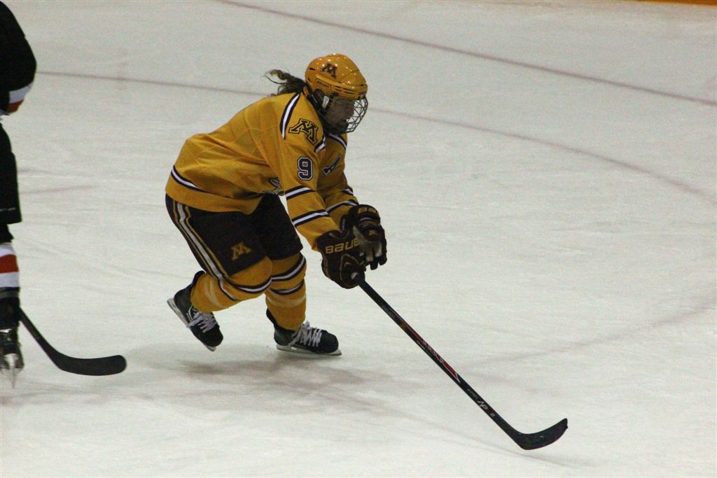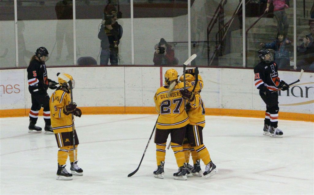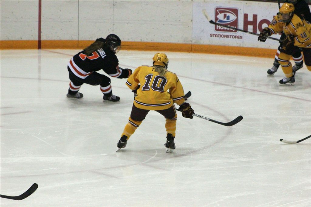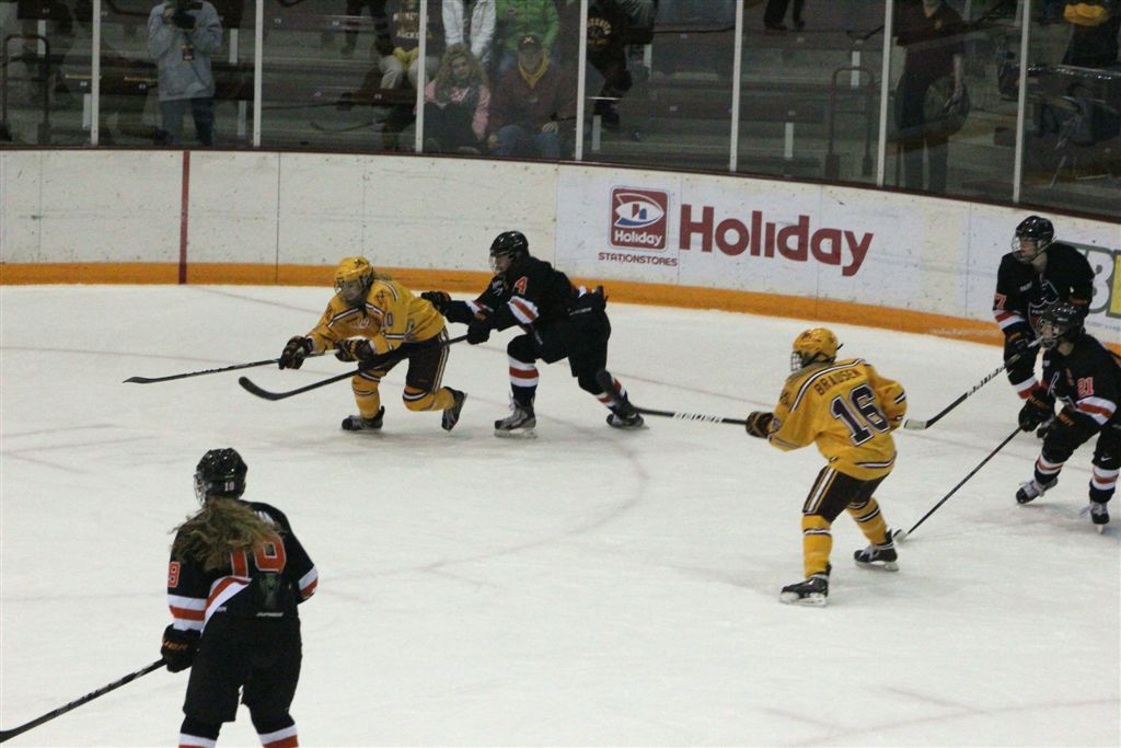 [The end result was a goal by Hannah Brandt (22) about 13 minutes into the period. 10 seconds later, Milica McMillen (13) scored the 4th goal of the period. She received the face-off draw after the Brandt goal at her own blue line, casually skated to the Tigers’ blue line, and then, I think just to get the puck in deep, fired a bullet slapshot from the blue line that whistled over the goalie’s left shoulder and into the net. Then she skated casually back to the bench for a shift change. In the 1st period, the Gophers had an 18 – 1 shots-on-goal advantage. The game was much more evenly played from then on.]