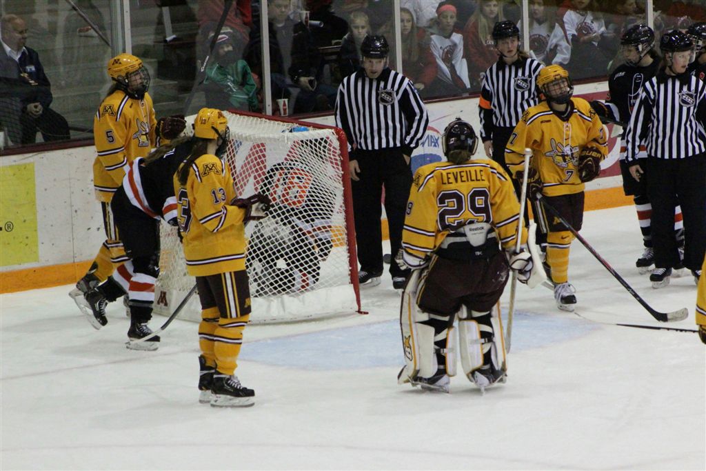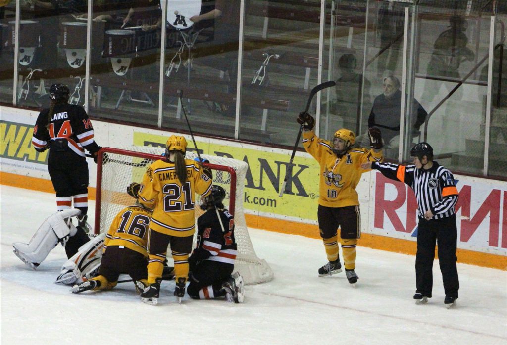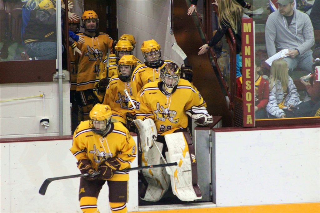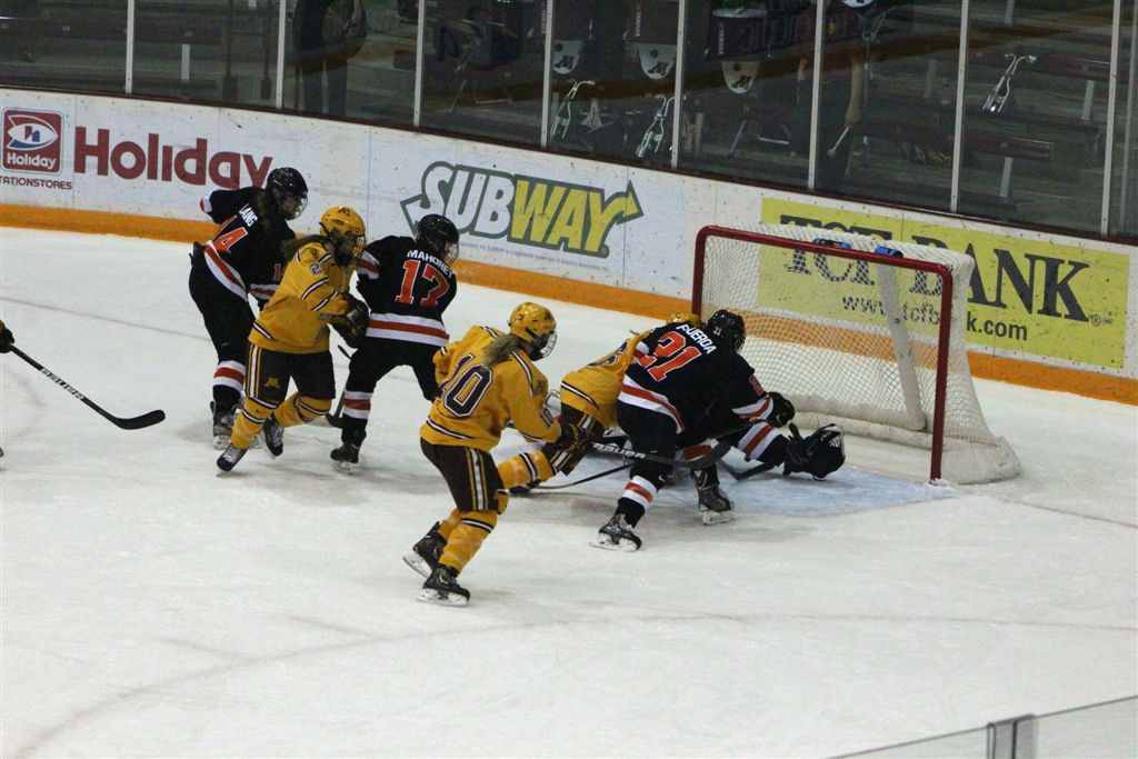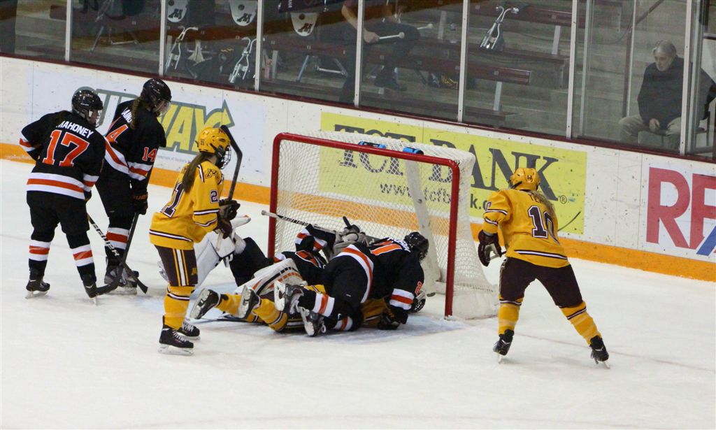 [Some how, from the bottom of the pile, Bethany scored with 10 seconds left in the period giving the Gophers a 6 – 1 lead after two.]