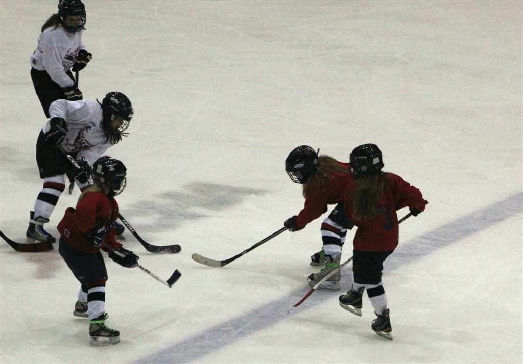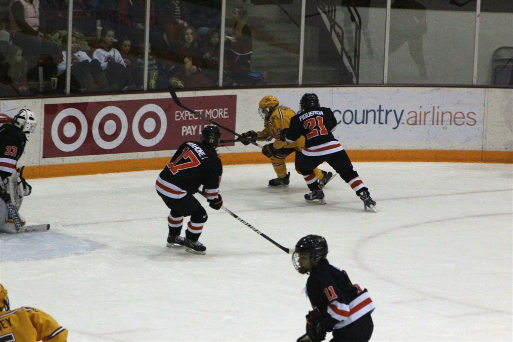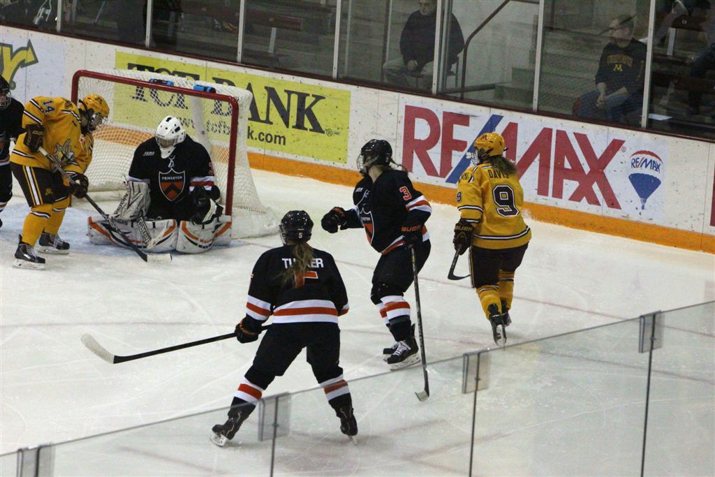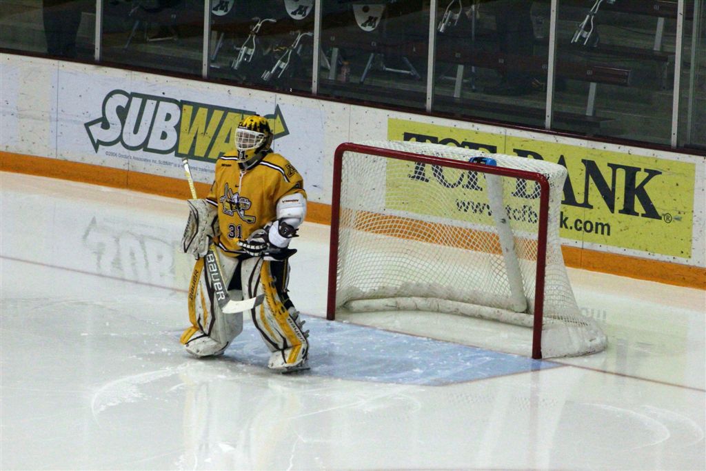 [Goalie Shyler Sletta (31) came in for the 3rd period. Amanda Leveille (29) complained of boredom after the first two periods. 😉 To the Tigers credit, they tested Shyler a few times in the third.]