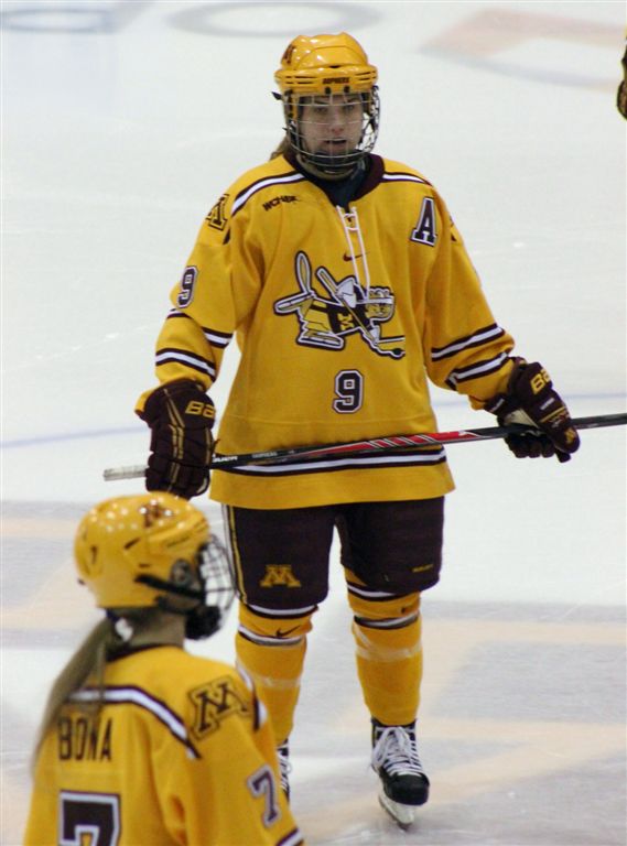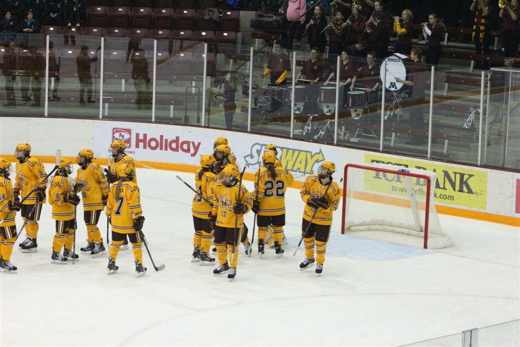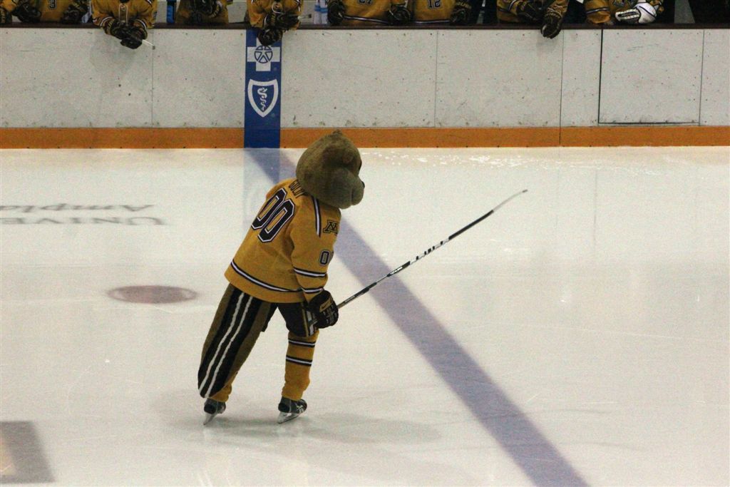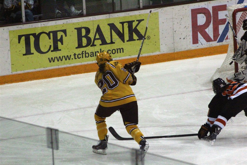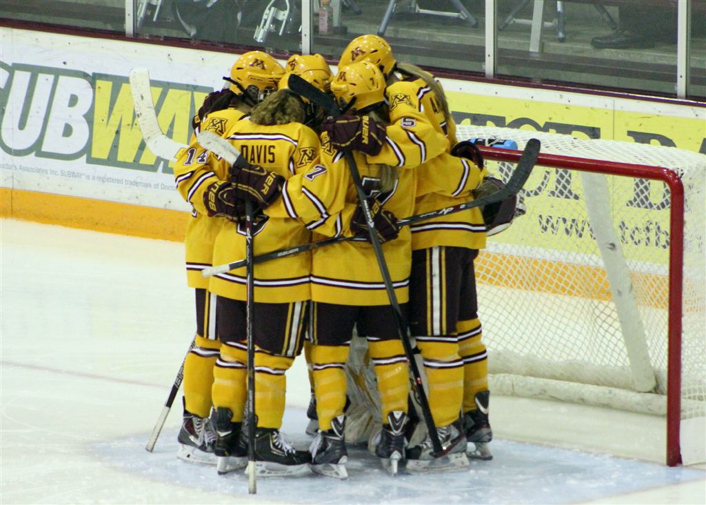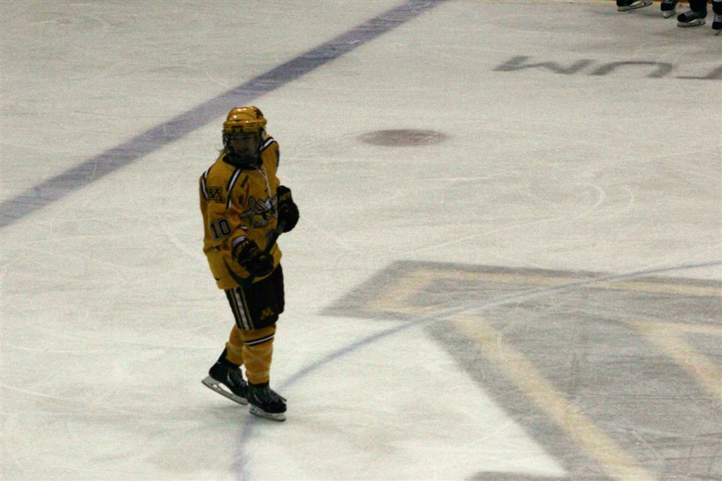 Watching the Gophers play is a thing of beauty and a joy forever. Oh . . . did somebody already use that line? Anyway, it’s not only their overall team speed but the continuous motion that makes them special (ask what made Wayne Gretzky so great?). When they have the puck in the offensive zone, the wings will either criss-cross in front the goal, thus being able to receive a pass from behind the goal or from the points for point-blank shots; or even prettier, if the puck is on the goalie’s left side, all three forwards will circle, counterclockwise at equidistance apart, that face-off circle until the forward coming around the top is open for a pass from a trailer or from the point, again for a point-blank shot on goal. And with a shot, a teammate will invariable take up position on the goalie’s weak side for a rebound. Yup, it’s as pretty as a hot fudge sundae, with nuts! 😉