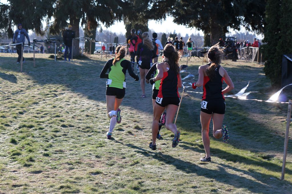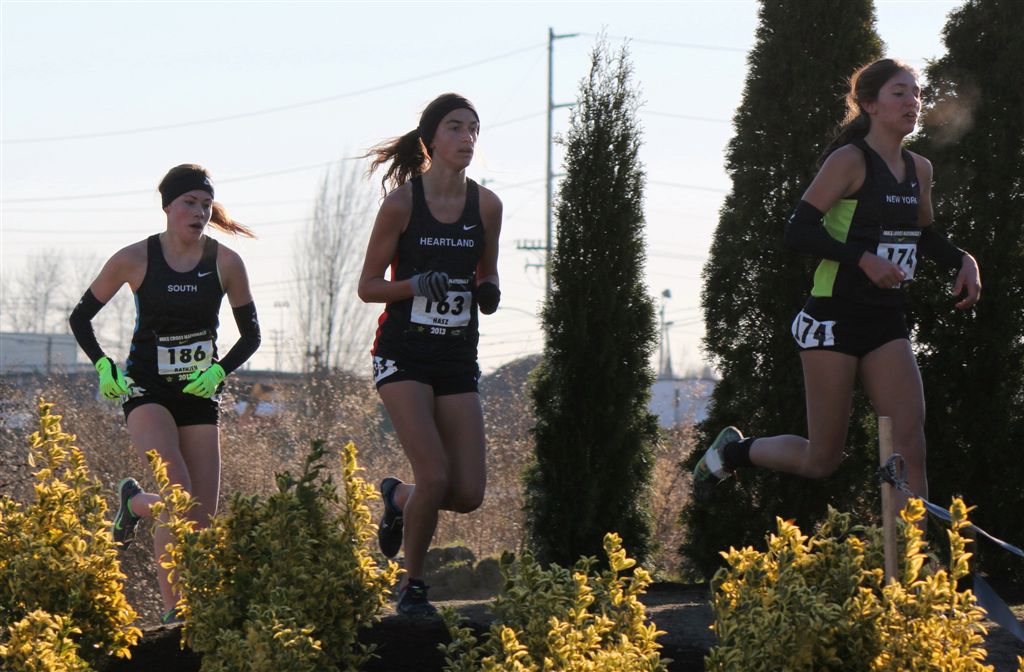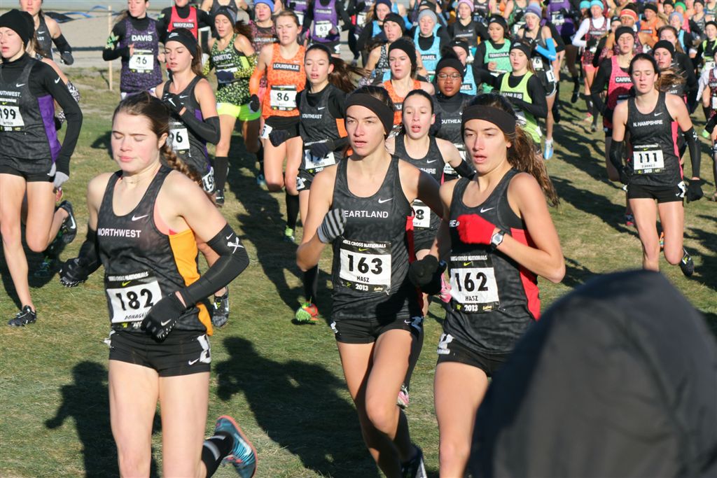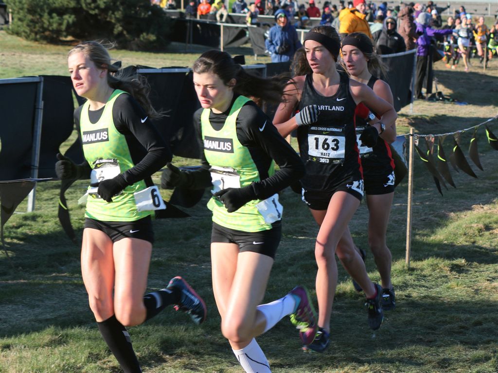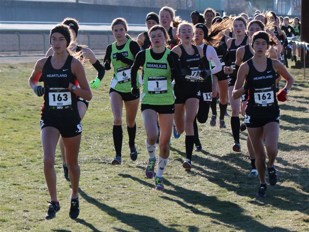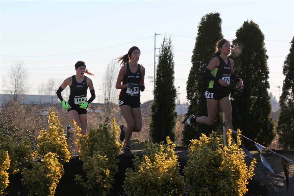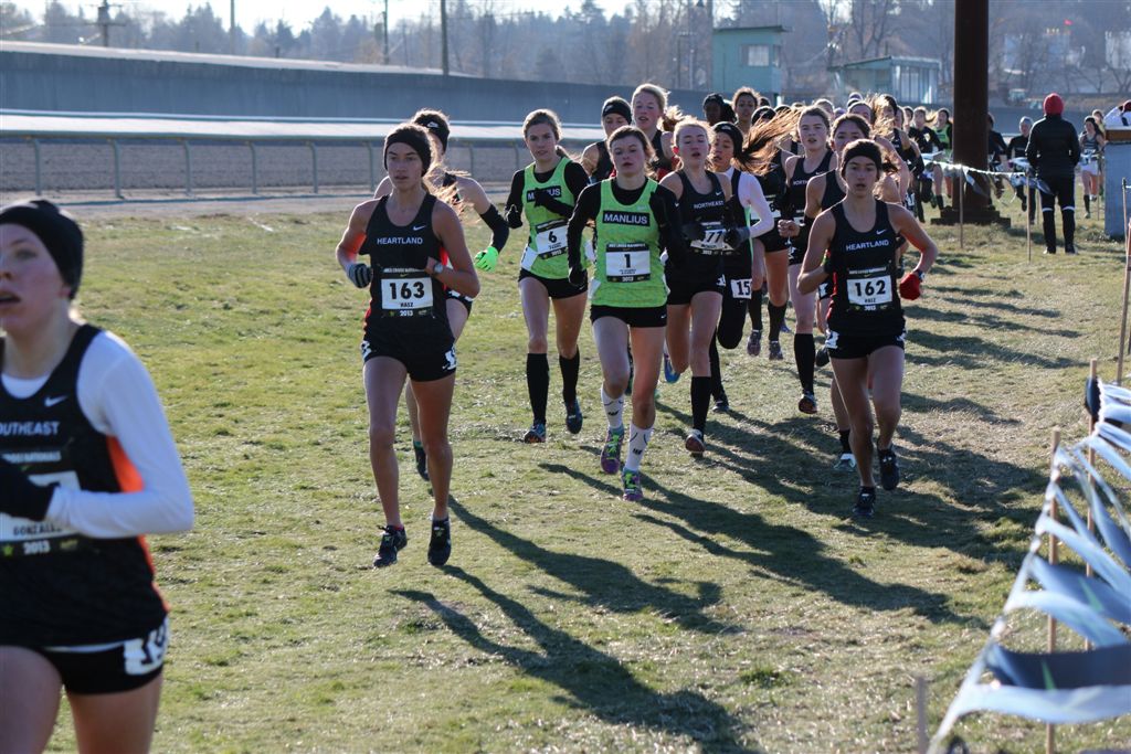 [And here come Jenna (161), Bethany (163), and Megan (162) – if you run their jersey number backwards you would get the order of finish 1, 2, 3 in the Minnesota state meet. Then Bethany and Megan went out and finished 1-2 in the Heartland Region meet (which, as I recall, includes Iowa, Wisconsin, the Dakotas, and Nebraska).]