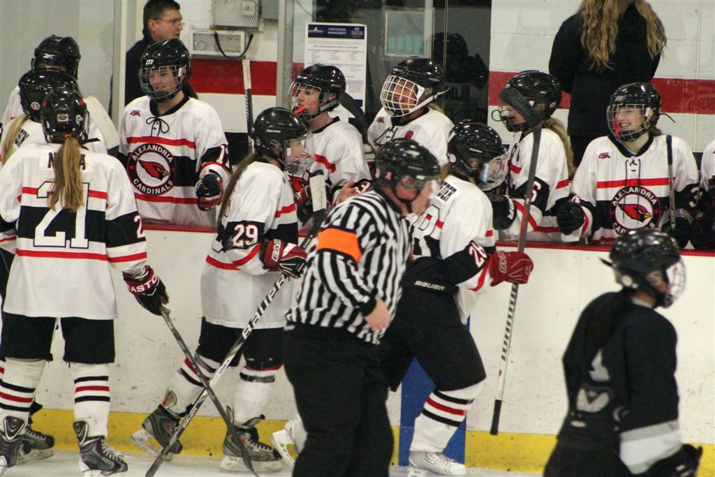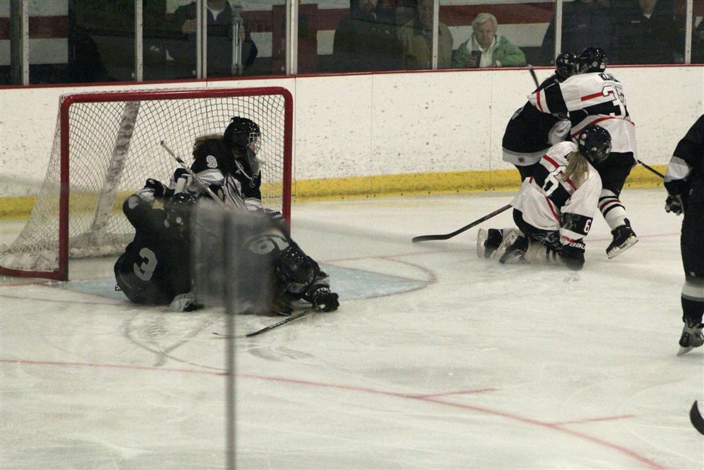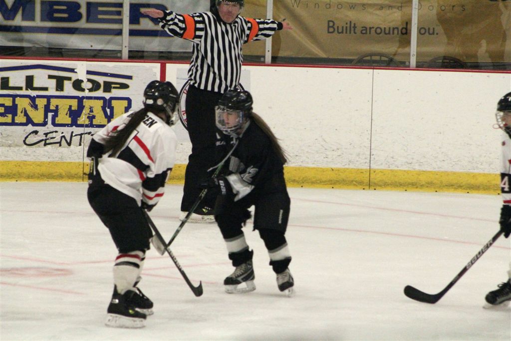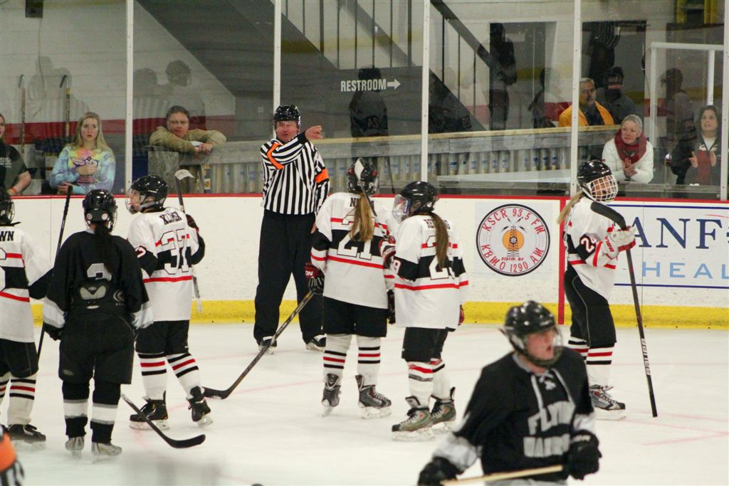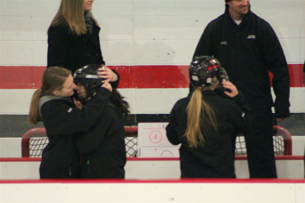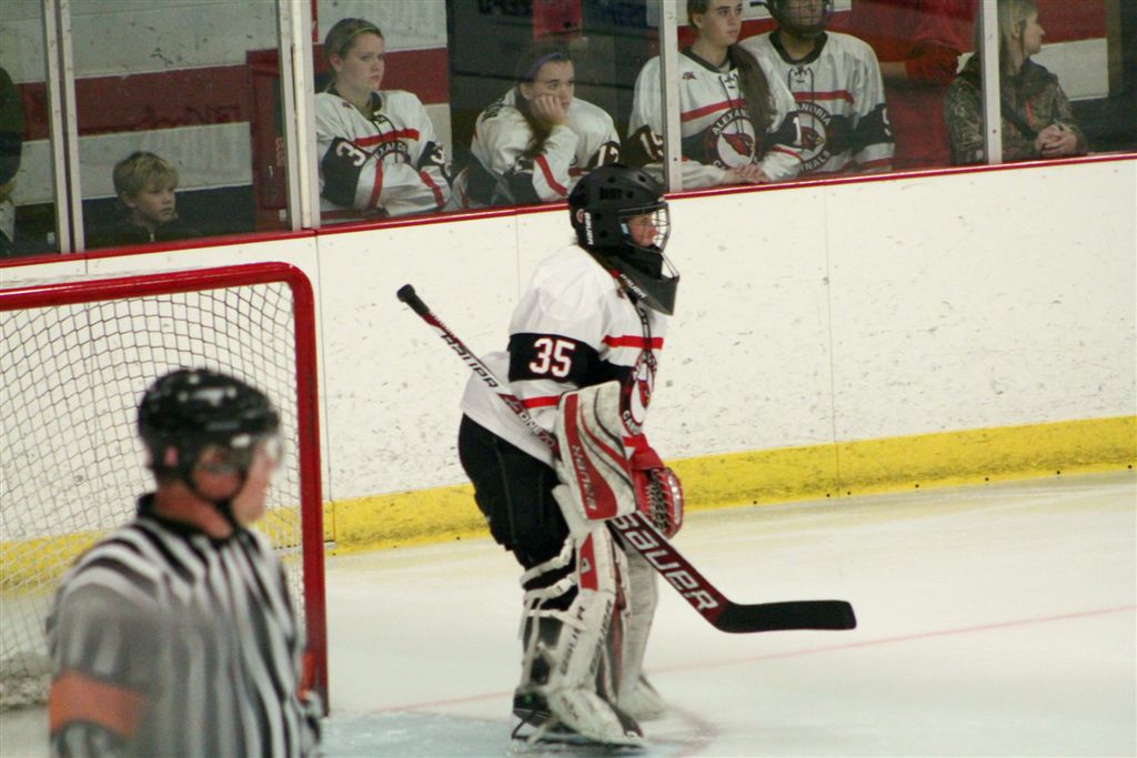 [OMG, this is from Tuesday, December 3rd! I’m so far behind I may never catch up! Yesterday (Thursday, the 12th), I did two blog posts and the annual Christmas letter . . . and I’m still losing ground. Lest you keep track of such things, last night the girls’ hockey team looked good in beating Willmar, 6 – 2 (another blog to post) . . . and then because it was date night, we went to SAWA where I did a Finestra video (more blog posting). But, back to the story, this was the first girl/boy doubleheader hockey game against Brainerd/Little Falls for the girls and Brainerd for the boys. The girls led off the night with a team meeting at their goal. I was not privy to the minutes of that meeting . . . Oh, we won both games! 🙂 ]