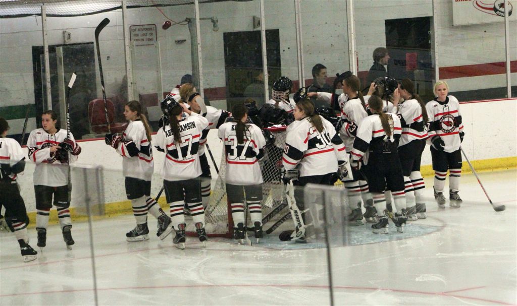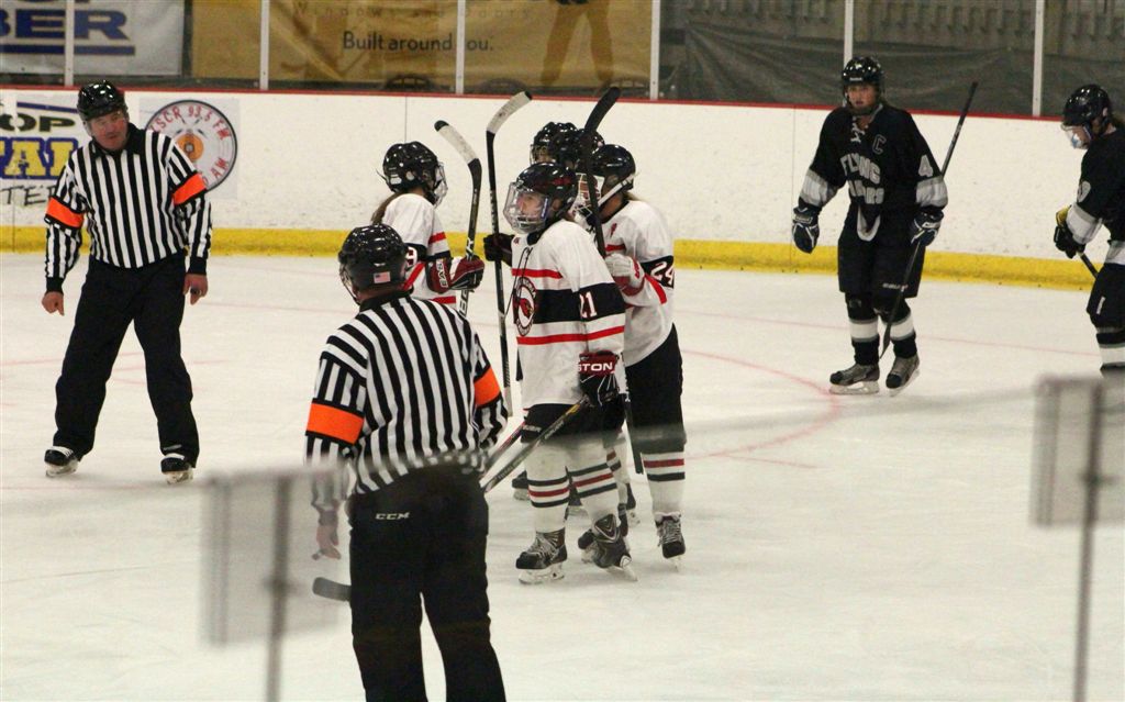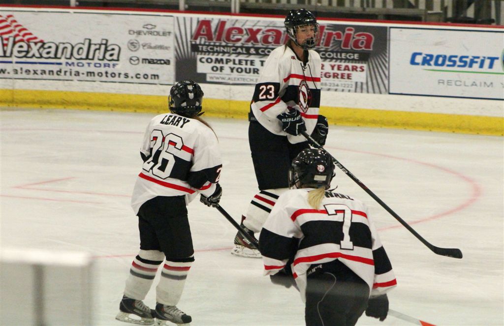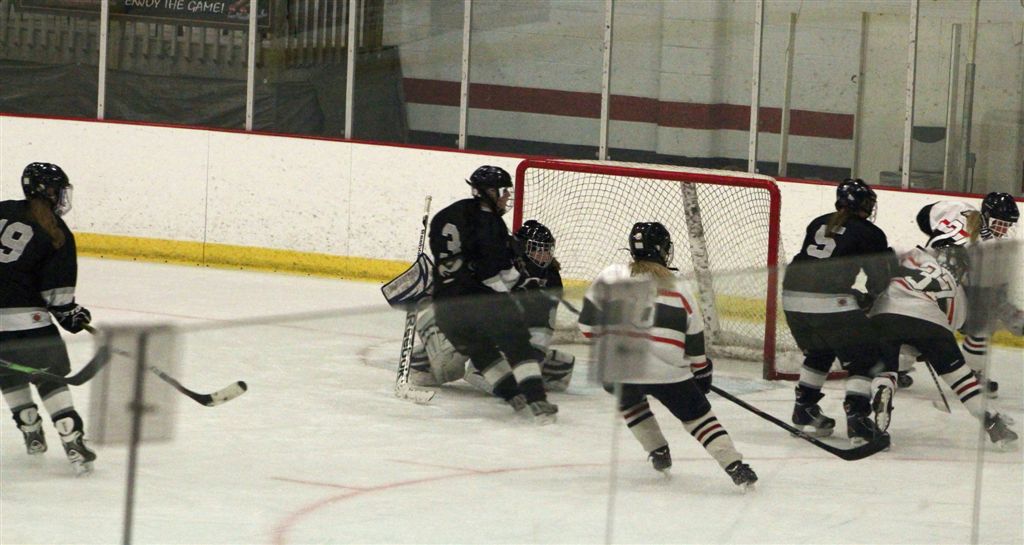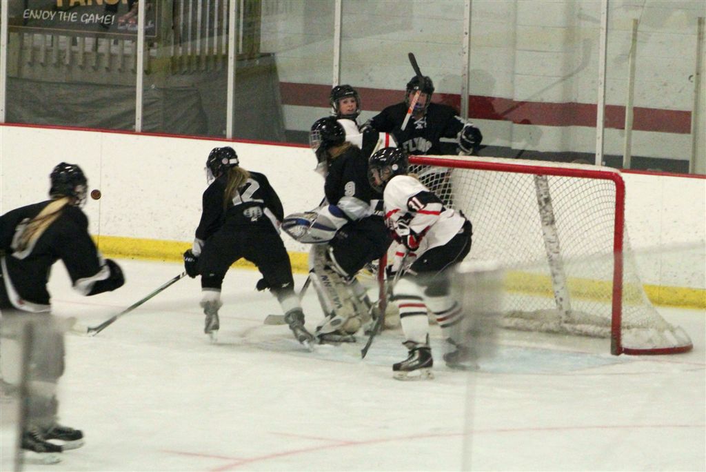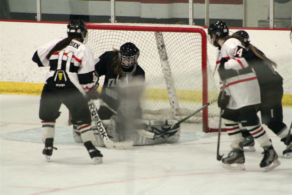 [OMG, this is from Tuesday, December 3rd! I’m so far behind I may never catch up! Yesterday (Thursday, the 12th), I did two blog posts and the annual Christmas letter . . . and I’m still losing ground. Lest you keep track of such things, last night the girls’ hockey team looked good in beating Willmar, 6 – 2 (another blog to post) . . . and then because it was date night, we went to SAWA where I did a Finestra video (more blog posting). But, back to the story, this was the first girl/boy doubleheader hockey game against Brainerd/Little Falls for the girls and Brainerd for the boys. The girls led off the night with a team meeting at their goal. I was not privy to the minutes of that meeting . . . Oh, we won both games! 🙂 ]
