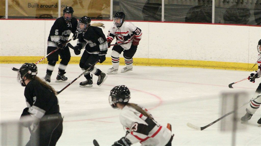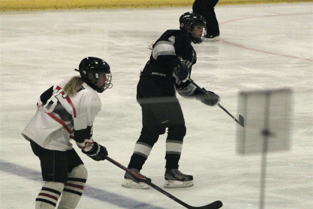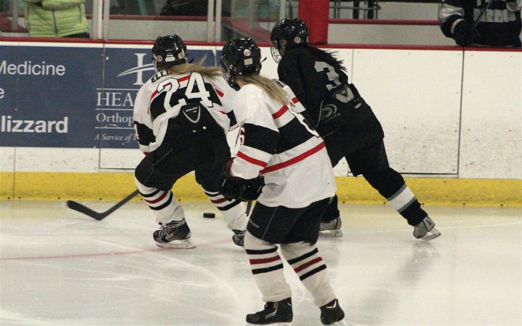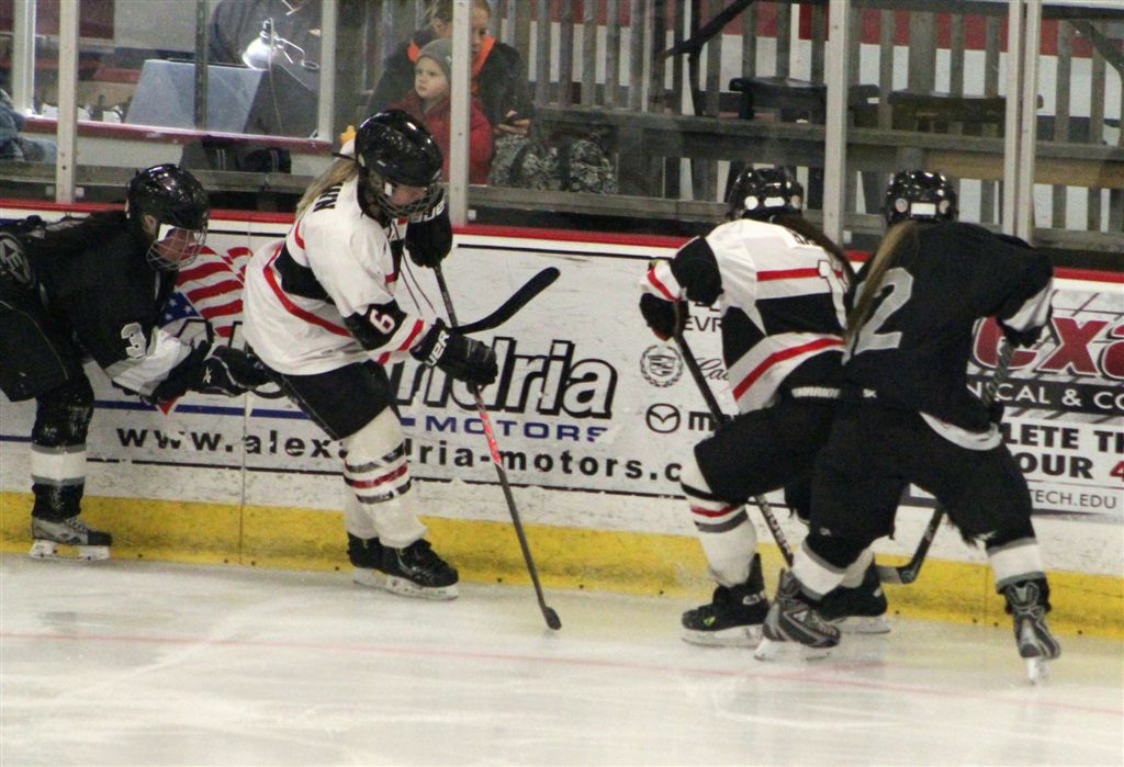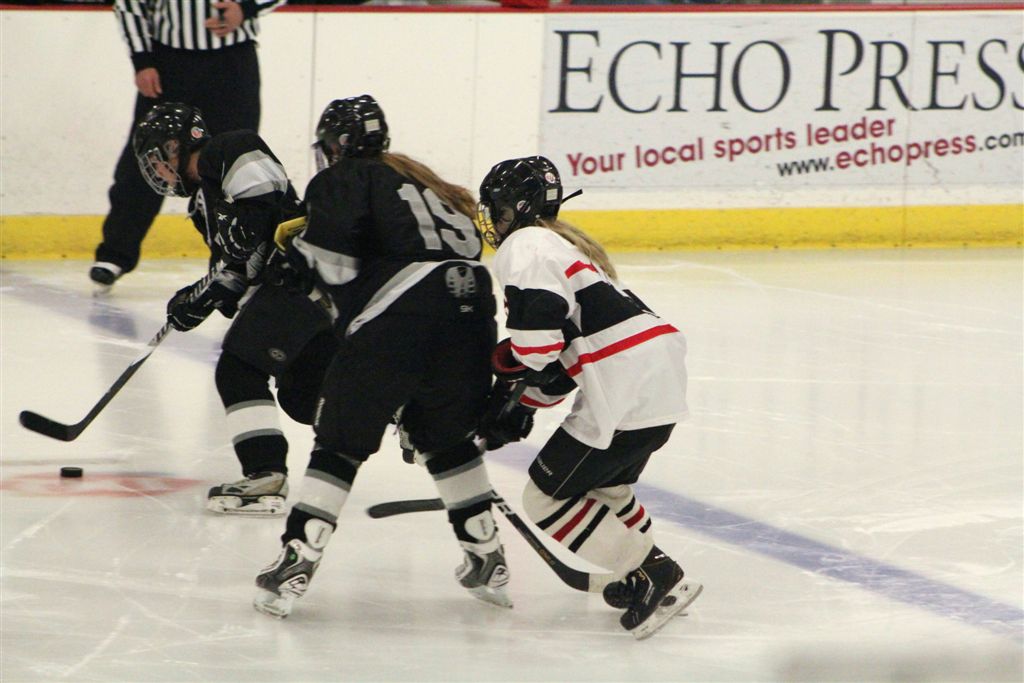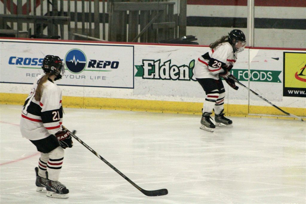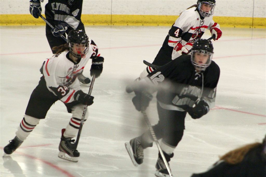 [Taylor (24) and Mel (6) pin a Flying Warrior along the boards.]