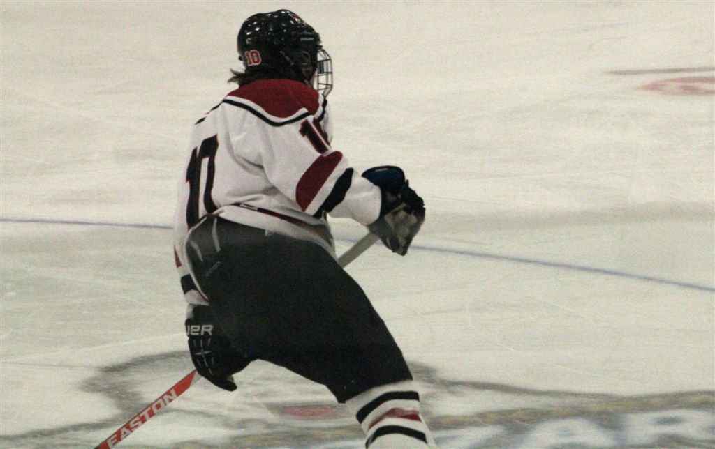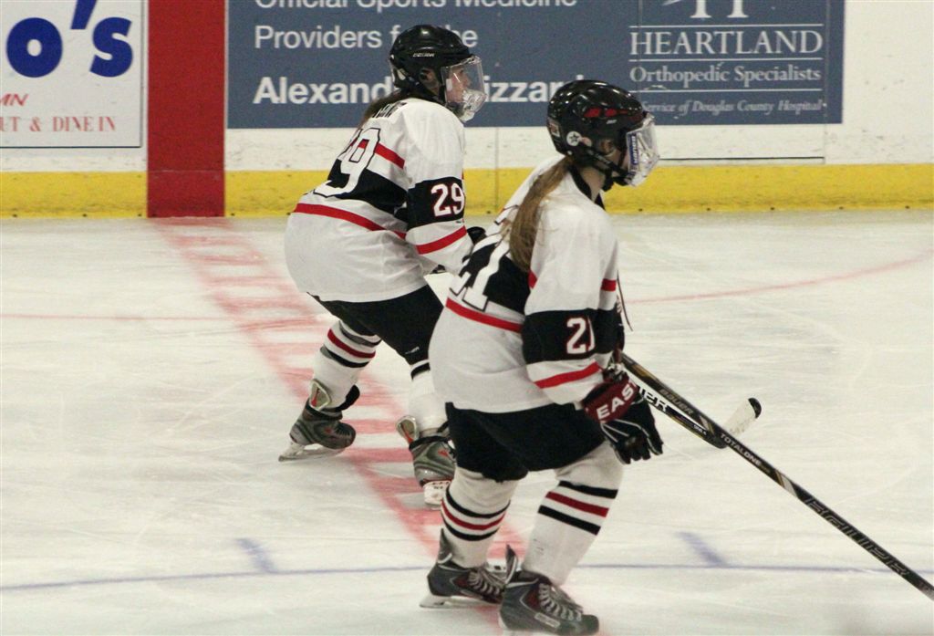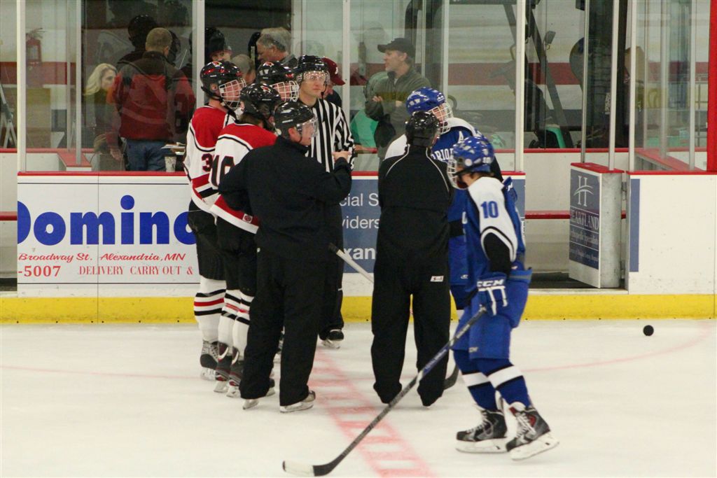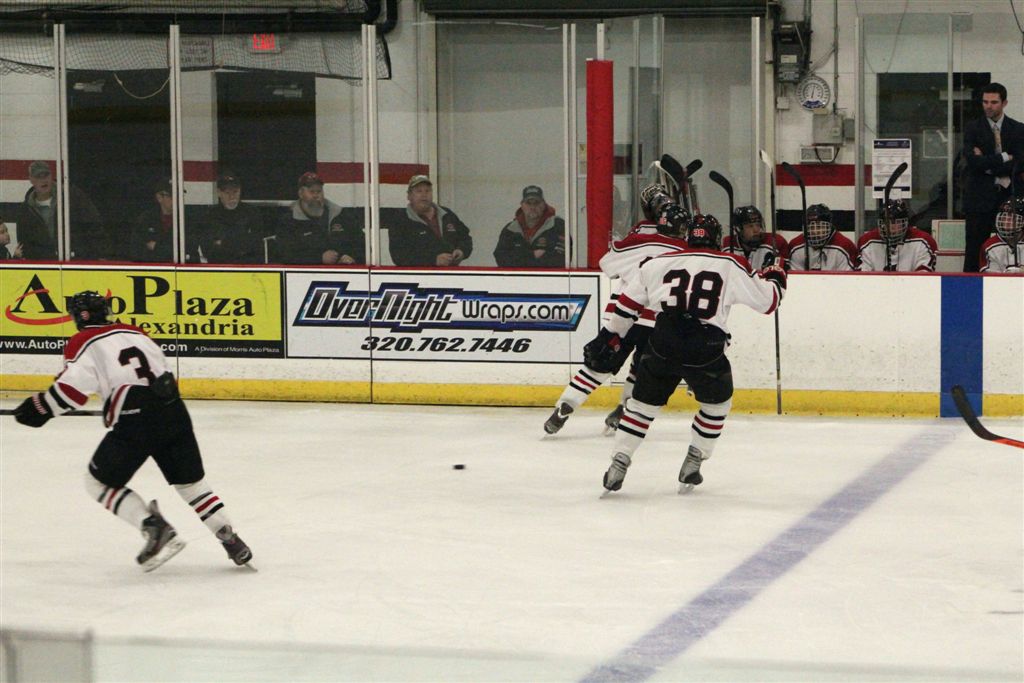 [We could tell early on it would be an evenly matched game. Junior defenseman Parker Revering (3) and senior defenseman Aaron Steidl (38).]
