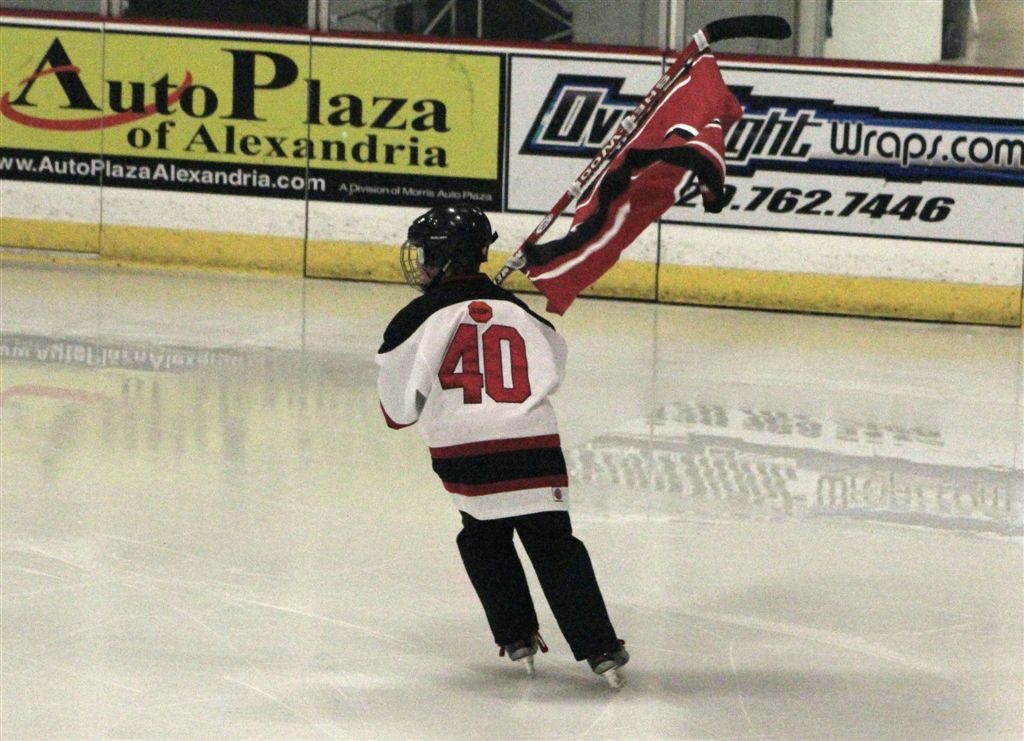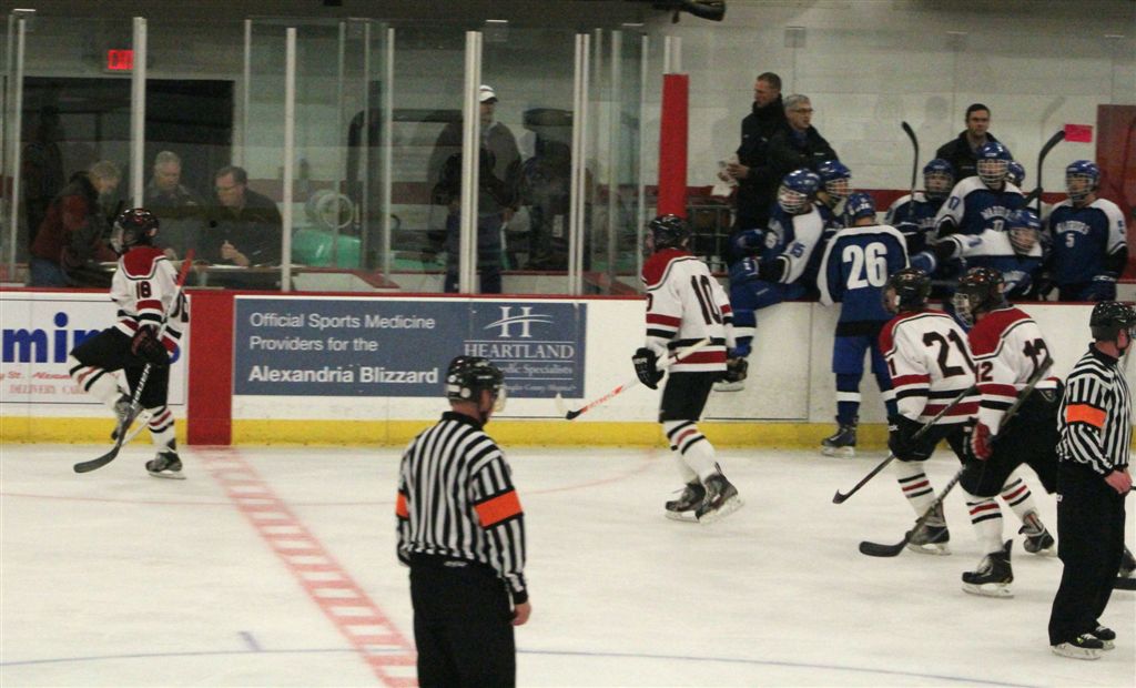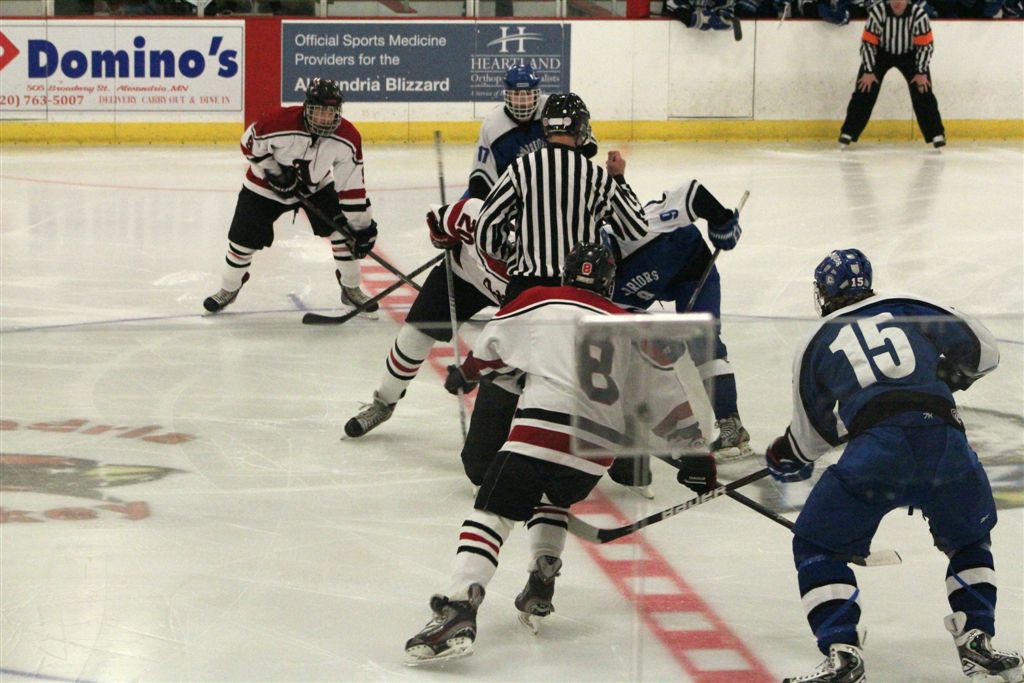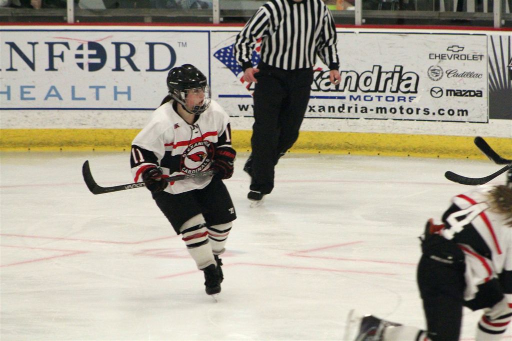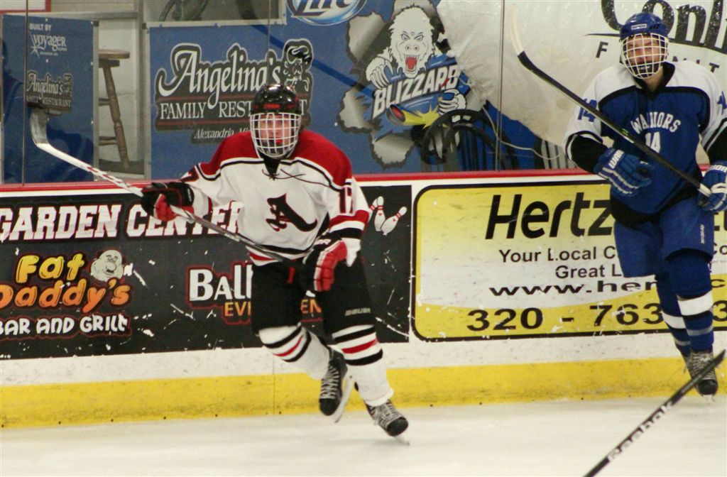 [And we’re off against the Flying Warriors (a compilation of the Little Falls and Brainerd nicknames). We were surprised to see their team only had about 12 players. We know from a member of the Fat Boys that the junior class in Brainerd has 600 students! That would make their high school twice as large as Alex’s . . . and then throw in Little Falls with them? So, what’s going on there? Their team was not up to its usual standards . . . but then we learned from another highly-placed hockey source that their U-14 girls’ team is ranked No. 1 in the state! They’re holding back! 😉 ]