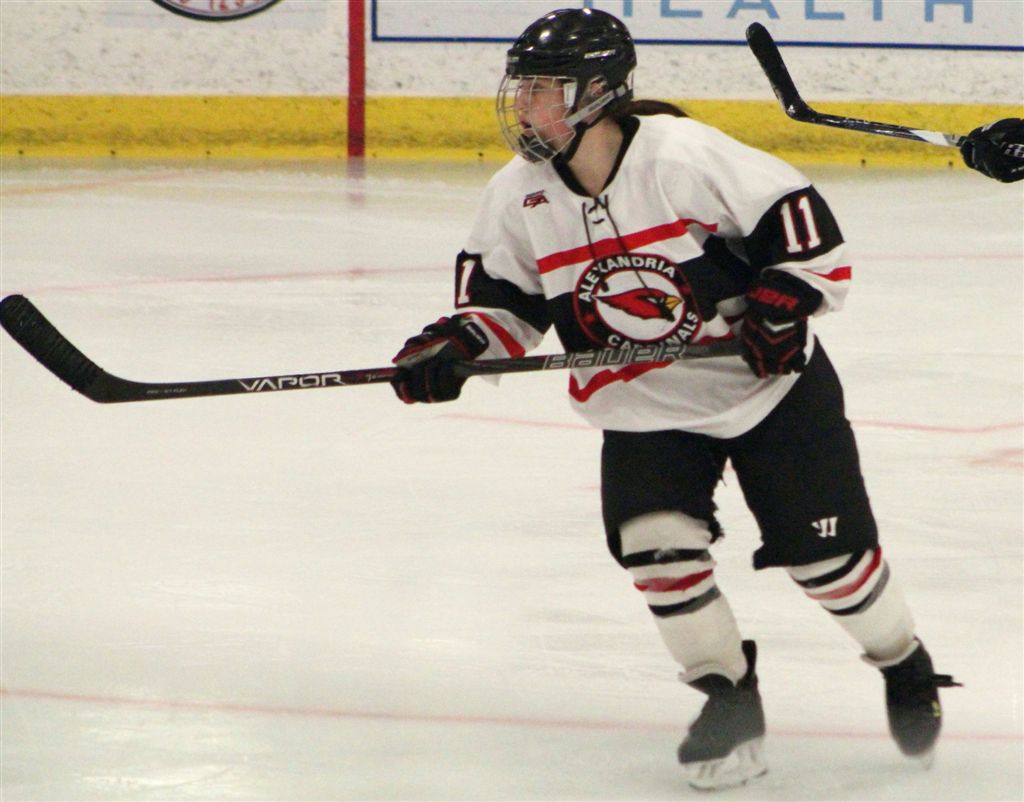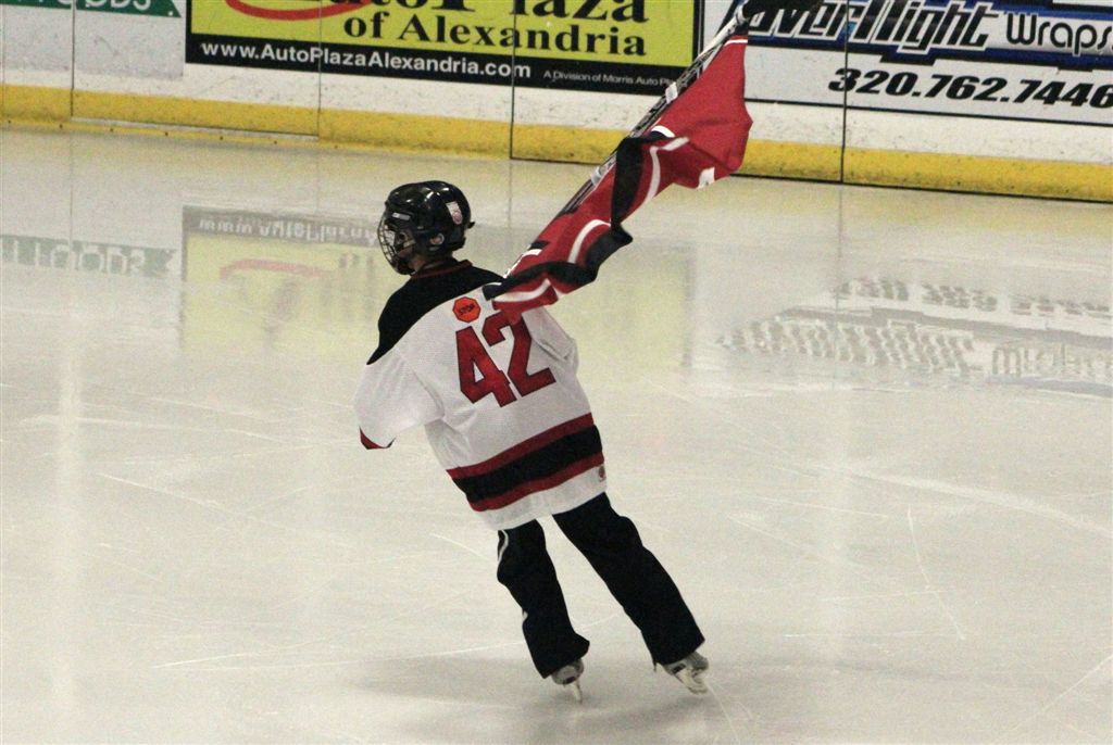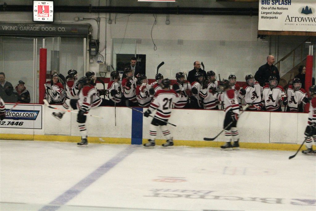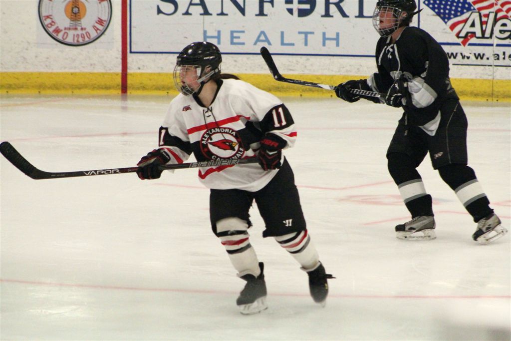 [And we’re off against the Flying Warriors (a compilation of the Little Falls and Brainerd nicknames). We were surprised to see their team only had about 12 players. We know from a member of the Fat Boys that the junior class in Brainerd has 600 students! That would make their high school twice as large as Alex’s . . . and then throw in Little Falls with them? So, what’s going on there? Their team was not up to its usual standards . . . but then we learned from another highly-placed hockey source that their U-14 girls’ team is ranked No. 1 in the state! They’re holding back! 😉 ]