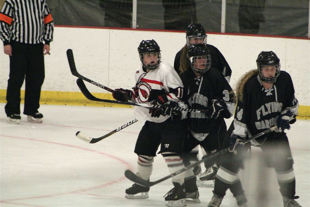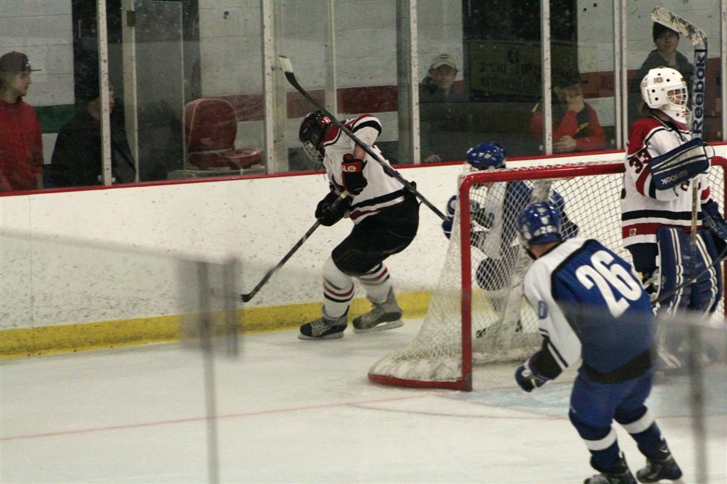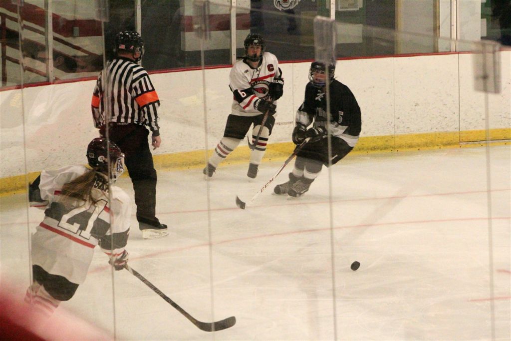 [The Cardinals had an unbelievable 9 – 0 shots-on-goal advantage with one minute left in the first period. But we could tell they were much better than that. This must not have been a shot as the Warrior was pursued by senior defenseman Andy Rentschler (12).]
