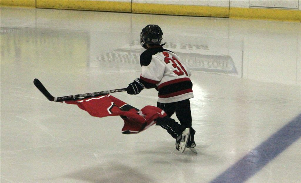 [After one. A Warrior fan told us this was their first game, and they’d only had one practice. They came out much sharper in the 2nd period and took a 2 – 1 lead. Their passing was much sharper than the Cards, and they harrassed us with the hockey version of a full-court press. Whoever had the puck for the Cardinals was immediately put upon by a Warrior and it obviously bothered us. Matt Resch scored to tie it up, but then Brainerd scored again late to take a 3 – 2 lead into the 3rd period.]
