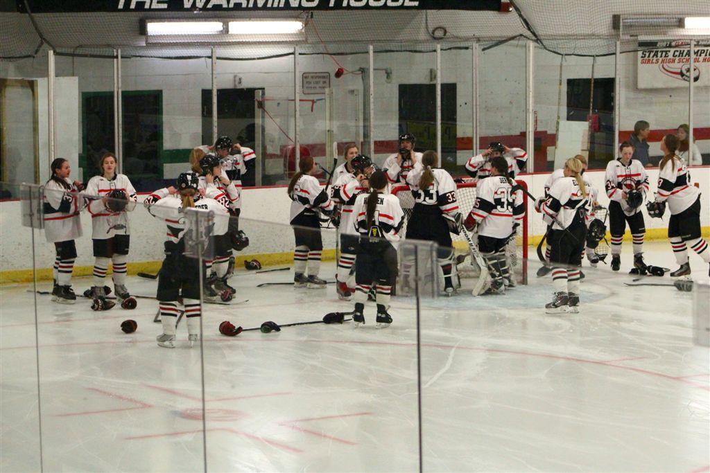 [Girls with sticks on the bench watch girls with sticks on the ice.]