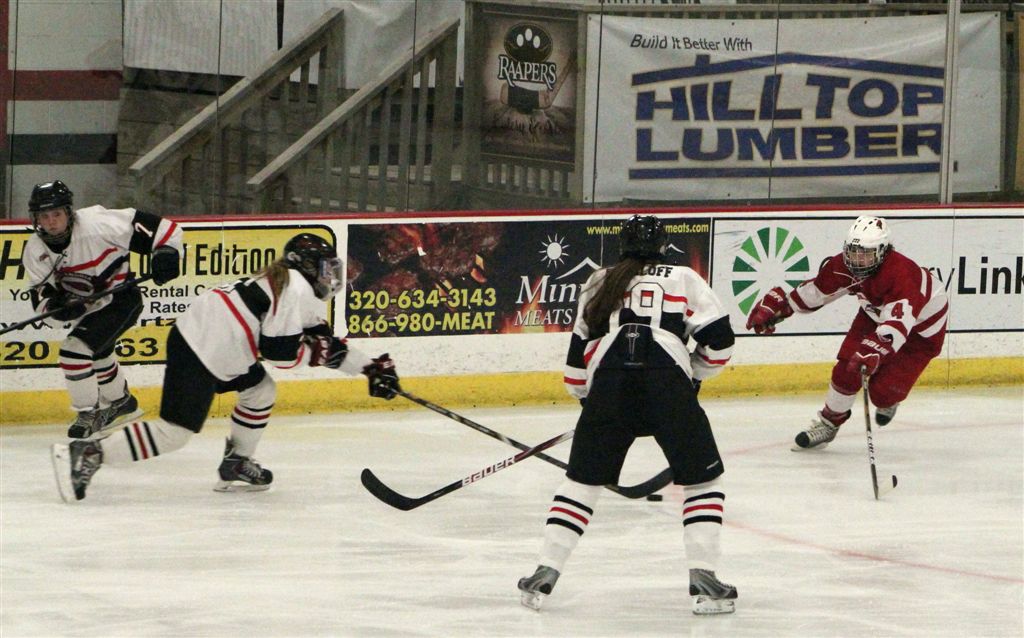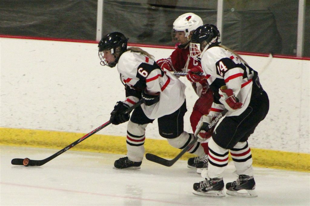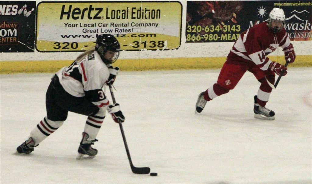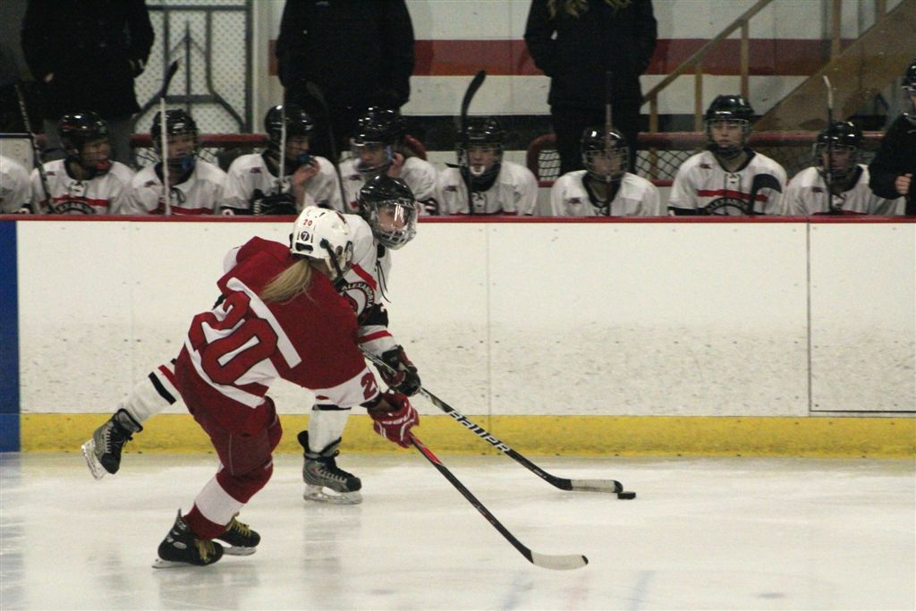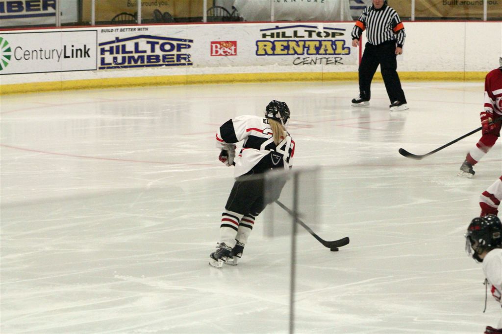[Mel (6) carries the puck while Taylor rides shotgun.]
