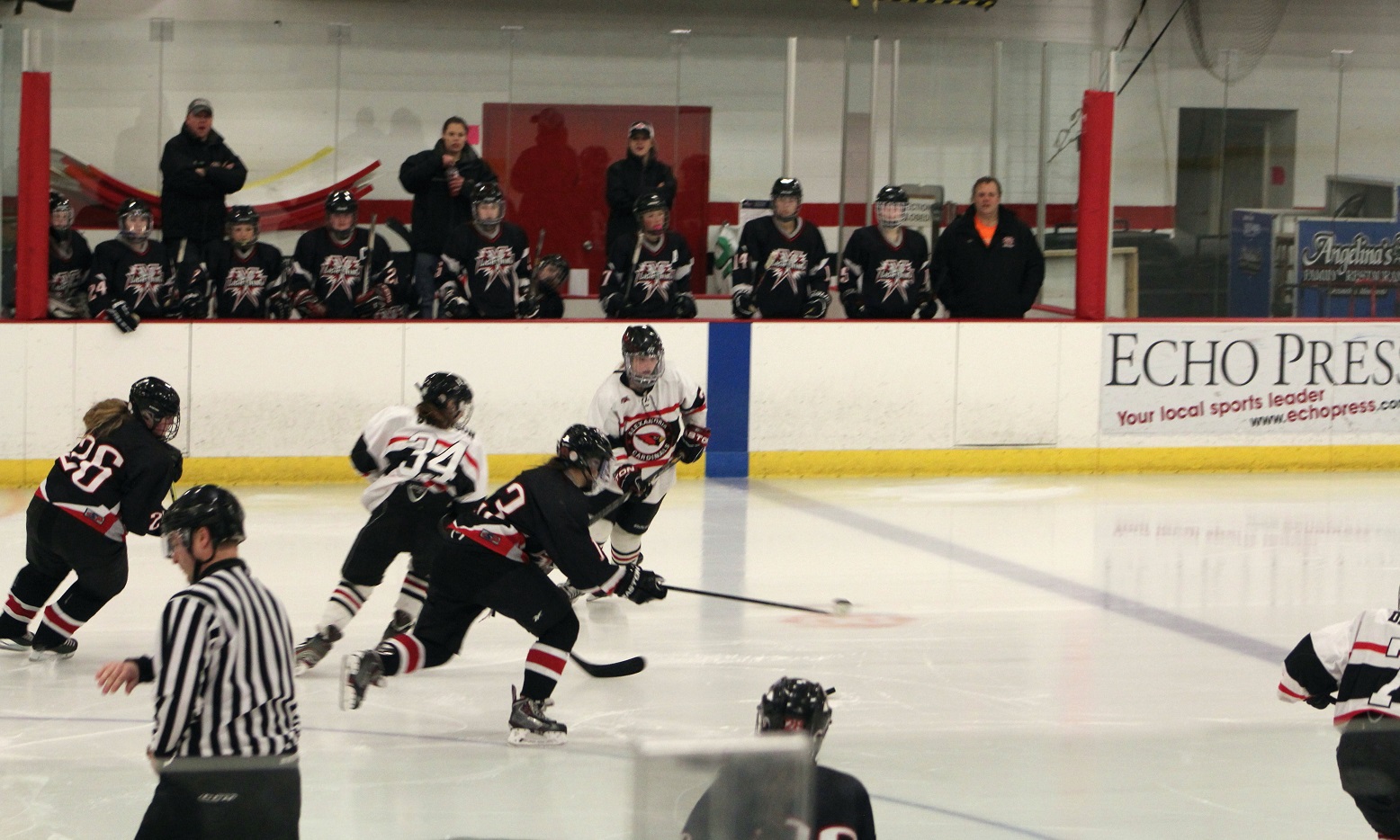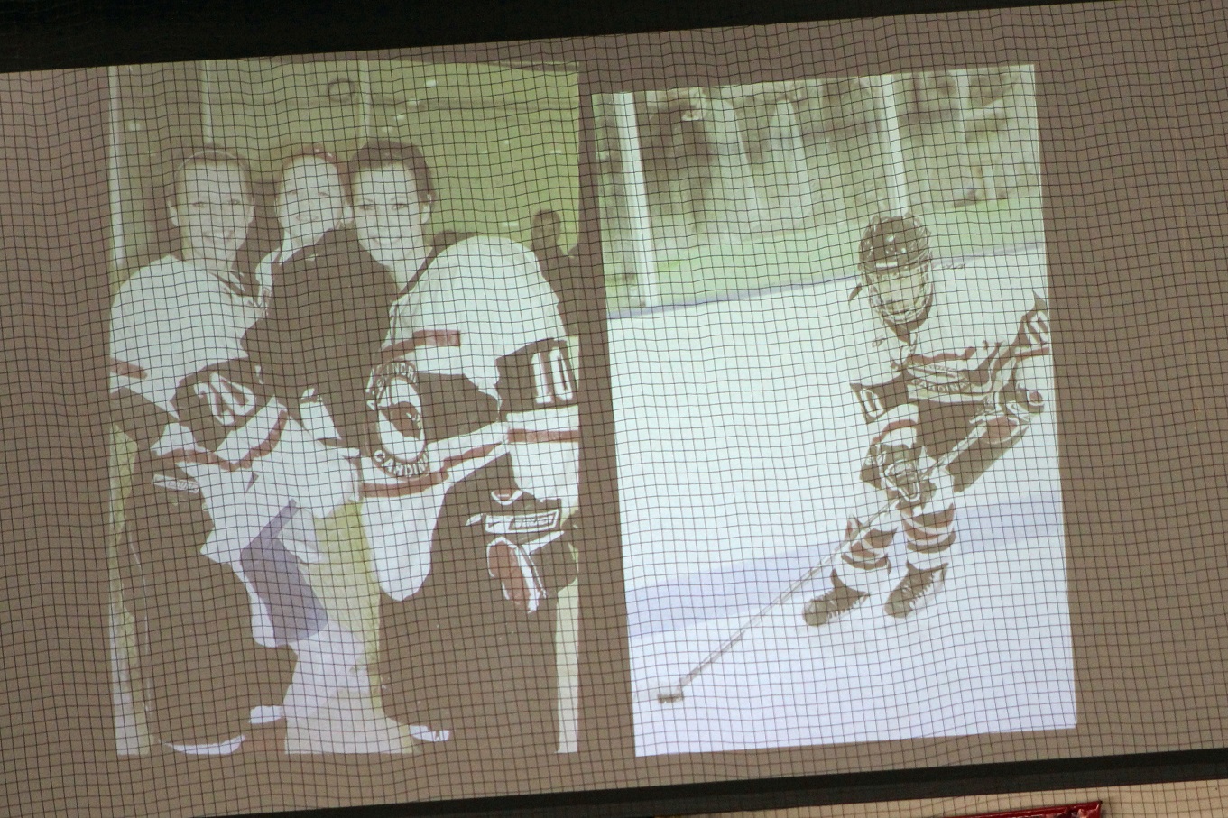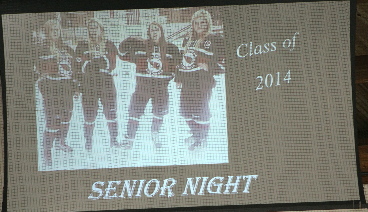 Good to get back in the routine. We arrived at the RCC to discover it was senior night – that was a nice touch. But when they introduced and did bios on each of the players, who were joined at center ice by their parents, they were backlit by the spotlight again so we couldn’t see them! The most touching was Kalley Kragenbring’s, who came back to participate. Her folks wrote all about her battle with concussions and announced her doctors said her brain was now totally healed as of December 19, 22 months later. Then her teammates came out and gave her her old jersey No 10. And here are the seniors: