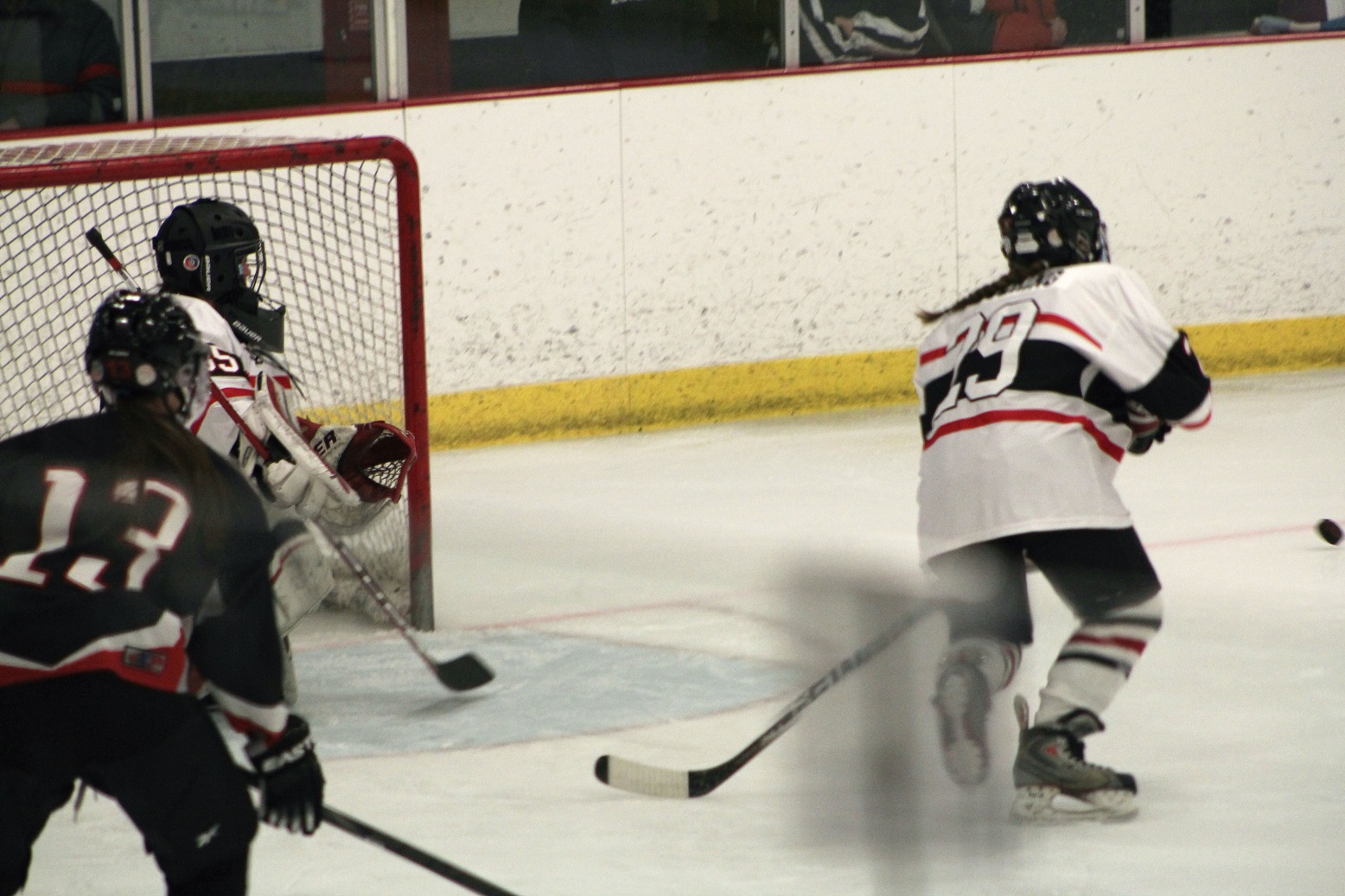[A sharp angle wrister by Mel as Hanah closes in.]