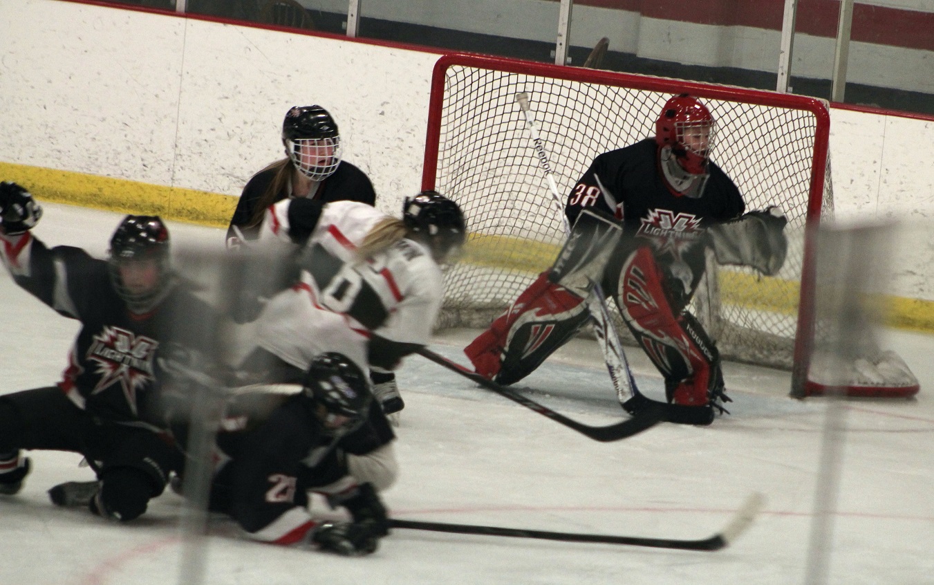 [The Pequot goalie throws a glove at a shot by Nicole.]