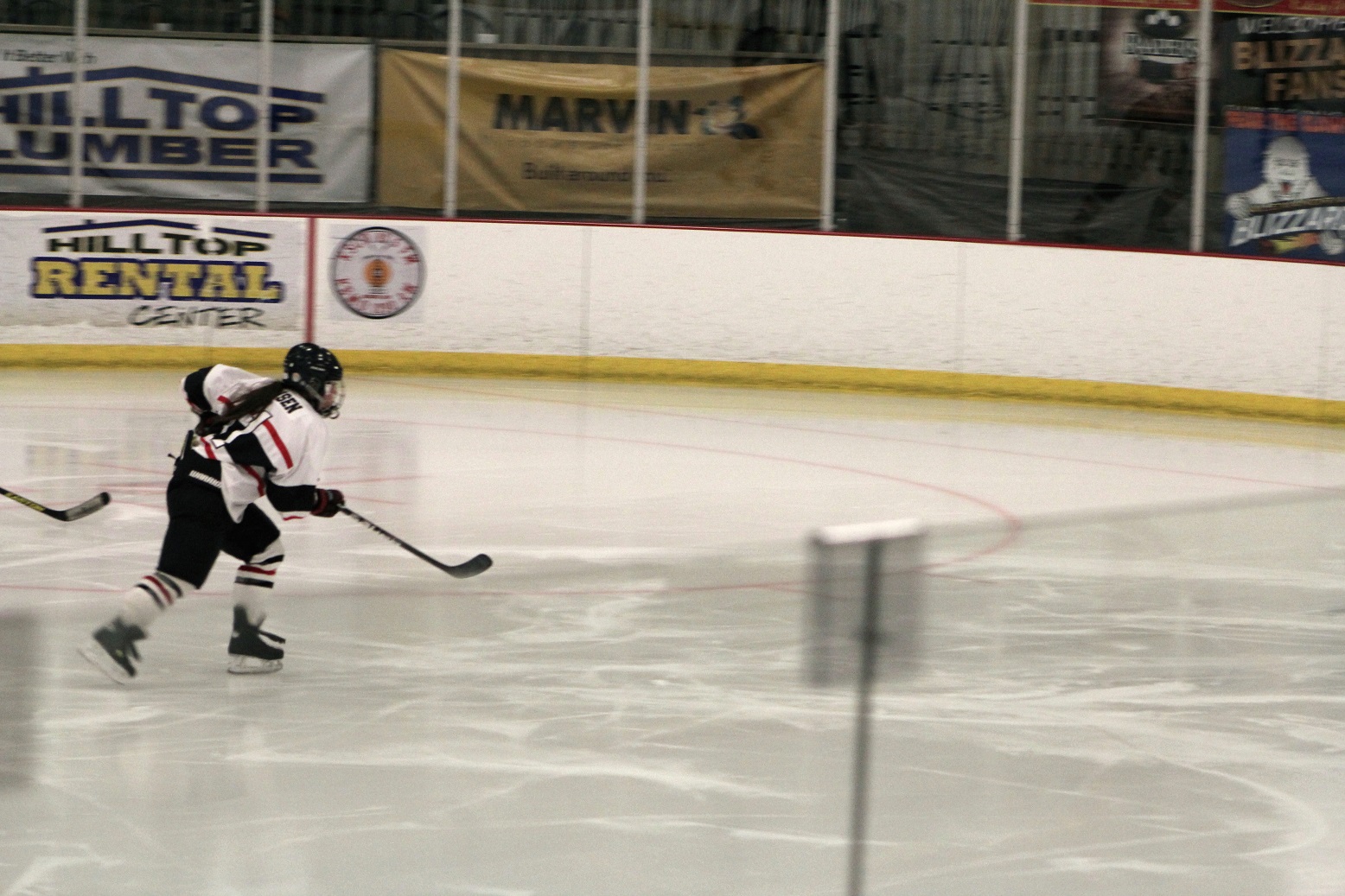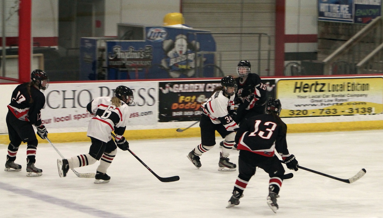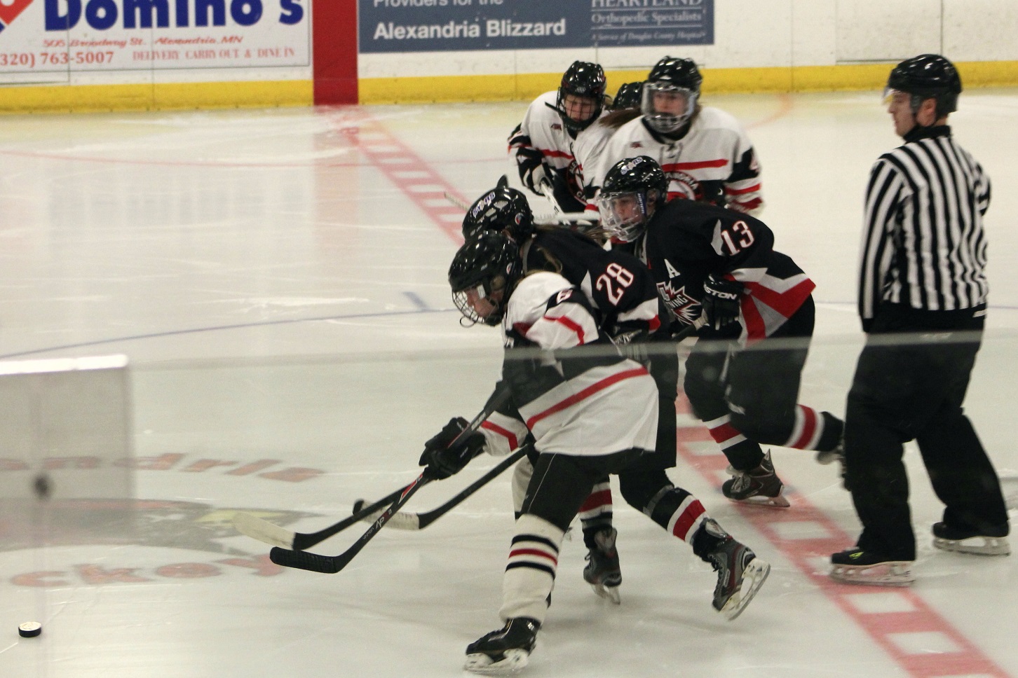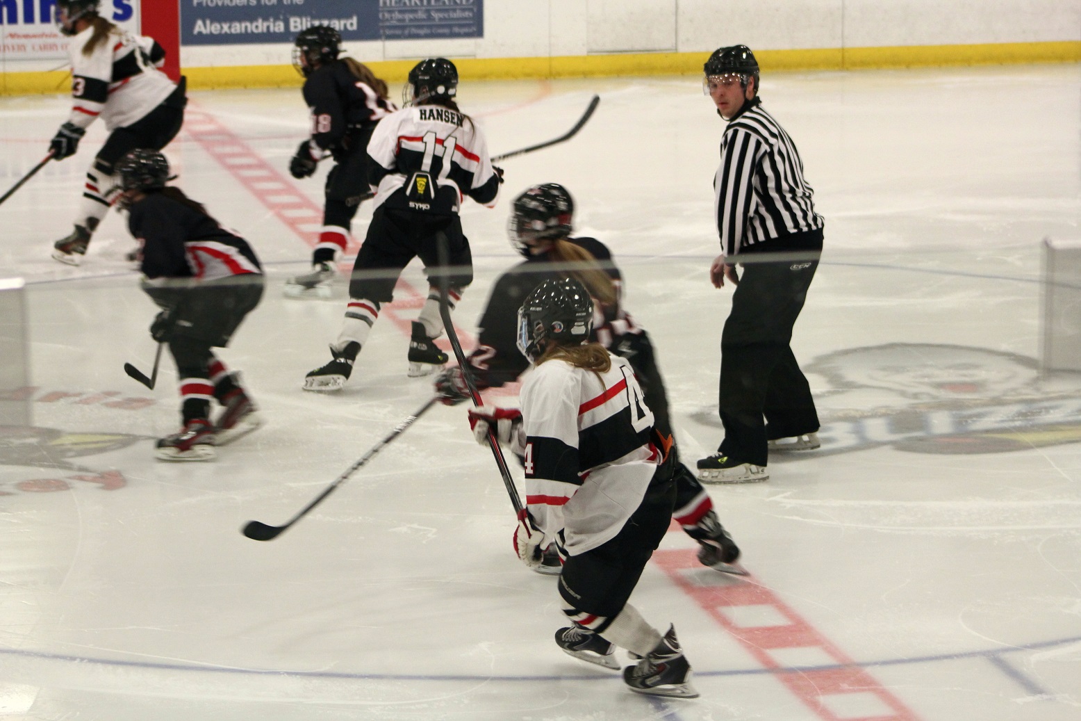 Pequot came in a couple games under .500, but they had beaten Fergus and only lost by one goal to River Lakes; plus their good goalie, now a senior, was back so they weren’t chopped liver. The seniors all started, of course, so Taylor E was introduced starting on defense – and she stayed there all game. She had played on D a few games earlier, too. After the game, Ashley reminded that Taylor had started on D before moving to center – I remembered that and also that Mel started on D before moving to forward. With that change, Nicole was moved to forward. I told Ashley I like both those moves – Taylor gives us a strong, fast, and experienced defenseman who can carry the puck out, and Nicole with her length and moves can always get deep into the offensive zone, as she did many times in this game. And there were other line reorganizations – Mel was out with Micaela and Kaila – hey, whatever works!