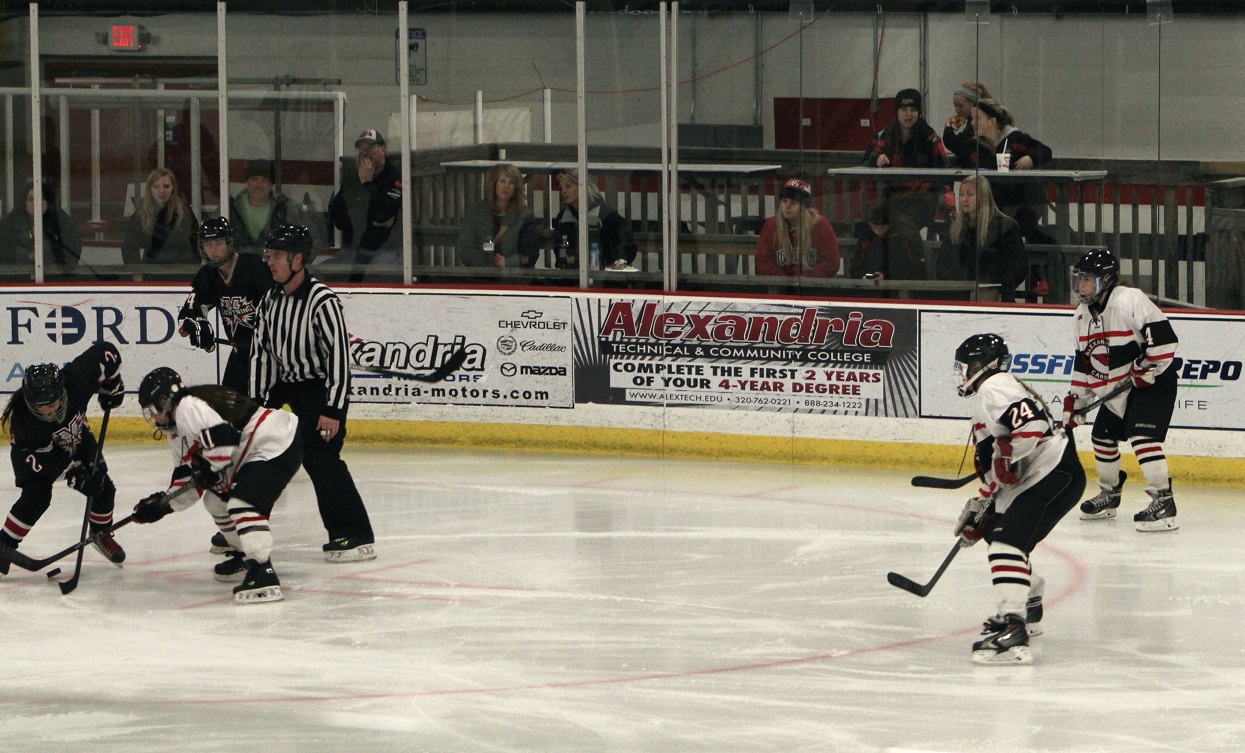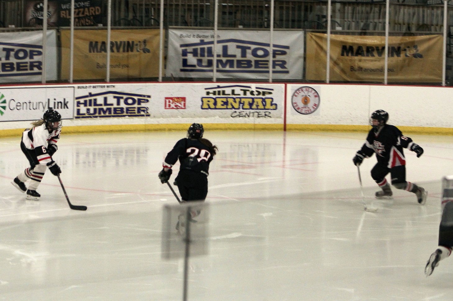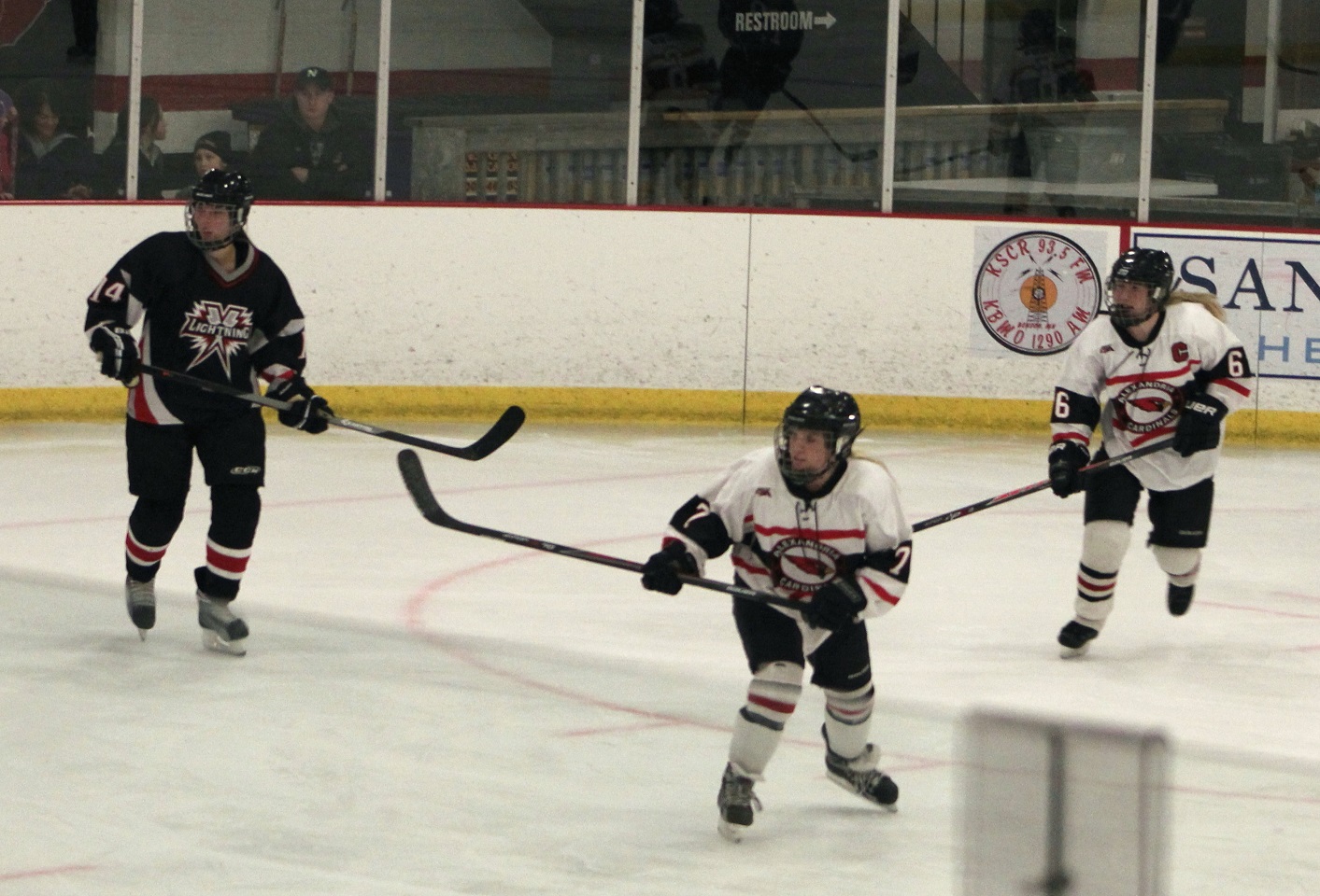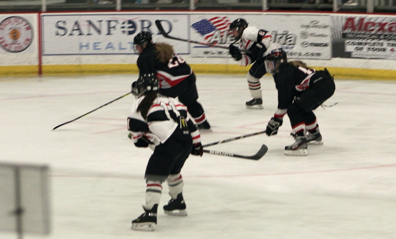 Pequot came in a couple games under .500, but they had beaten Fergus and only lost by one goal to River Lakes; plus their good goalie, now a senior, was back so they weren’t chopped liver. The seniors all started, of course, so Taylor E was introduced starting on defense – and she stayed there all game. She had played on D a few games earlier, too. After the game, Ashley reminded that Taylor had started on D before moving to center – I remembered that and also that Mel started on D before moving to forward. With that change, Nicole was moved to forward. I told Ashley I like both those moves – Taylor gives us a strong, fast, and experienced defenseman who can carry the puck out, and Nicole with her length and moves can always get deep into the offensive zone, as she did many times in this game. And there were other line reorganizations – Mel was out with Micaela and Kaila – hey, whatever works!