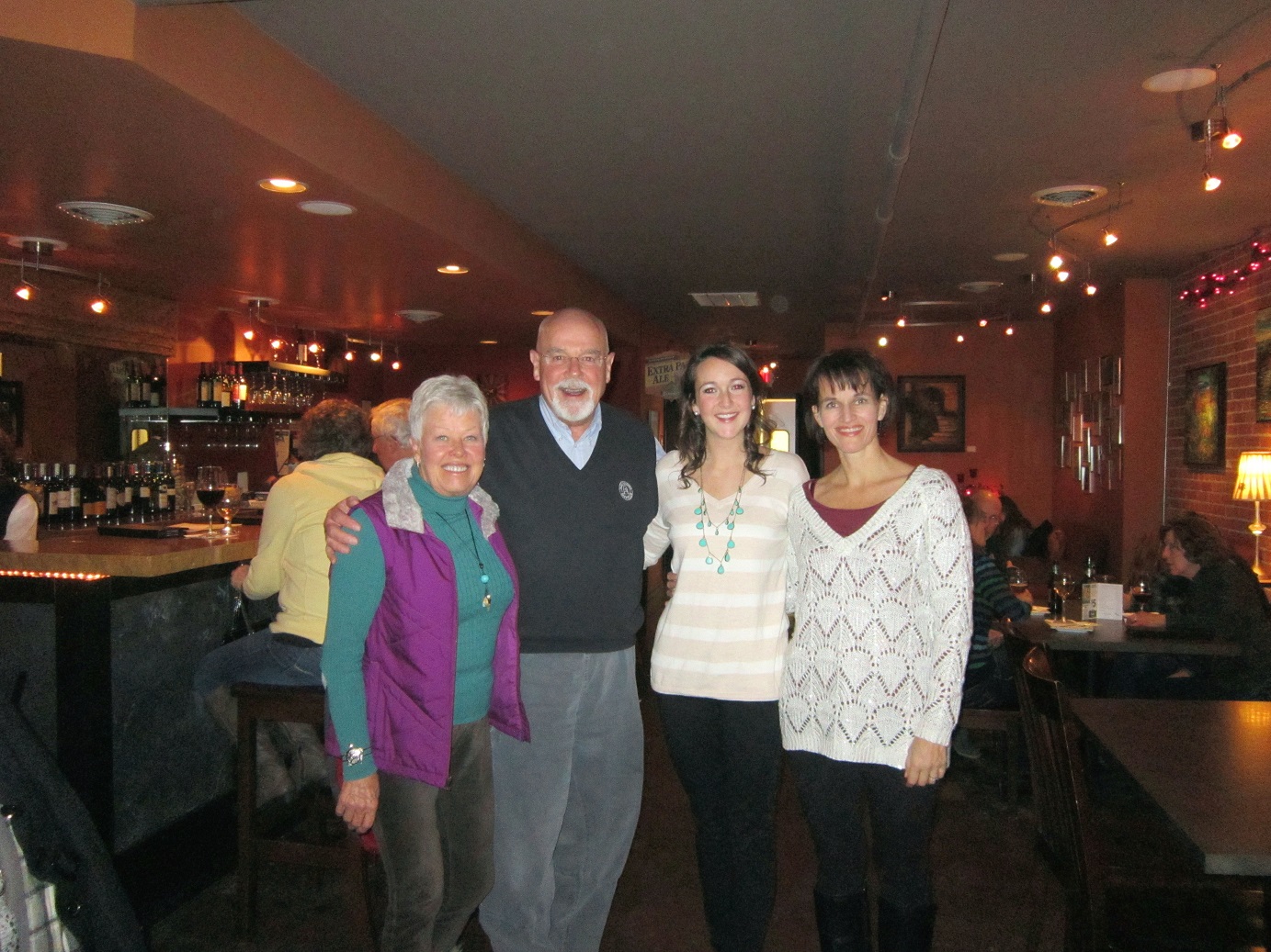 Then we thought we were meeting Jo Colvin, past reporter for the Echo Press, at SAWA that evening. She wasn’t there? The supervisor posted a “Jo, where R U?” on Facebook, but we thought maybe she didn’t come up from The Cities because of the weather. Then about 9:00 she came in with daughter Brianna and friends saying she was going to meet us Saturday night (I had the wrong day, of course). But it worked out. Jo had been at Bella’s celebrating Brianna’s birthday with her friends, saw our post, and walked around the corner. And because of the weather, she was going back to The Cities on Saturday: