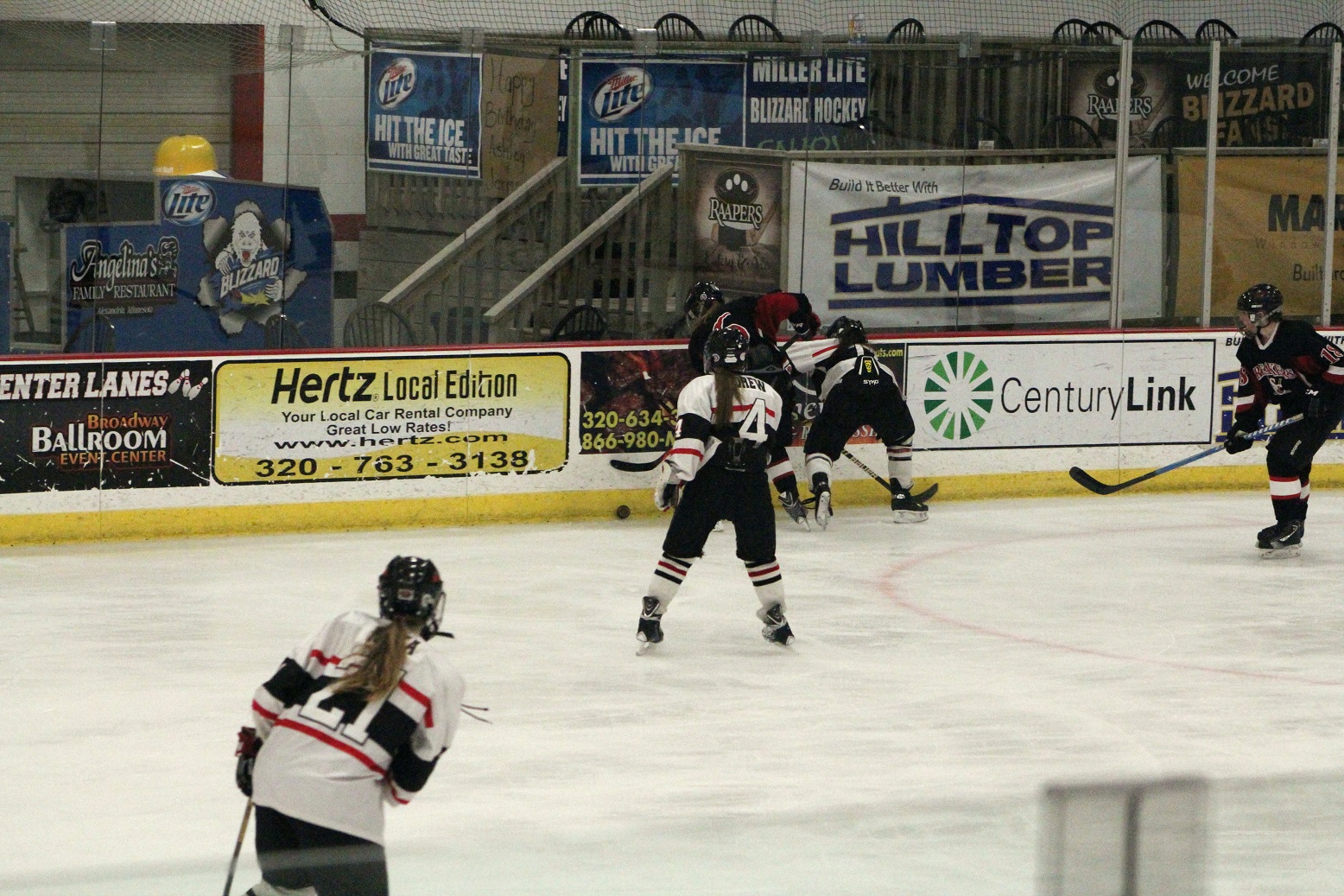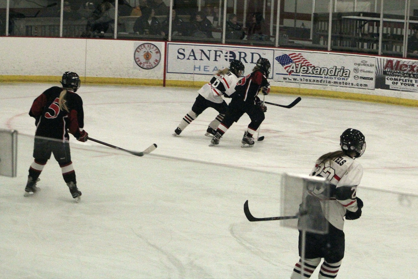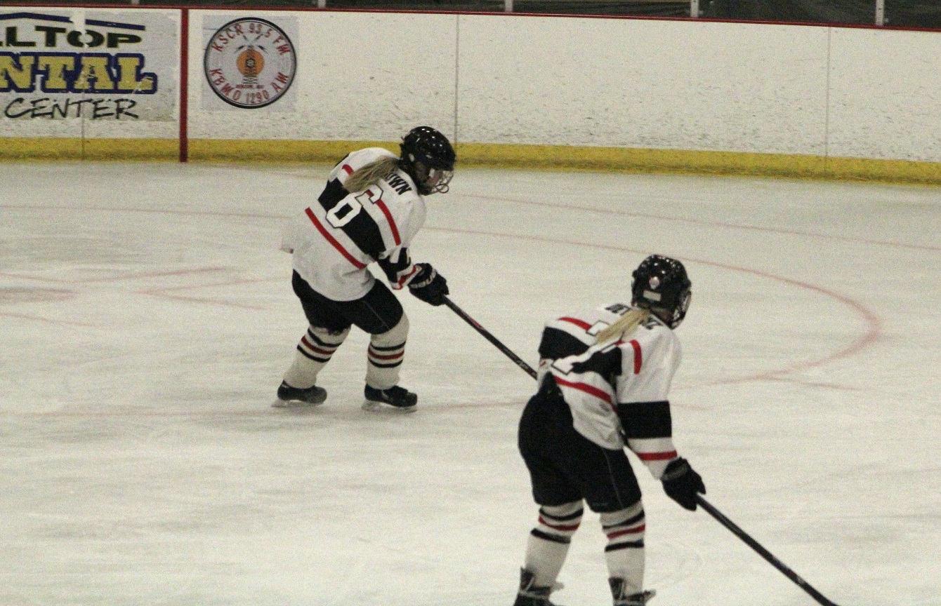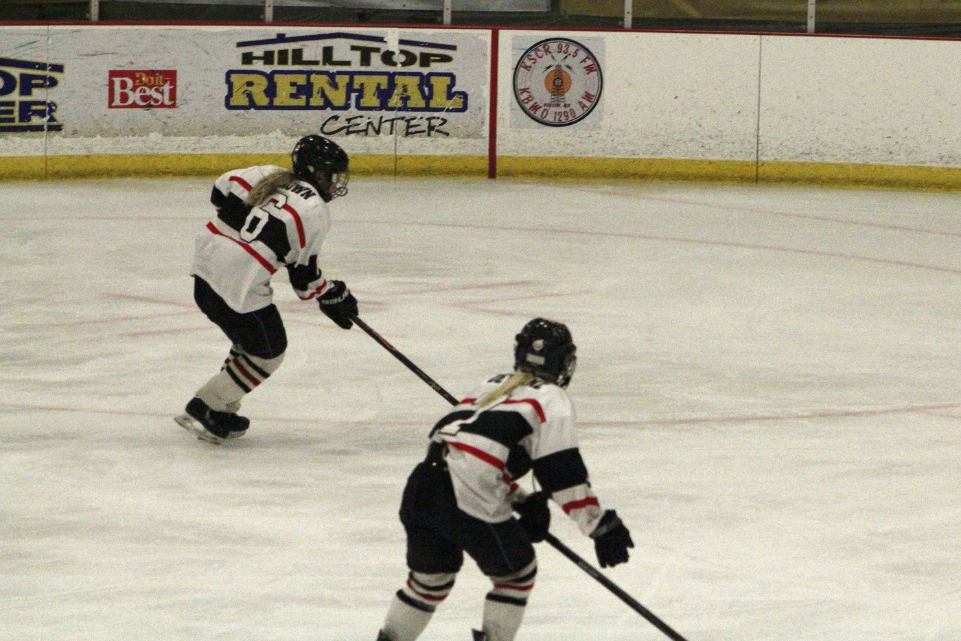 [I don’t recall how it happened, but with the Icebreakers’ constant forechecking we would occasionally have a break out. Here Mel and Kaila are in all alone in the St. Cloud zone. We could see this happening from the beginning so I put the ole Canon on rapid fire . . .]