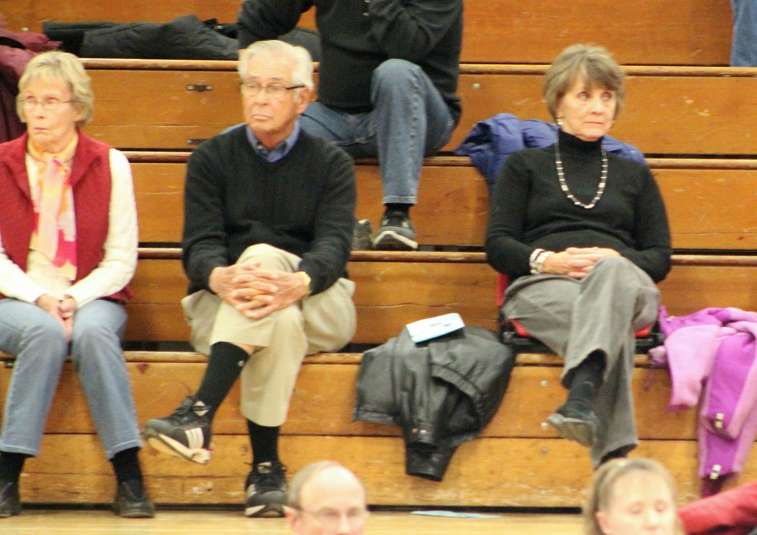 [As I advised our e-mail extended family, we thought the game started at 7:30, as basketball games had all season. Well, it started at 7:00. We missed the opening tap and had people craning their necks to see around us as we staggered up the bleachers in search of seating. This was a big match-up all game – Karly against the Lakers’ taller and impressive point guard.]