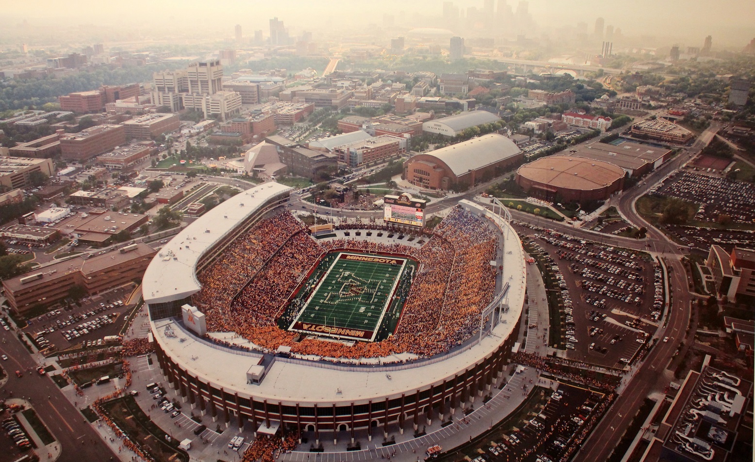 [A quick trip up in a hot air balloon for a shot of “The Bank.” The open end faces the Minneapolis skyline. The open end also faces Mariucci Arena (hockey) on the right and “The Barn” (basketball) on the left, just across the street.]