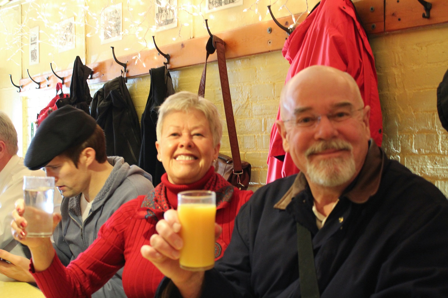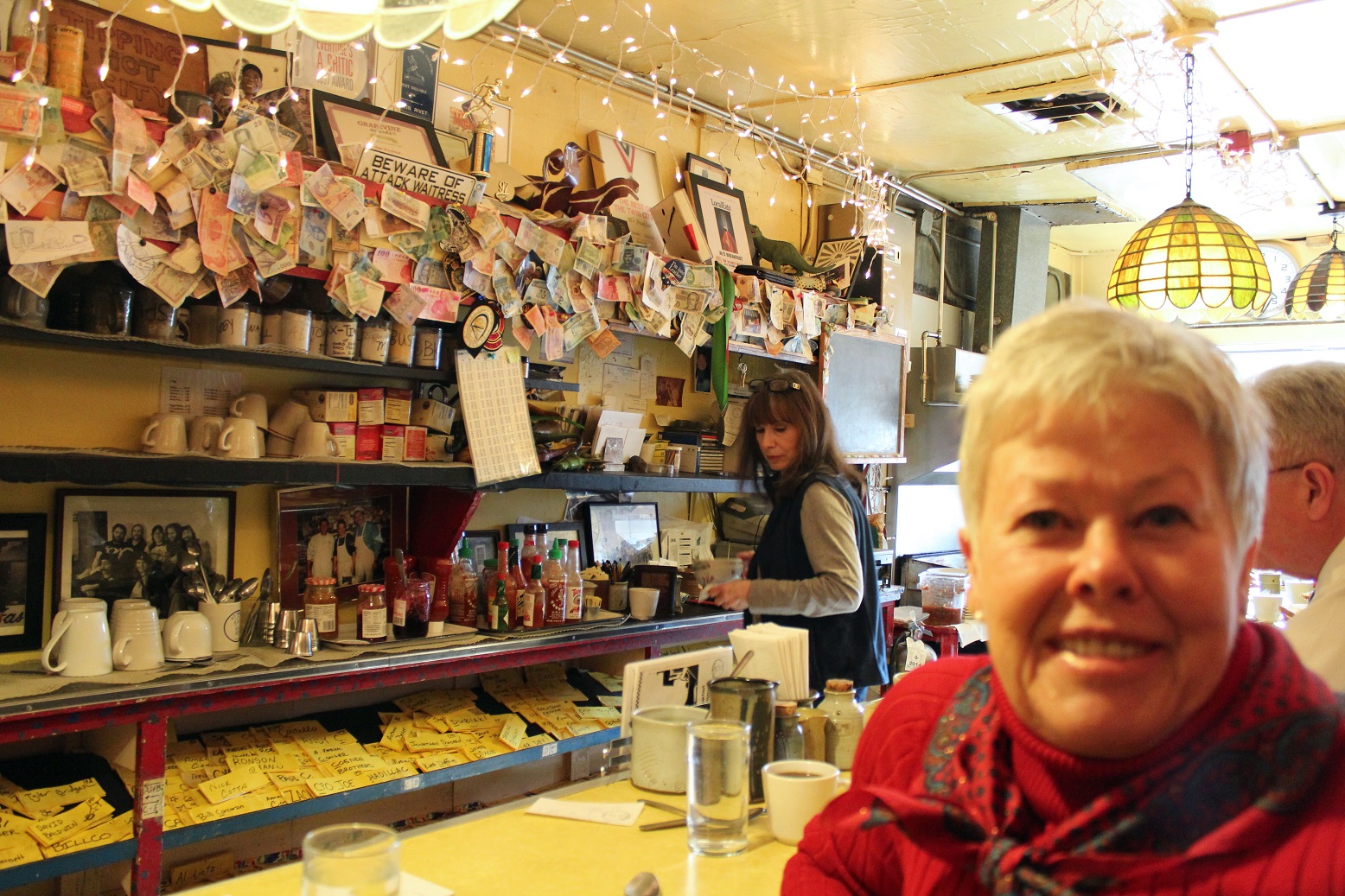[We ended up at the iconic and historic Al’s Breakfast in Dinkytown. No Wifi, but who cares. The place is about 10-feet wide, about 12 stools at a counter, eat and get out, there are people standing in the aisle behind you patiently waiting for a “seat at the table.” That’s our server behind the supervisor – because there isn’t room for any more! She took the following photo of us as well as delivering our humongous (didn’t eat for the rest of the day) omelets.]