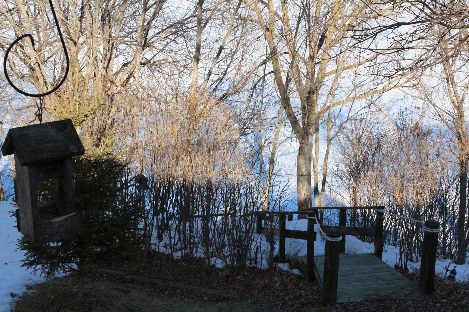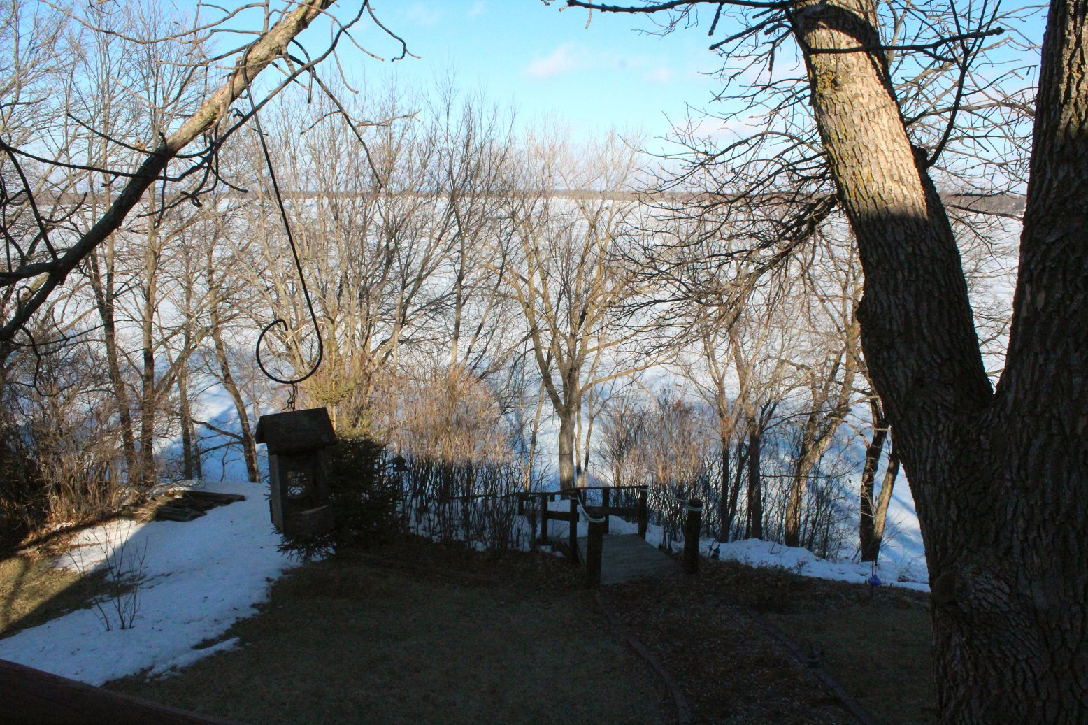 [Despite some big time melting, the snow is still as high as the railing on our steps down to the lake.]
