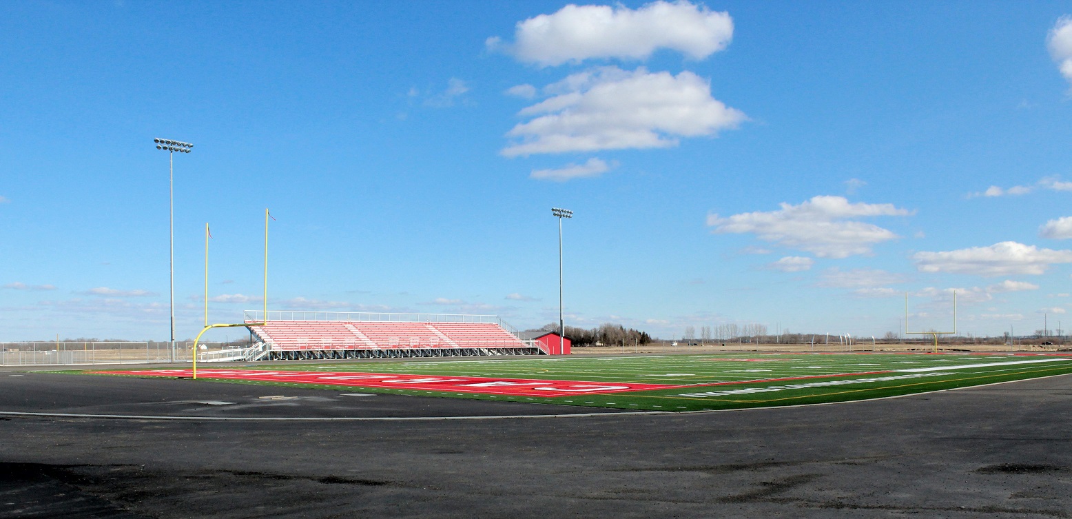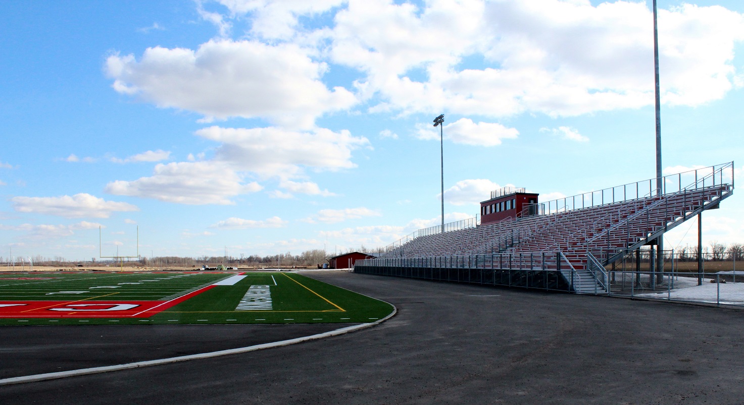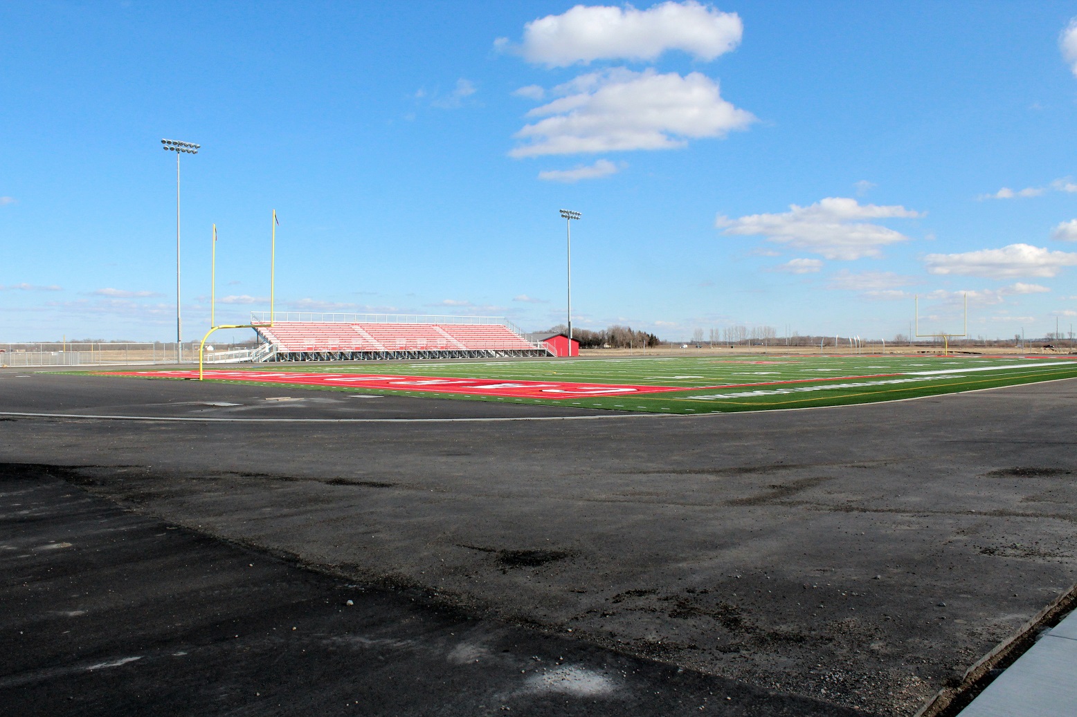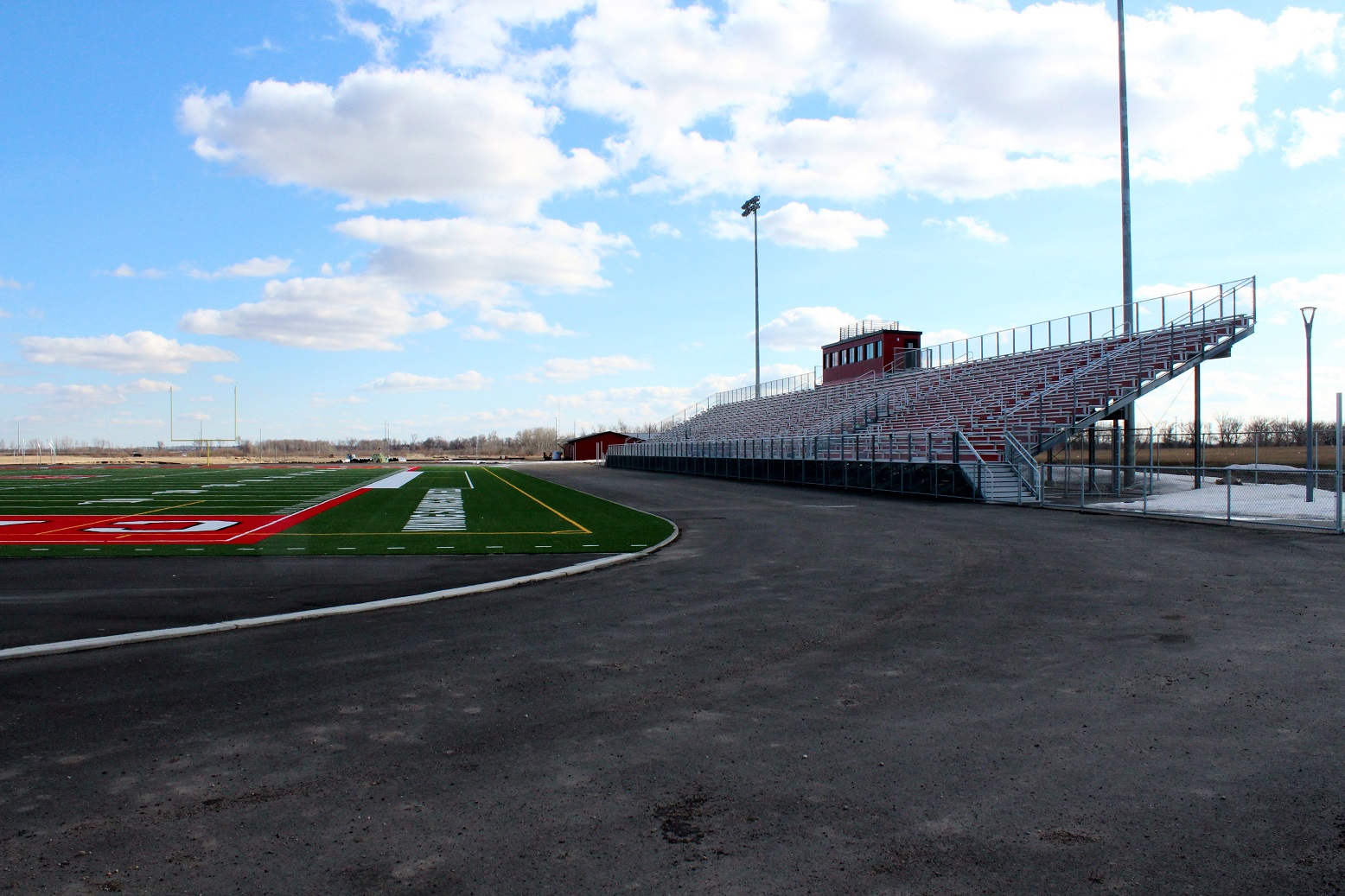 [Puts places like the Big House to shame. Artificial turf, too. Those are the visitors stands – so they have to look into the setting sun. 😉 ]