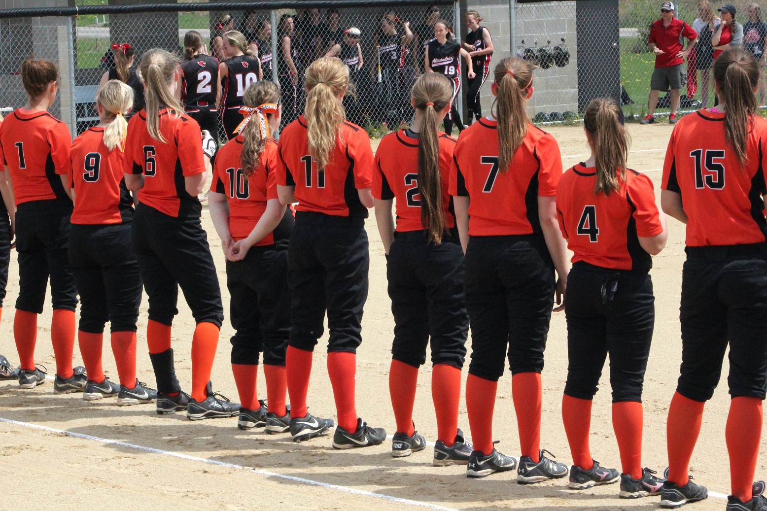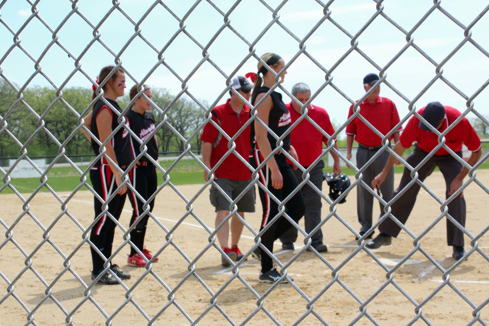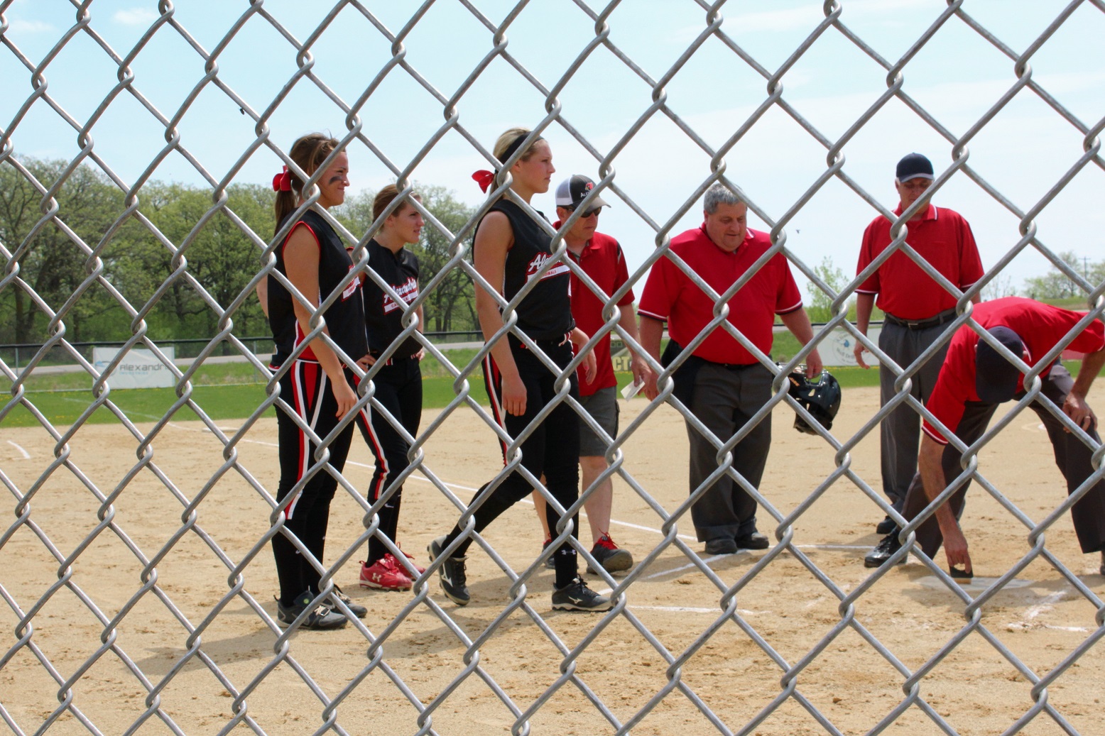 [Team captains Anna Lee, Sarah Bruzek, and Emily Kuennen meet the game officials at home plate for the ceremonial coin toss . . . ]