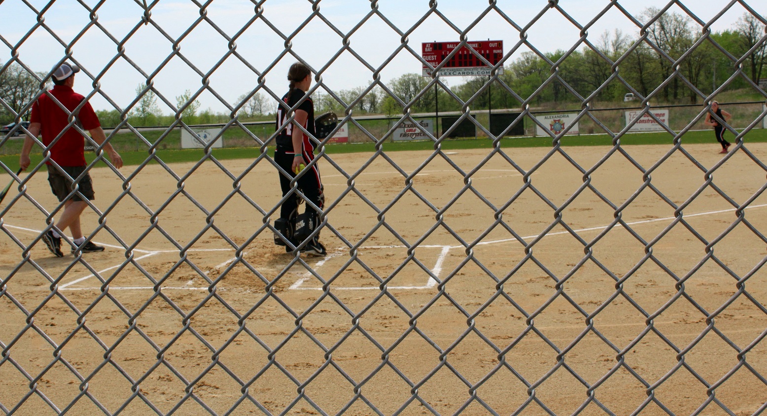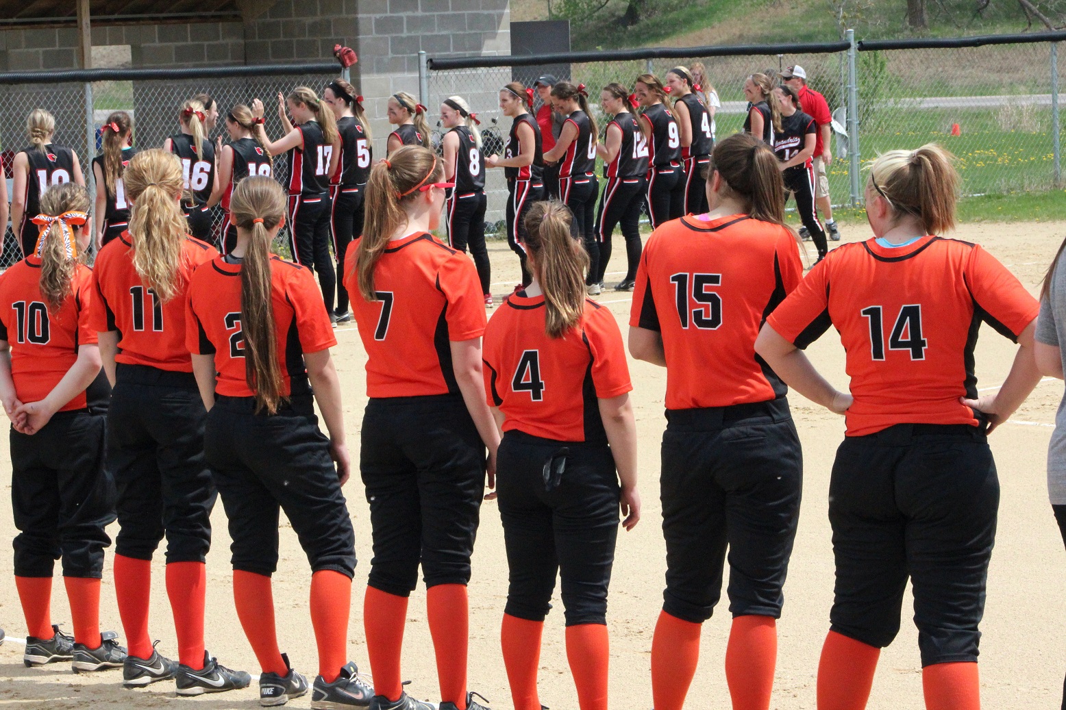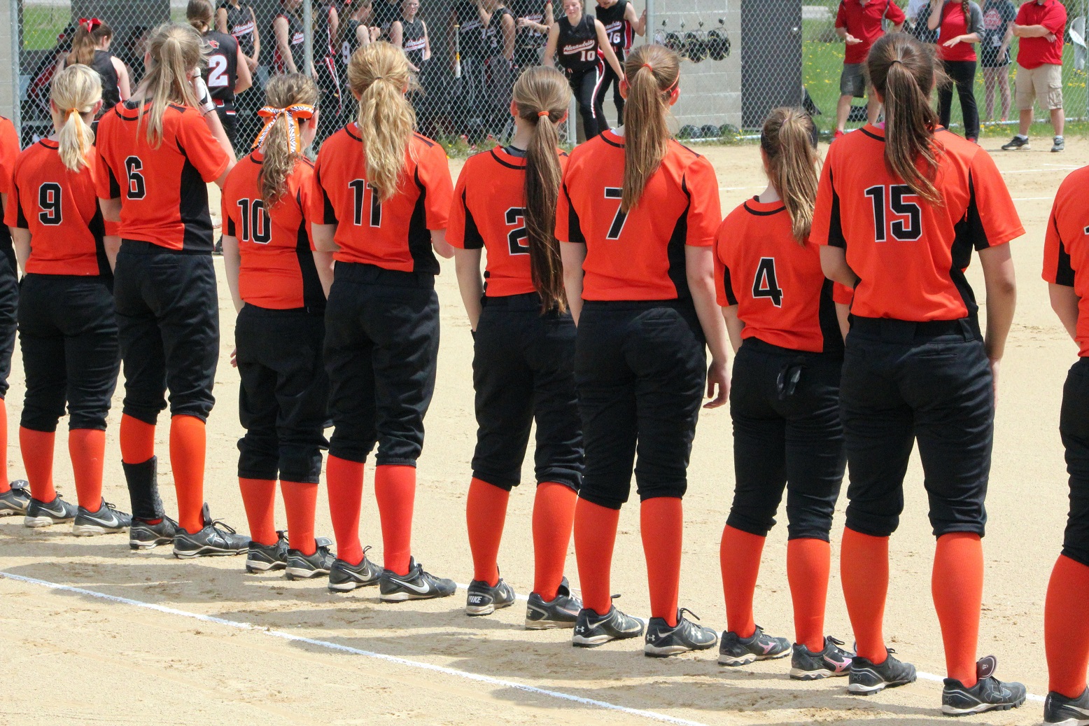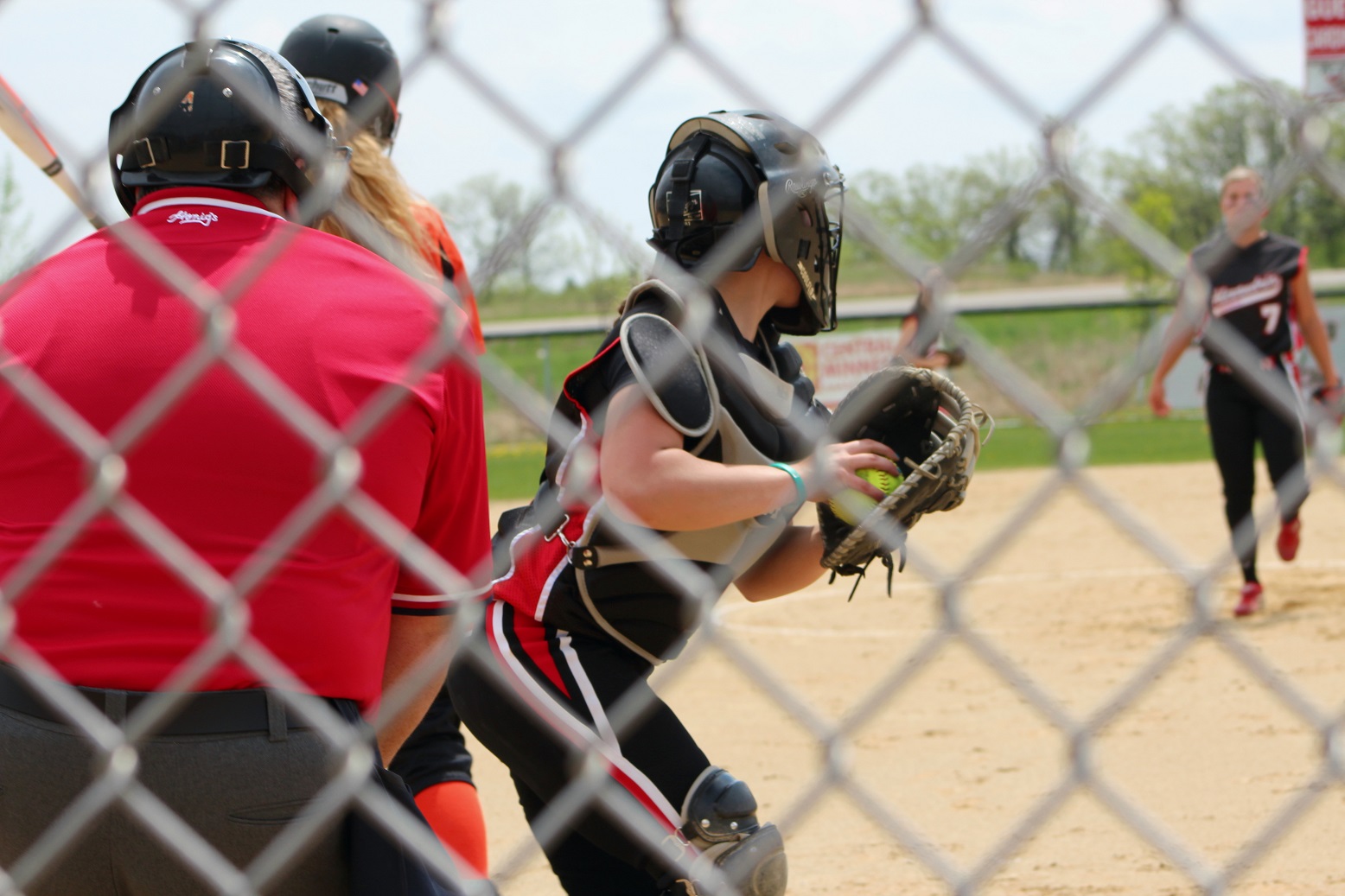 [Team captains Anna Lee, Sarah Bruzek, and Emily Kuennen meet the game officials at home plate for the ceremonial coin toss . . . ]