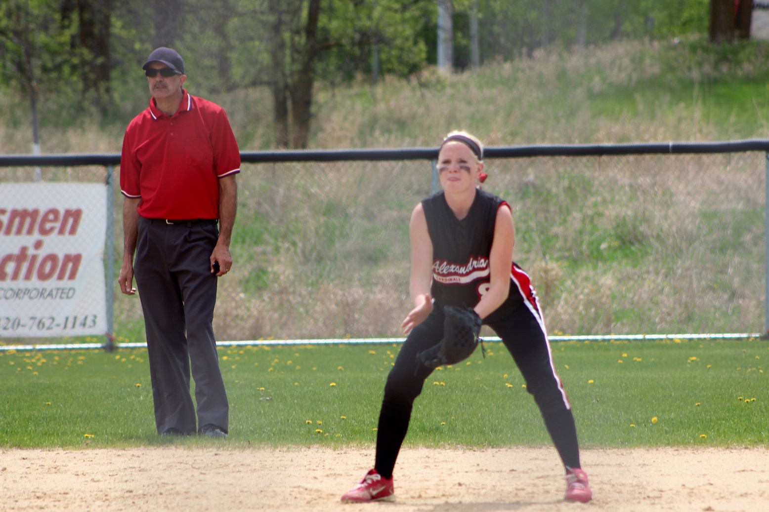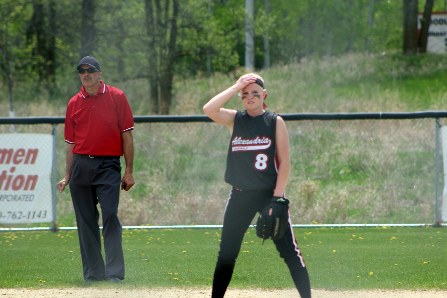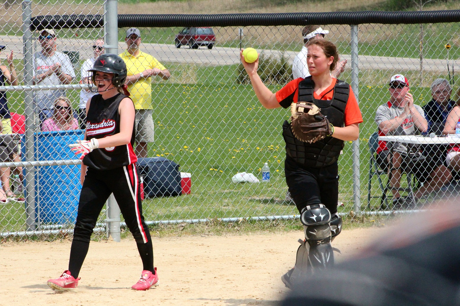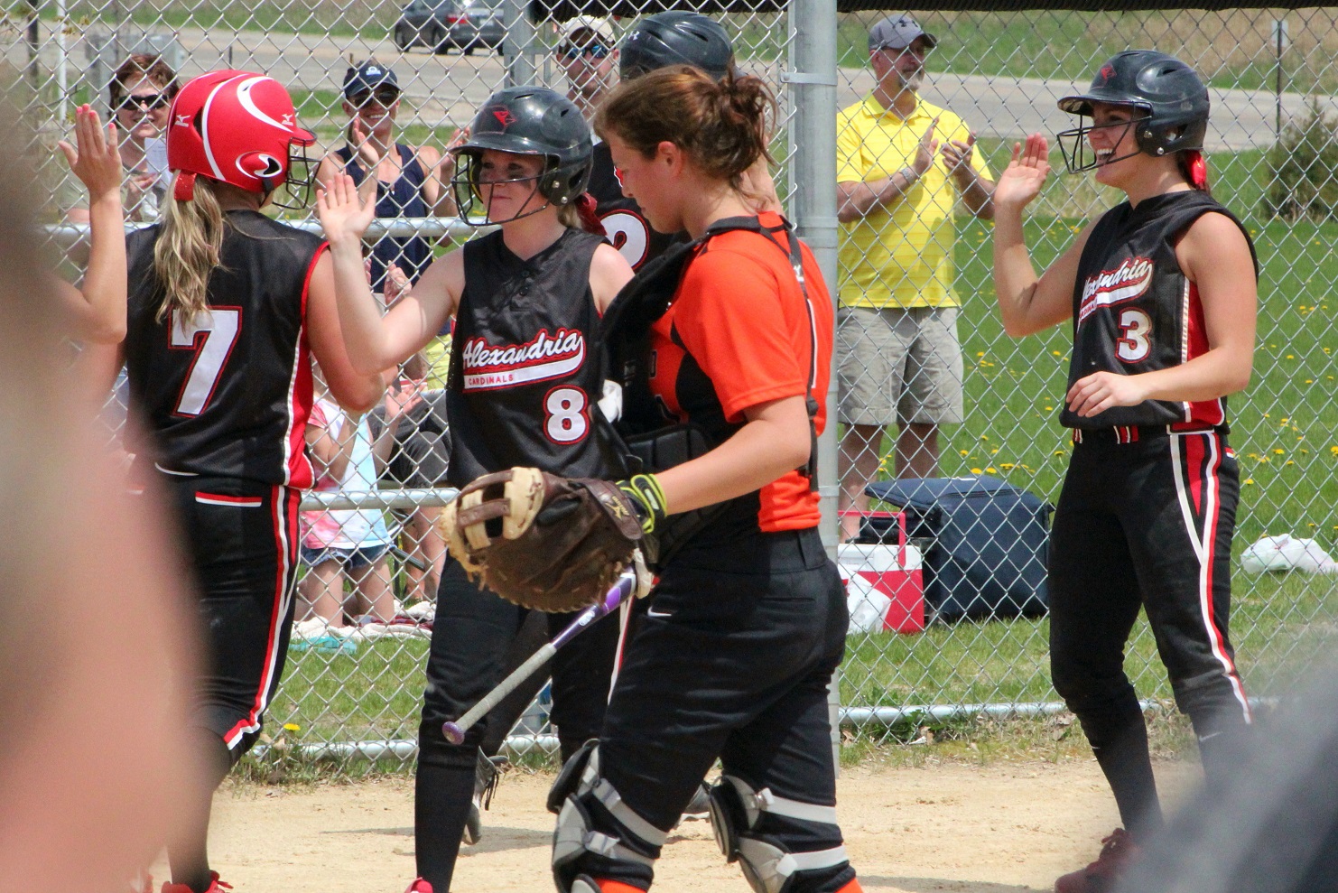 The super and I did what all red-blooded Americans do on Memorial Day – we went to a section tournament softball game!! We almost drowned in a pool of our own perspiration – well, me in sweat, the super in glisten – and likely have 3rd-degree sunburns. The noon-time start game was played in hot, humid, sunny weather – something we aren’t quite used to around these here parts! Rain clouds threatened in all directions, but didn’t get here until as I do my report. Our Cards prevailed over Moorhead 9 – 1 as senior pitcher Taylor Ellingson (7) had a great game, both as a pitcher and as a hitter from the lead-off spot. She is just a terrific all-around athlete who is both strong and fast . . . I know she had as a minimum a walk, a triple, and a 3-run home (in the bottom of the 4th that put the game away). She is fast enough that I thought the triple would be a double but she never slowed, and the same with the homer that was a line drive down the leftfield line. I don’t think she ever had any intention to stop running until she got to home plate – I was so dumbfounded I didn’t react fast enough with the camera. Oh, and there was a representative there from Le Homme Dieu View Townhomes, but it wasn’t “Weakie-d”-out. Sitting behind the super in an unfortunately Spud-colored shirt. [Yes, the insert is the softball playing me back in the day when I was almost as strong and almost as fast as Taylor.]