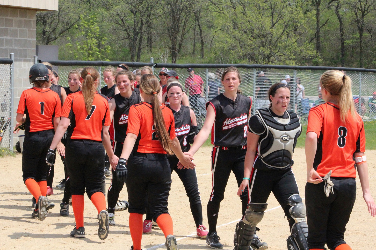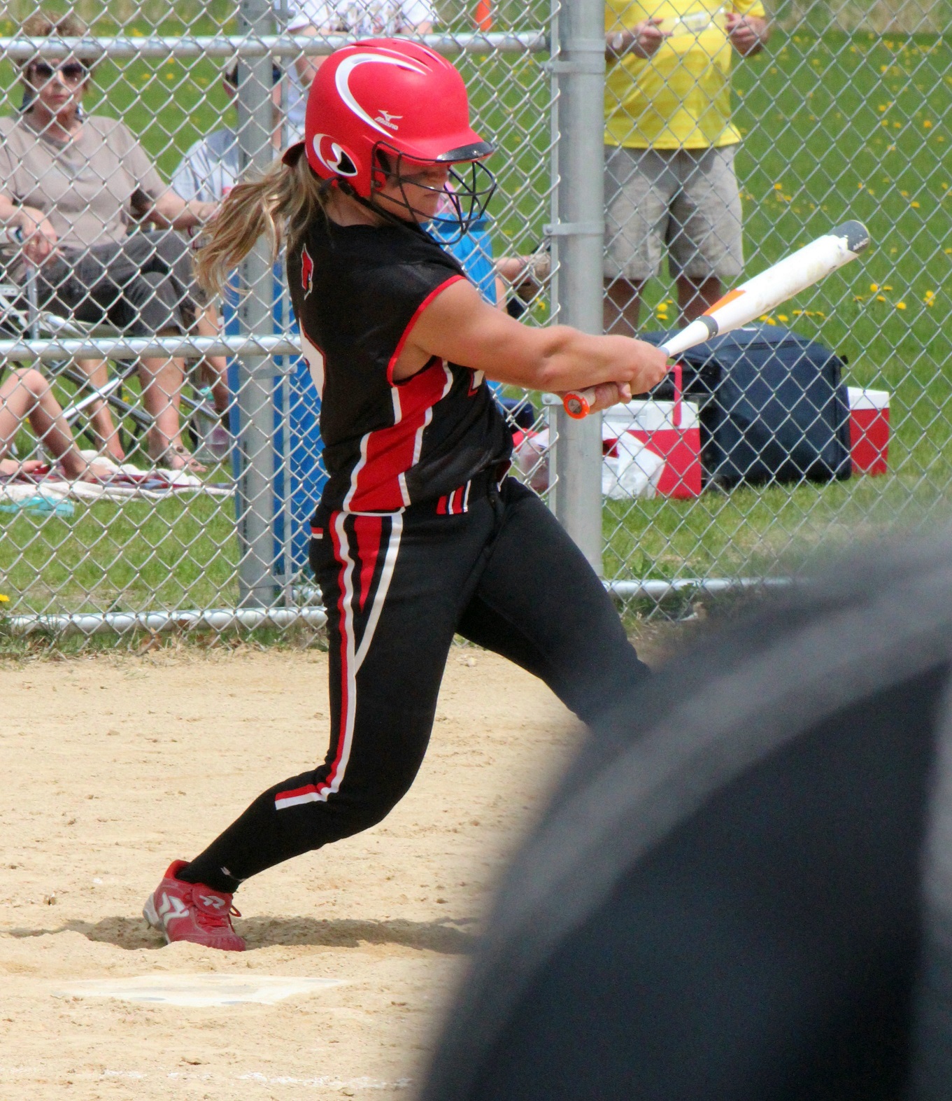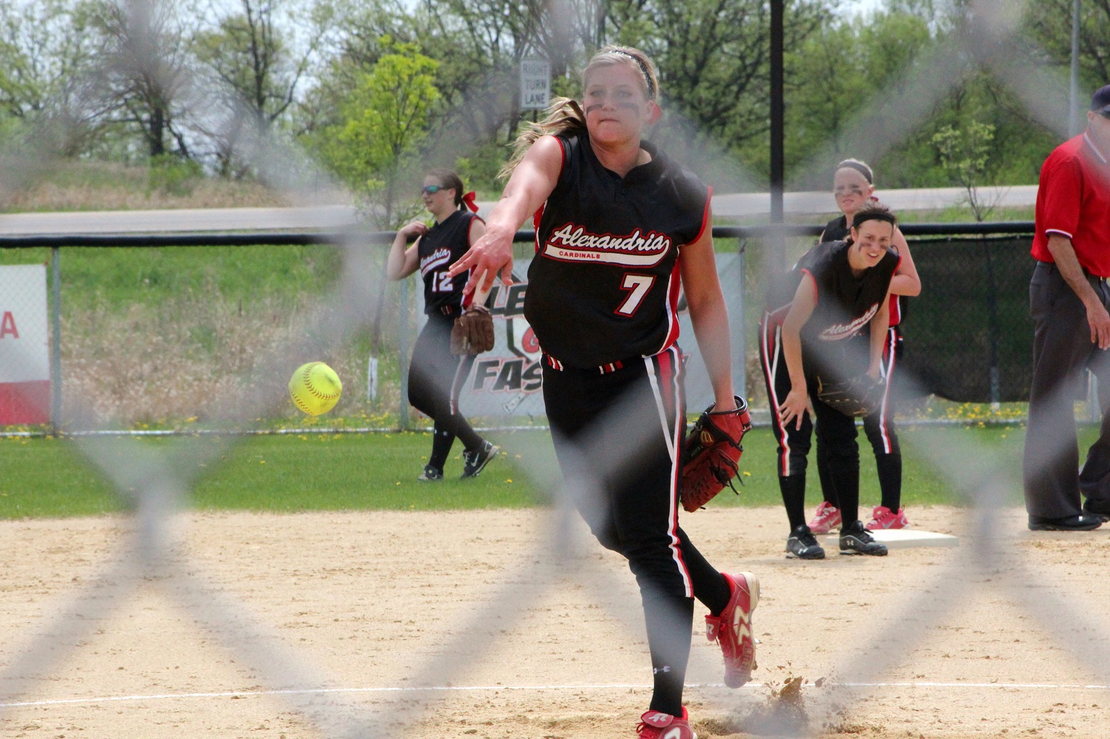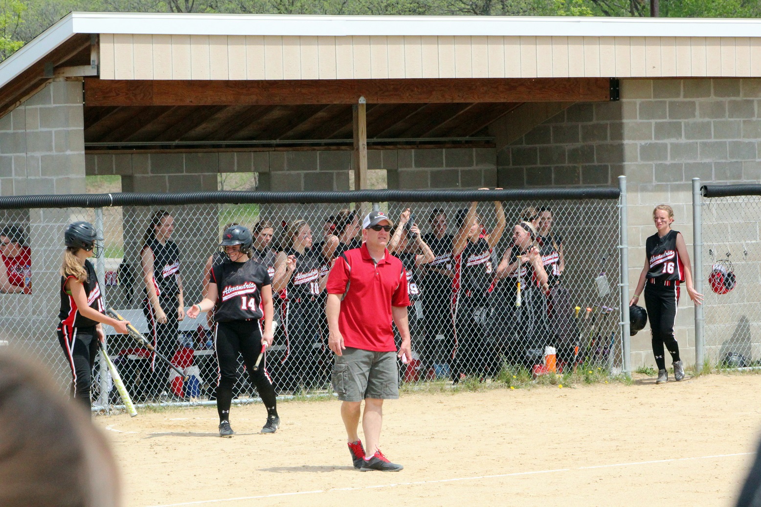 The super and I did what all red-blooded Americans do on Memorial Day – we went to a section tournament softball game!! We almost drowned in a pool of our own perspiration – well, me in sweat, the super in glisten – and likely have 3rd-degree sunburns. The noon-time start game was played in hot, humid, sunny weather – something we aren’t quite used to around these here parts! Rain clouds threatened in all directions, but didn’t get here until as I do my report. Our Cards prevailed over Moorhead 9 – 1 as senior pitcher Taylor Ellingson (7) had a great game, both as a pitcher and as a hitter from the lead-off spot. She is just a terrific all-around athlete who is both strong and fast . . . I know she had as a minimum a walk, a triple, and a 3-run home (in the bottom of the 4th that put the game away). She is fast enough that I thought the triple would be a double but she never slowed, and the same with the homer that was a line drive down the leftfield line. I don’t think she ever had any intention to stop running until she got to home plate – I was so dumbfounded I didn’t react fast enough with the camera. Oh, and there was a representative there from Le Homme Dieu View Townhomes, but it wasn’t “Weakie-d”-out. Sitting behind the super in an unfortunately Spud-colored shirt. [Yes, the insert is the softball playing me back in the day when I was almost as strong and almost as fast as Taylor.]