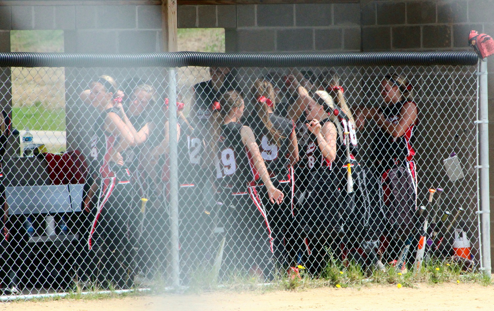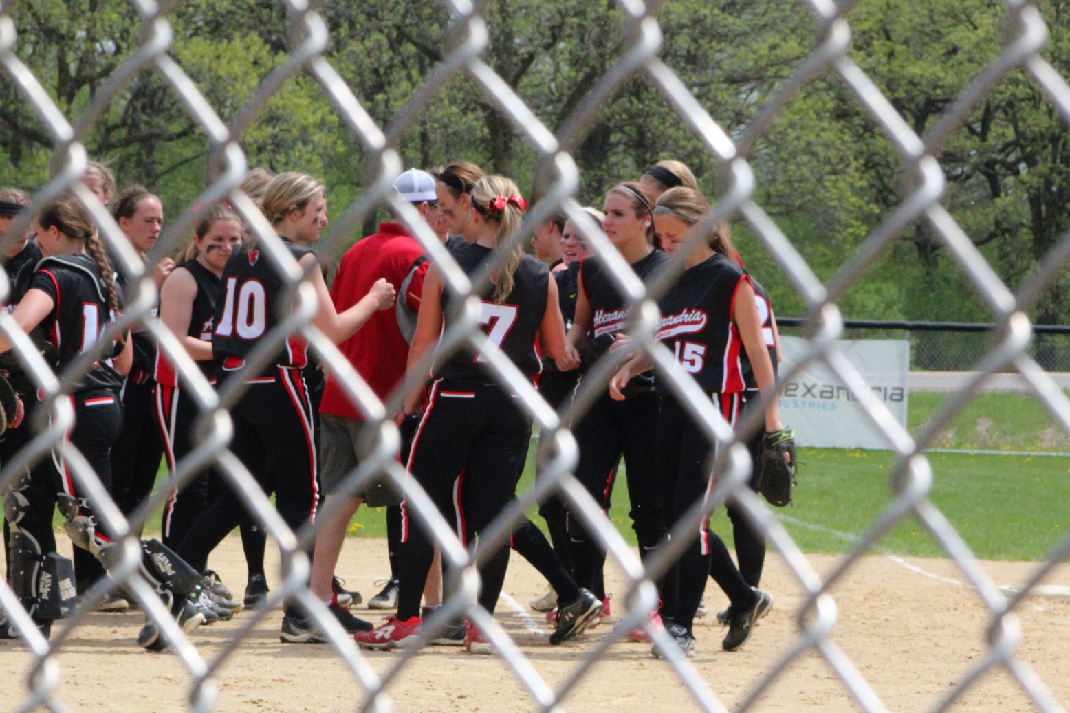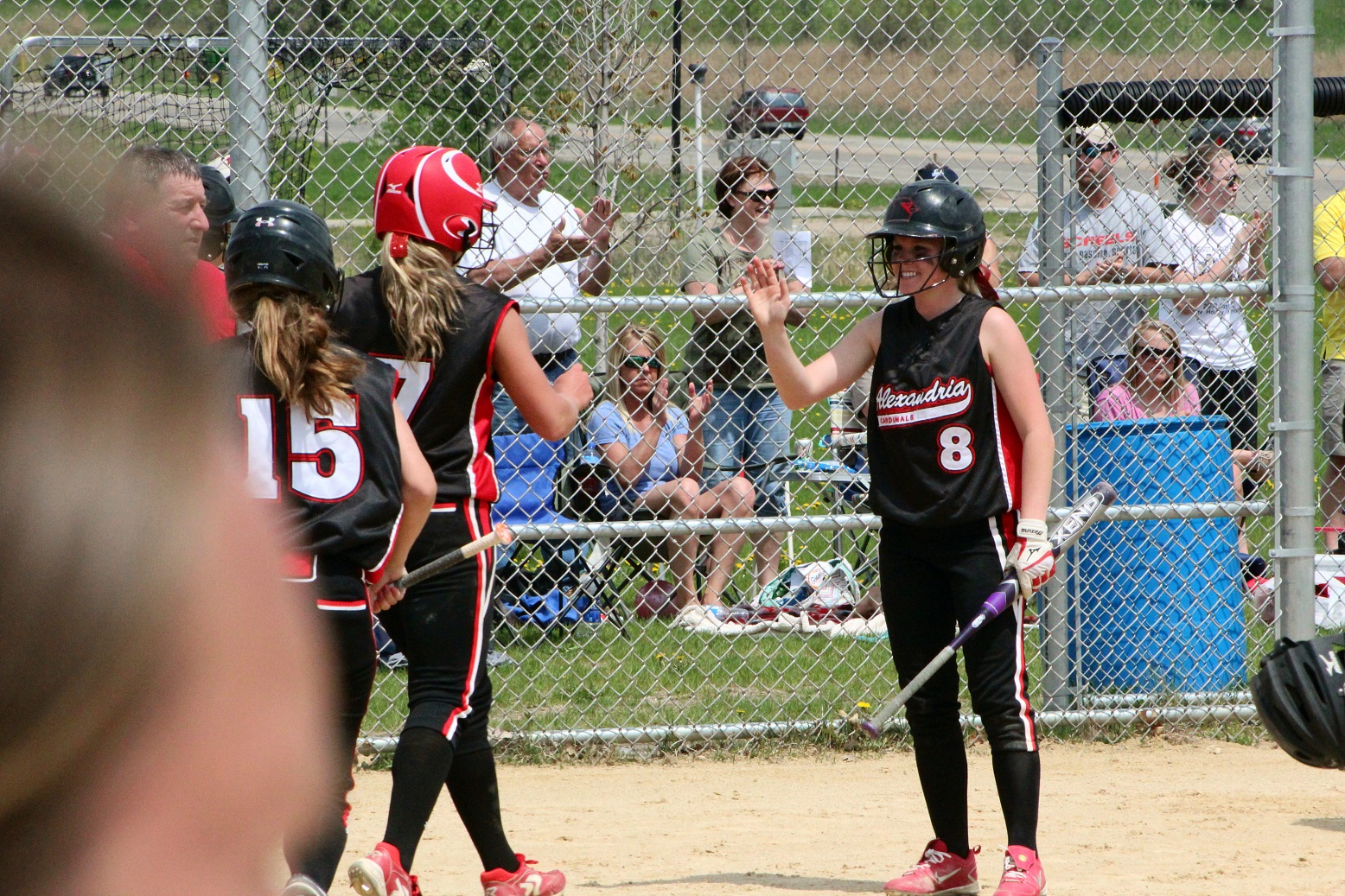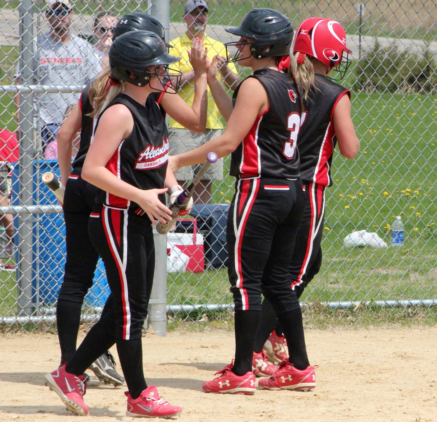[There’s Taylor in the red helmet getting congrats from her teammates.]